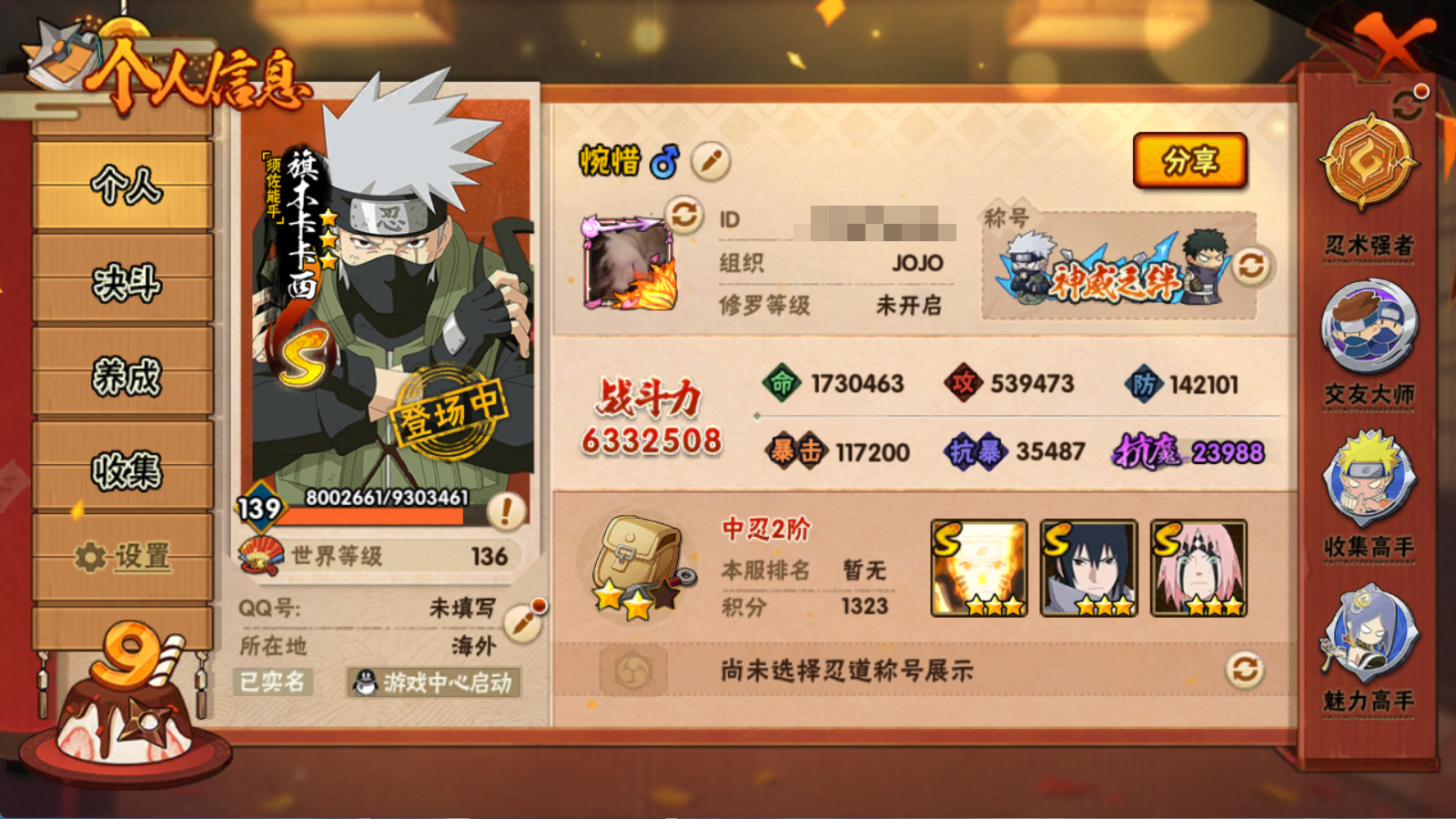 火影忍者【安卓QQ】633W战力破面创斑紫狗15S+骨架青水22A+双百战战力6
