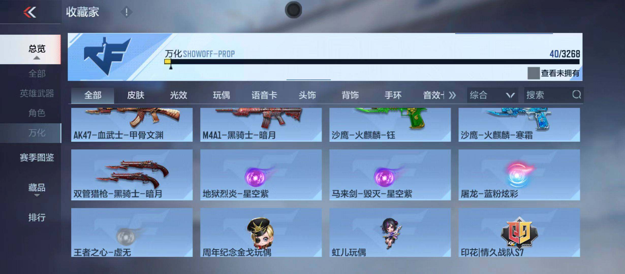 【英雄武器】:AK47-机械迷城,AK47-猩红传说,AK47-血武士,AK47-华夏传说,AK47-木兰,AK47-雷霆,AK47-谜城烟火,M4A1-黑骑士,M4A1-海骑士,M4A1-运输船,AK12-天启,QBZ03-金色蔷薇*2,HK417-炎龙铠甲,AWM-天使,AWM-大湾溢彩,巴雷特-毁