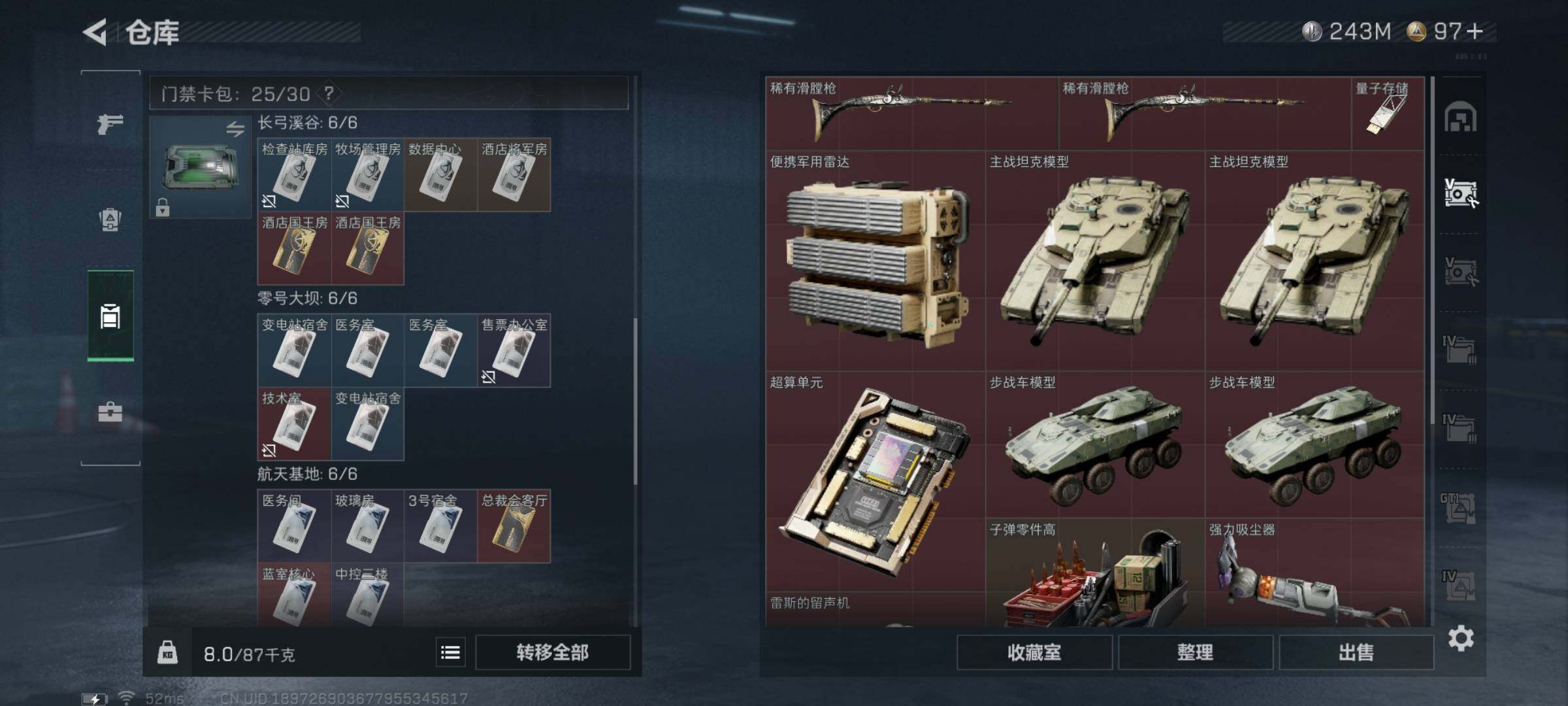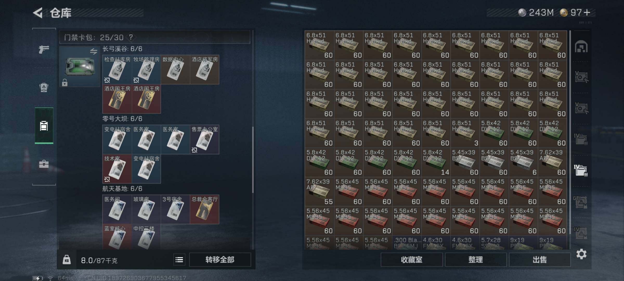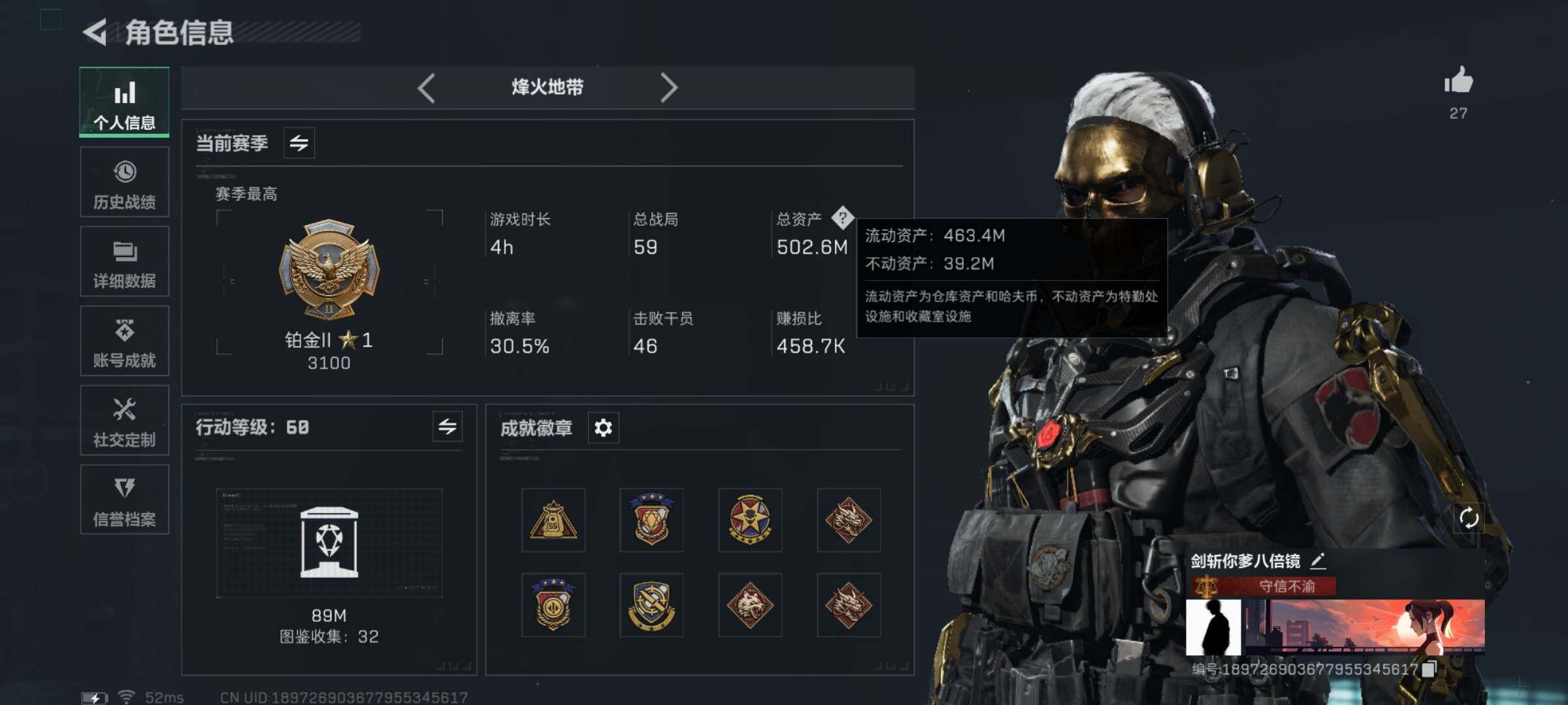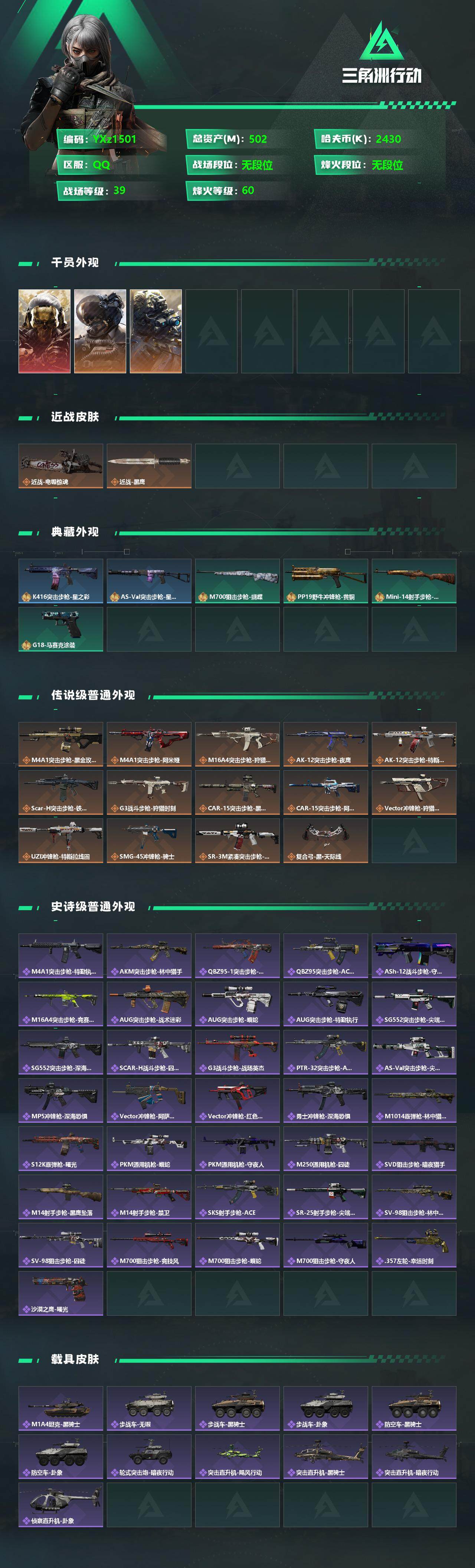 【高额资产账号300M,猛攻必备,蚀金玫瑰-刀皮-电锯惊魂】【无二次】YXz1501-特勤处:仓库8级/训练中心7级/靶场7级-总资产502m-哈夫币243m-烽火等级:60级