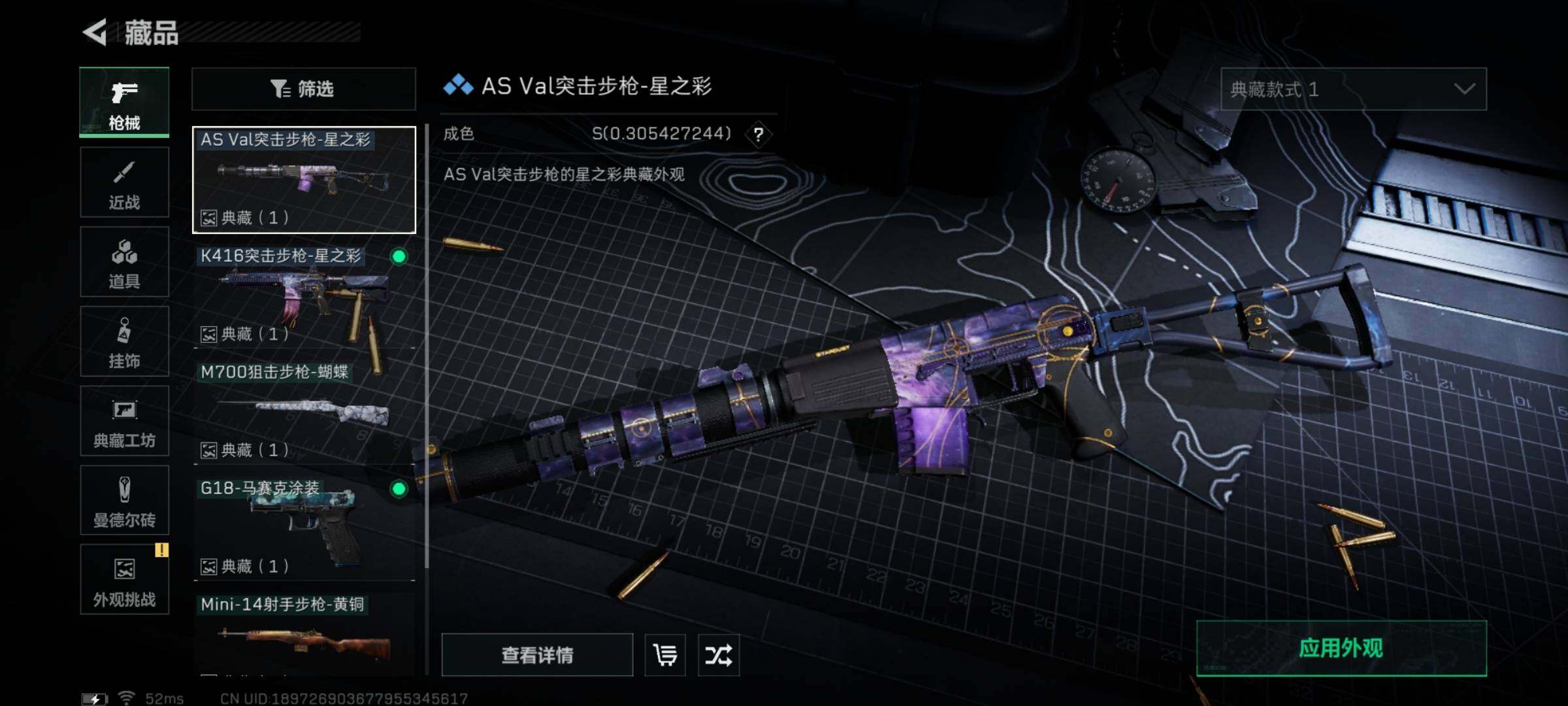 【典藏外观】:K416突击步枪-星之彩,As Val突击步枪-星之彩,M700狙击步枪-蝴蝶,PP19野牛冲锋枪-黄铜,