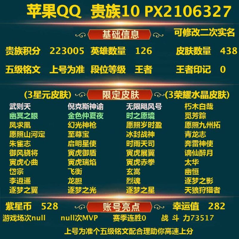 安卓QQ/无双王者/466皮肤/127英雄/5典藏/0珍品无双/1无双/0珍品传说/59传说/156