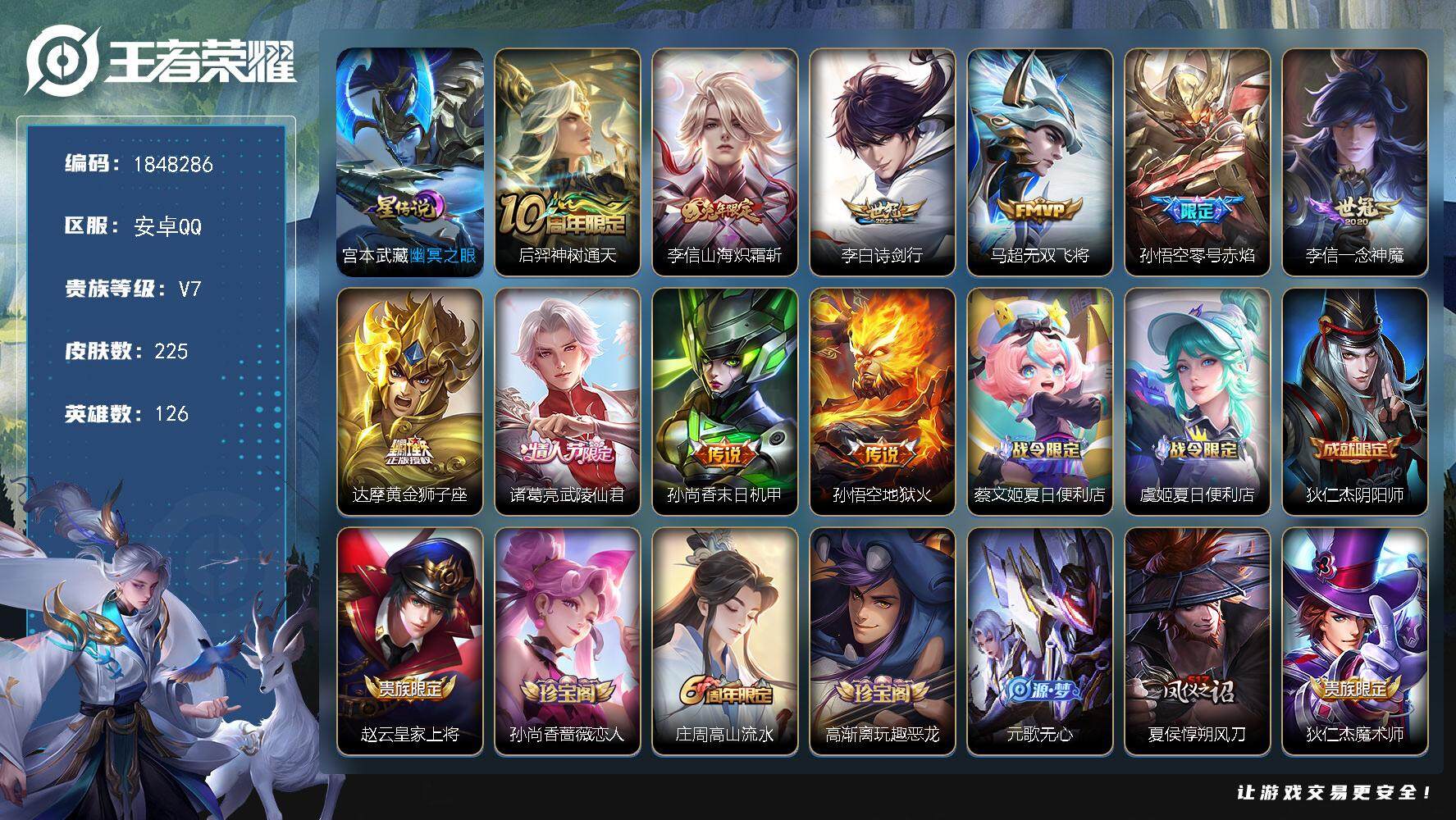 W11269,,可立即换绑无需挂单养号,,铭文满级,,典藏10,,,星传说1,,按键6,,夺宝269,安卓Q-V7-最强王者段位-126英雄-225皮肤-10传说-58史诗