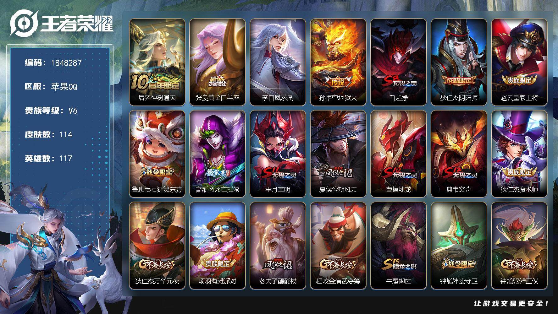 W11270 可立即换绑无需挂单养号 铭文满级 传说4 按键1 夺宝145 苹果Q-V6-最强王者段位-117英雄-114皮肤-4传说-22史诗