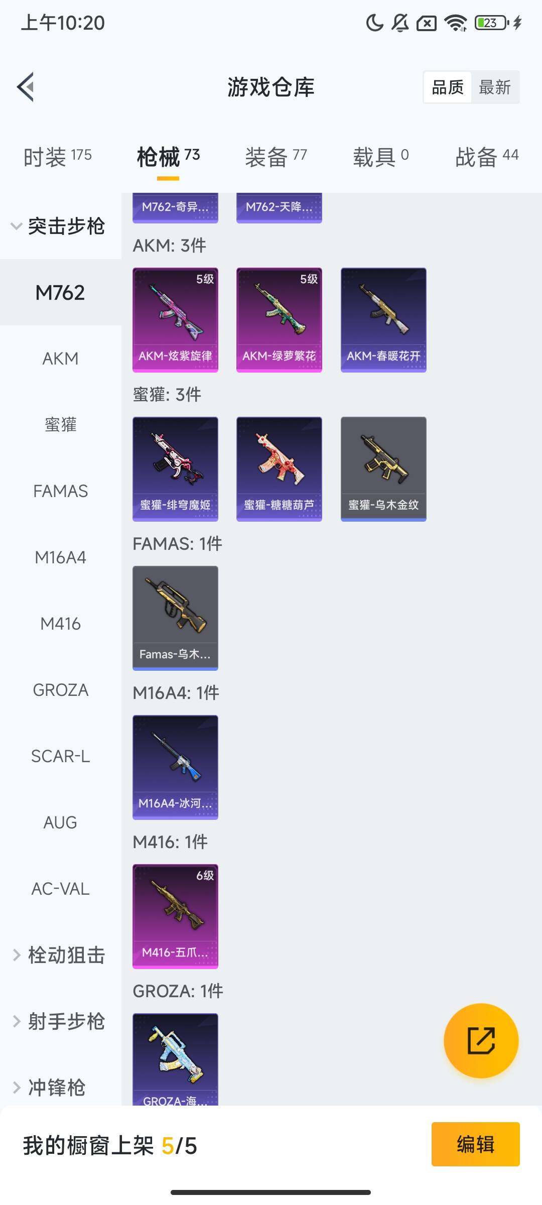 【粉色枪皮等级】:AKM-炫紫旋律(五级),AKM-绿萝繁花(五级),SCAR-L-锦绣绵绵(五级),M416-五爪金龙(六级),Kar98K-巳巳如意(五级),DP-28-豹影疾电(四级)