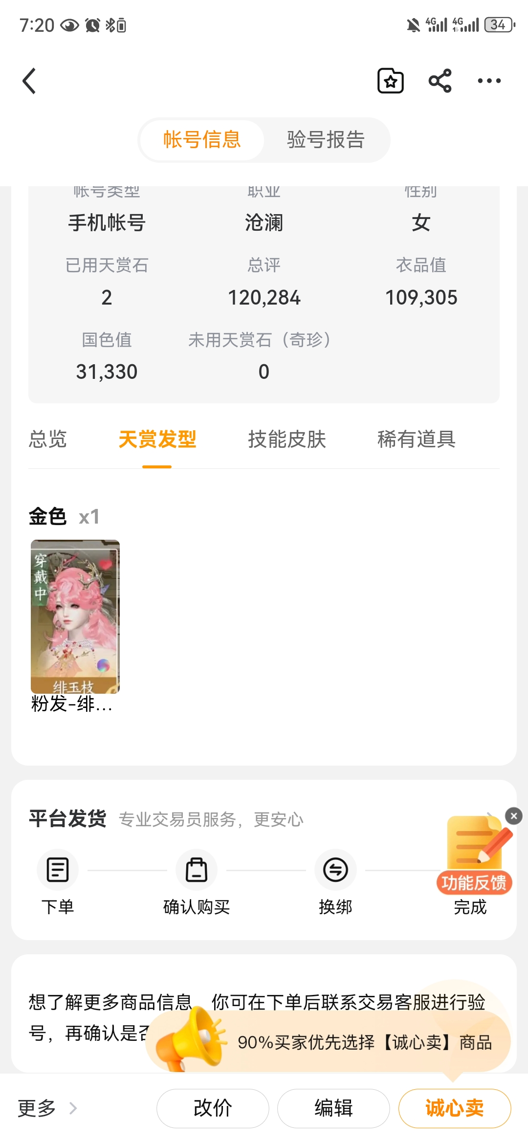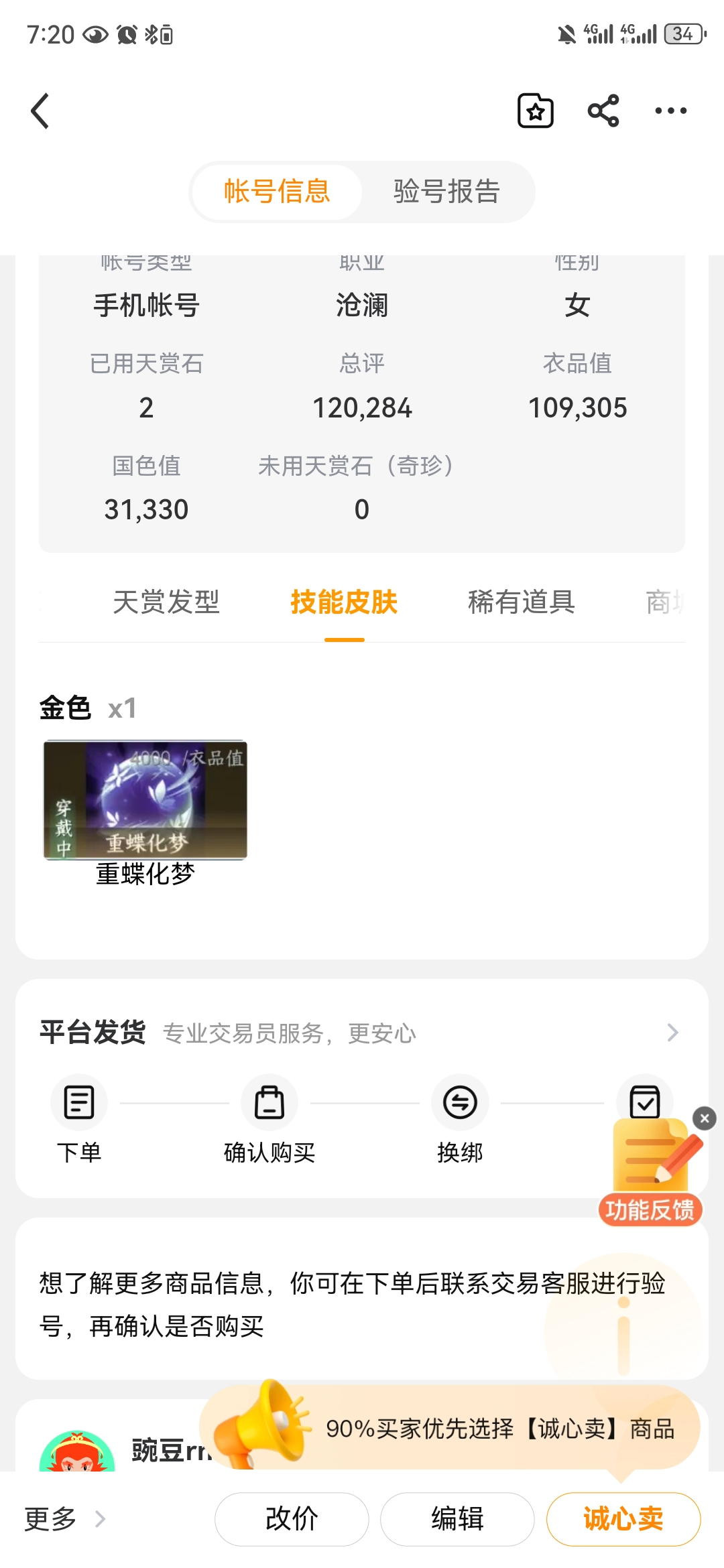 通过App,与卖家商议价格及保险,并向卖家索要账号最新截图,确认后下单购买。