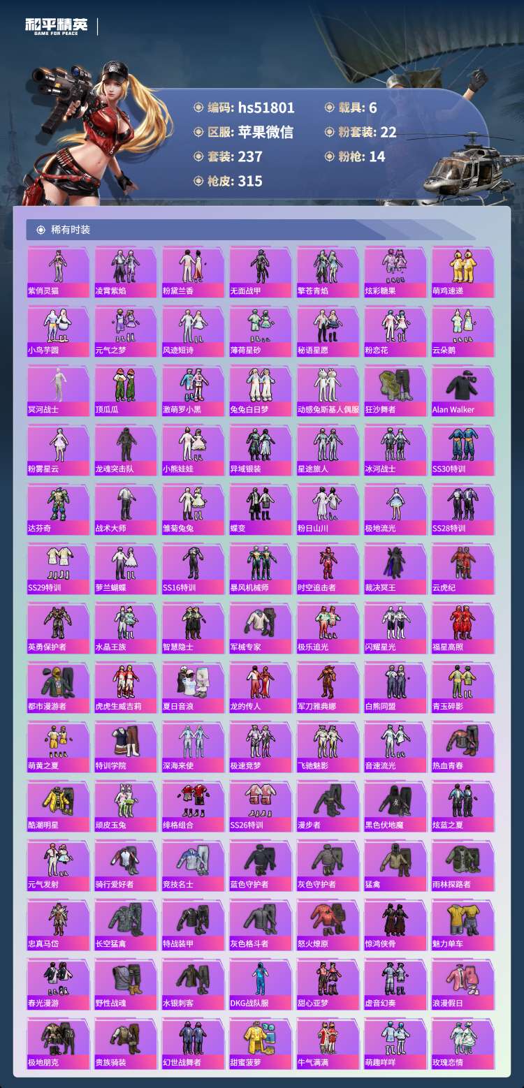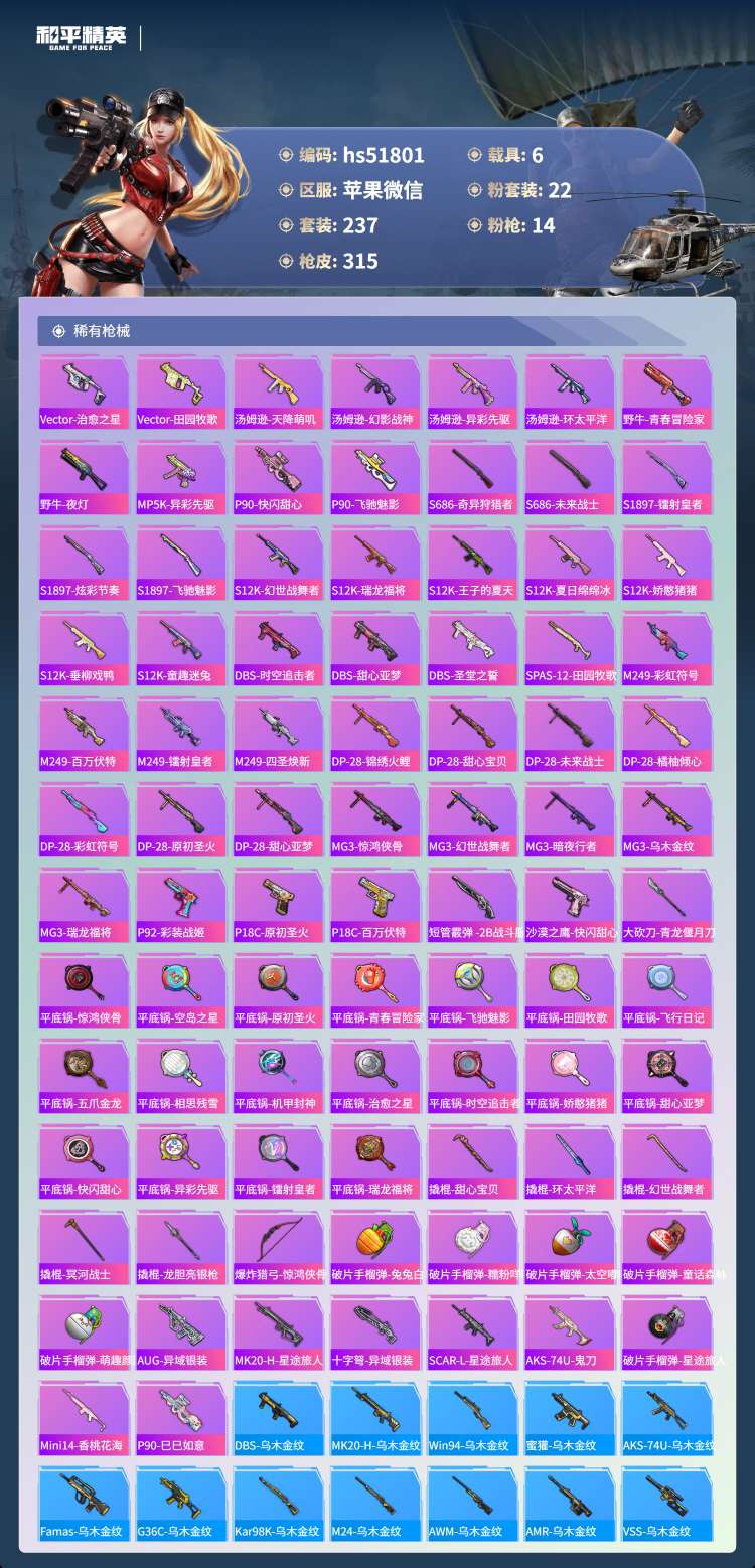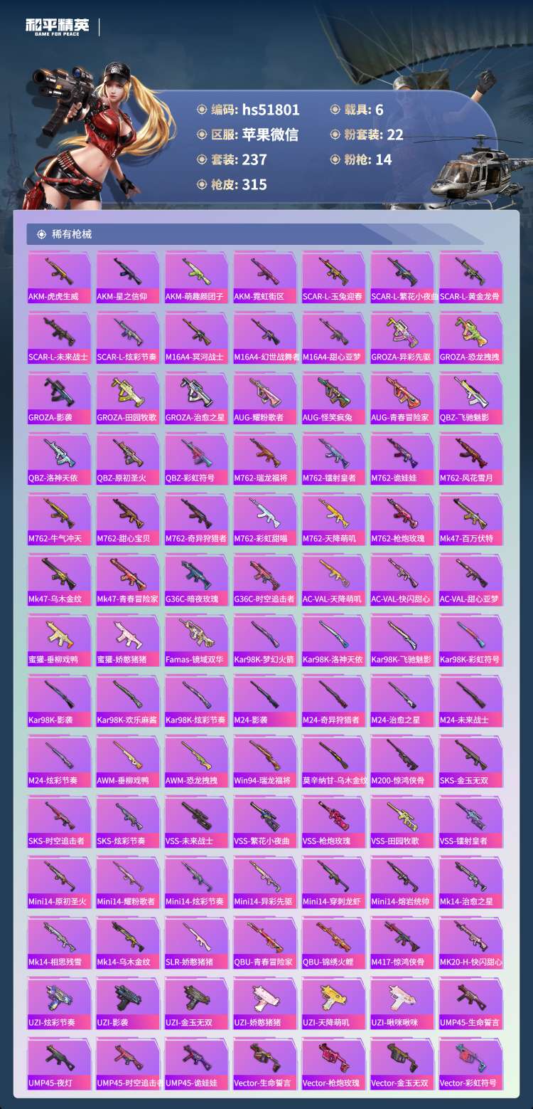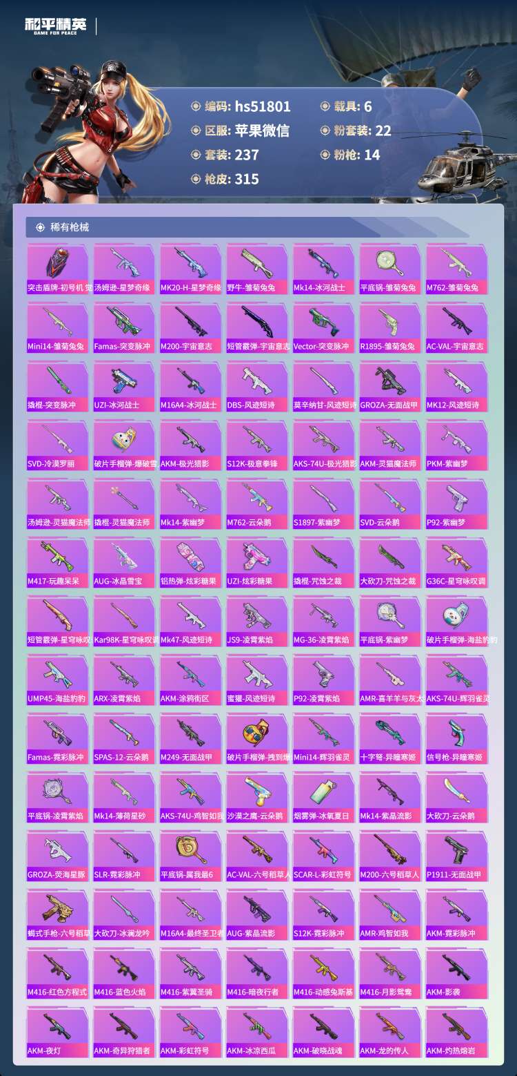 苹果v-20王牌印记-22粉装-14特效枪-6载具-237套装