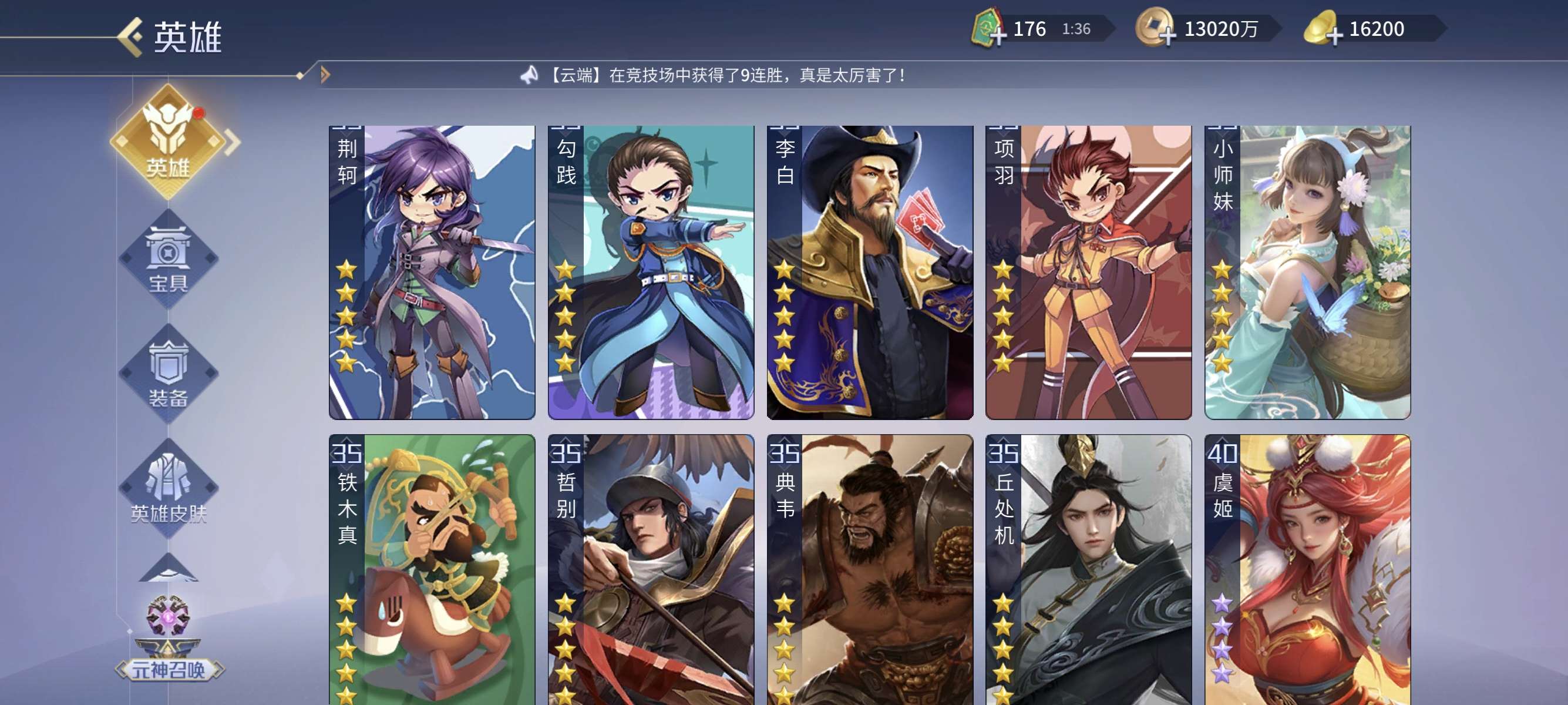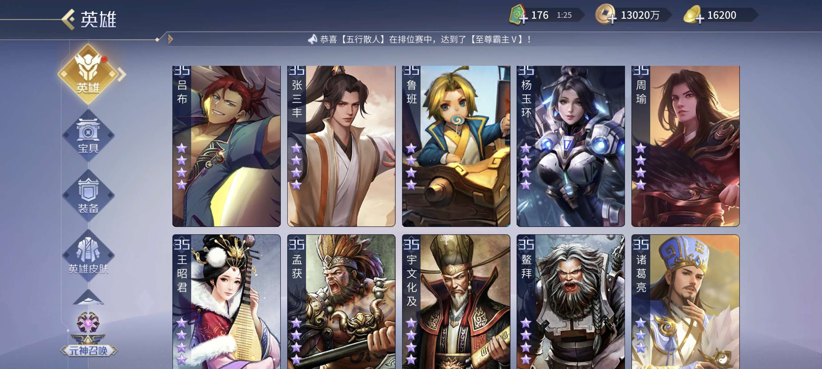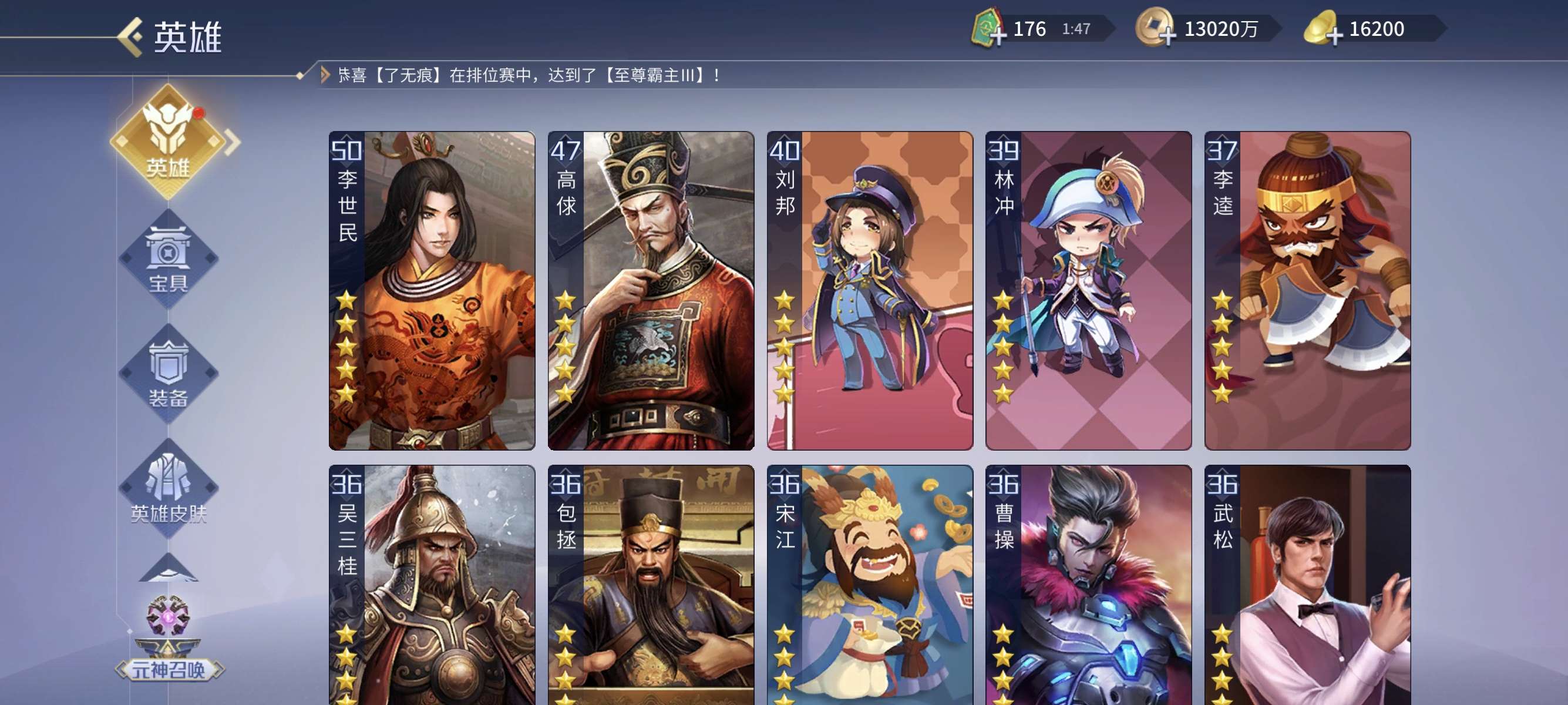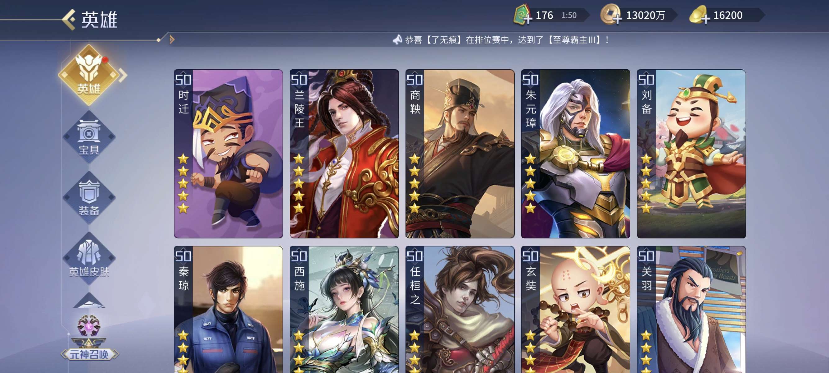 v13,兰陵王商鞅小偷包拯杨玉环等英雄应有尽有,五星印记超多,买到就是赚到