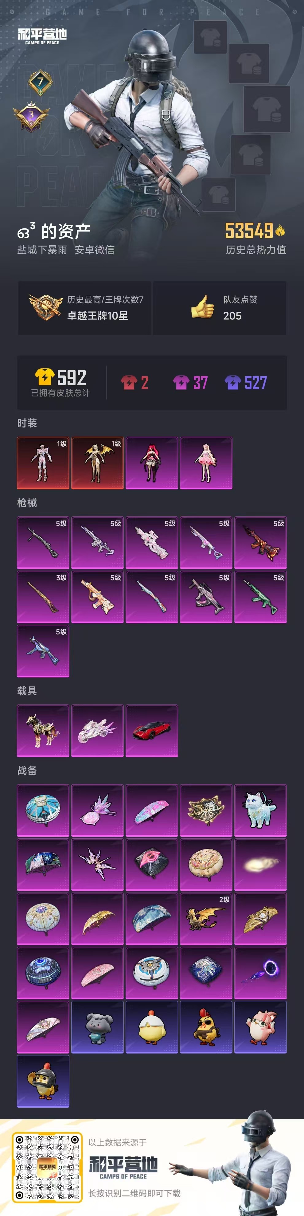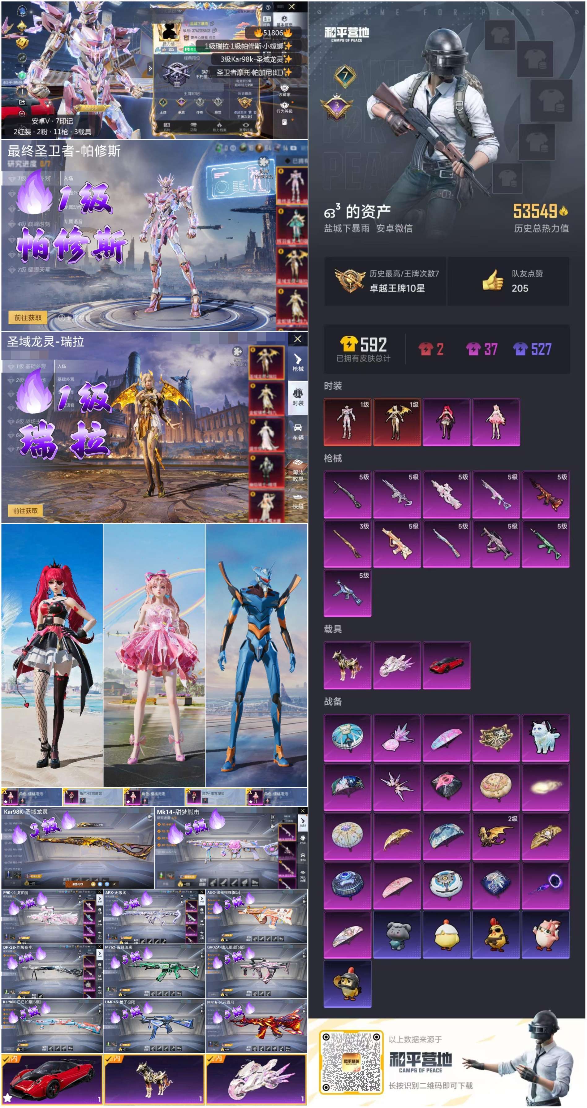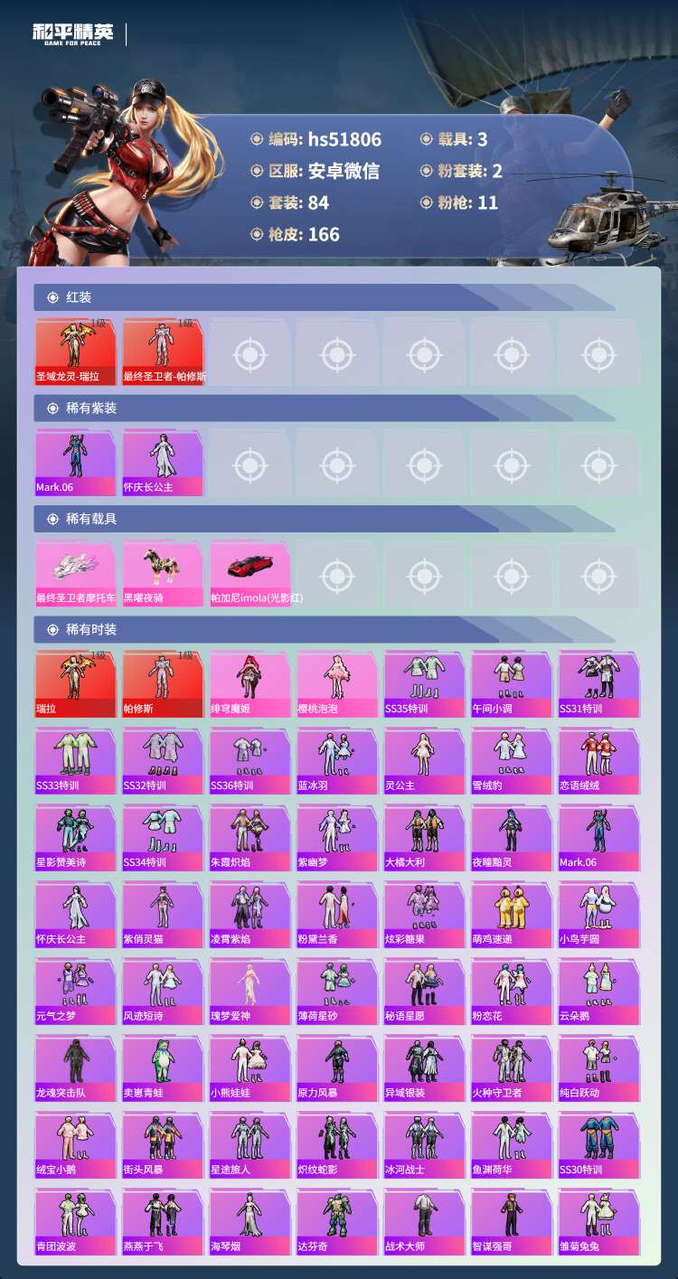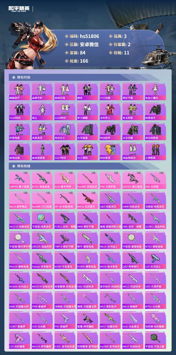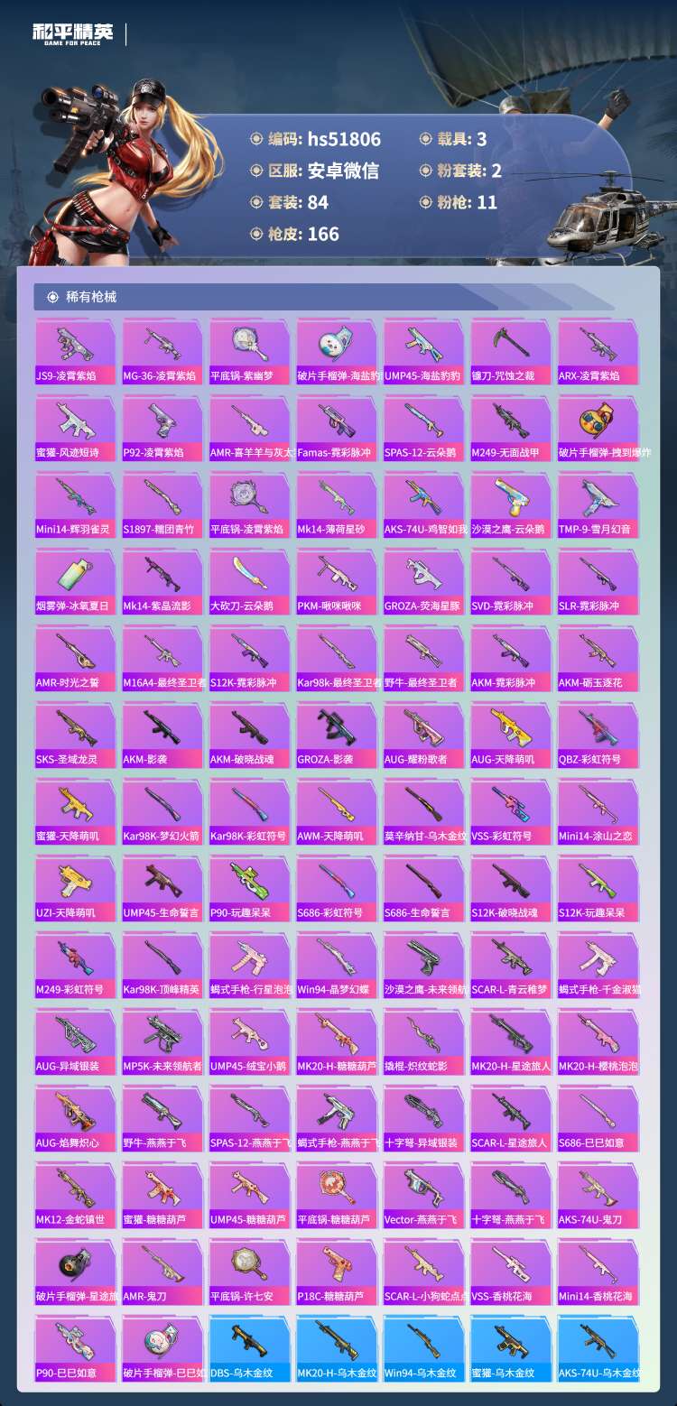 安卓微-7王牌印记-2红装-2粉装-11特效枪-3载具-84套装