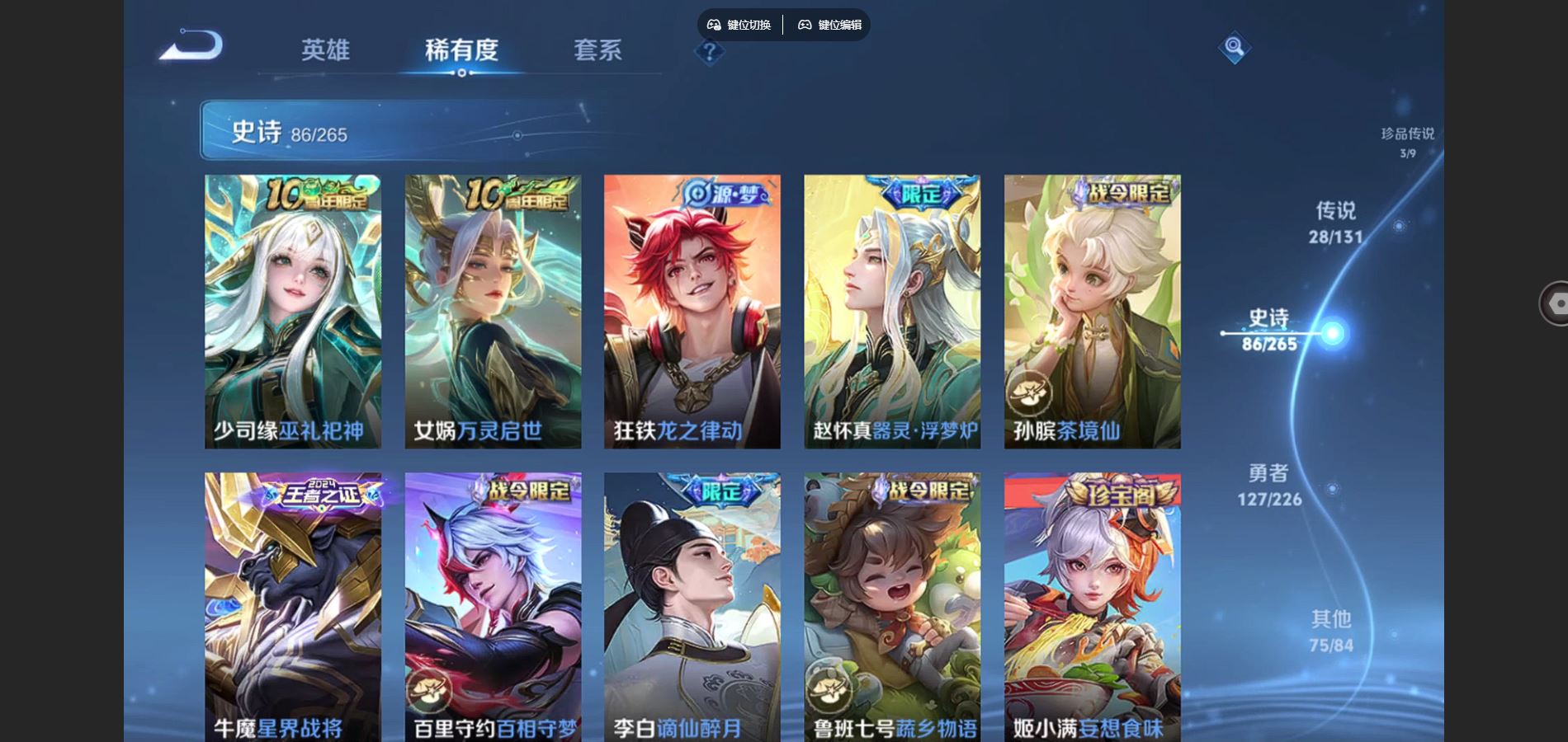 321皮肤2典藏3珍品传说28传说 打野41段 金标暃 金标赵怀真 2星传说 幽冥之眼 未来机甲 【