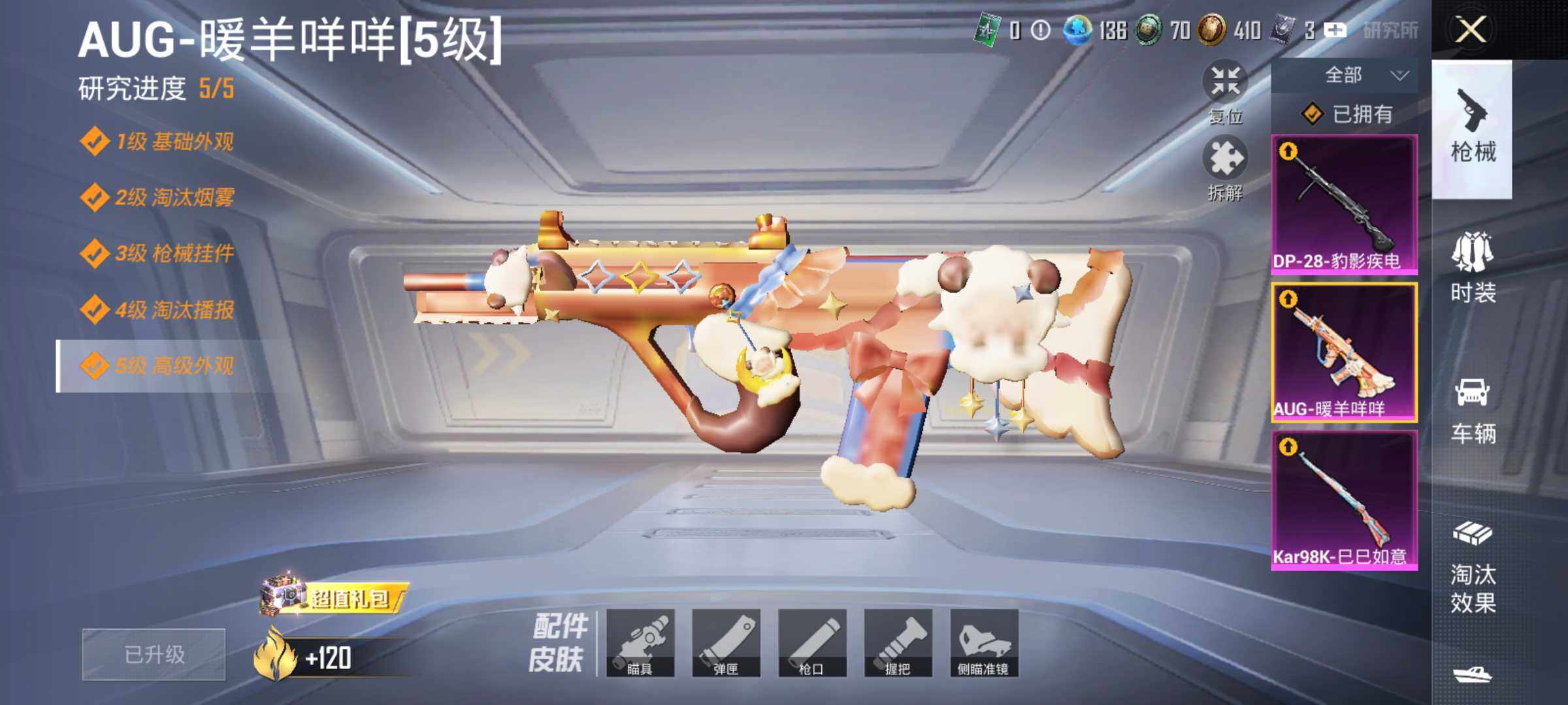 【粉色枪皮等级】:AUG-暖羊咩咩(五级),Kar98K-巳巳如意(五级),DP-28-豹影疾电(四级)