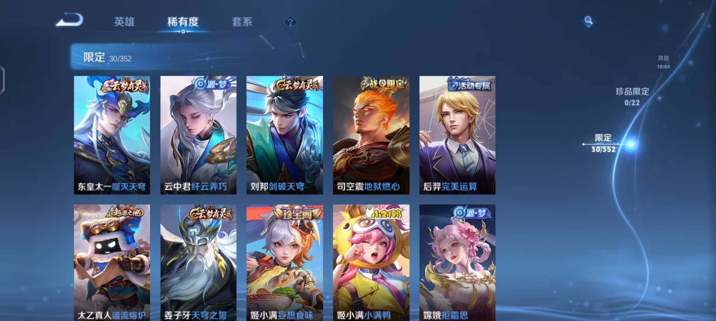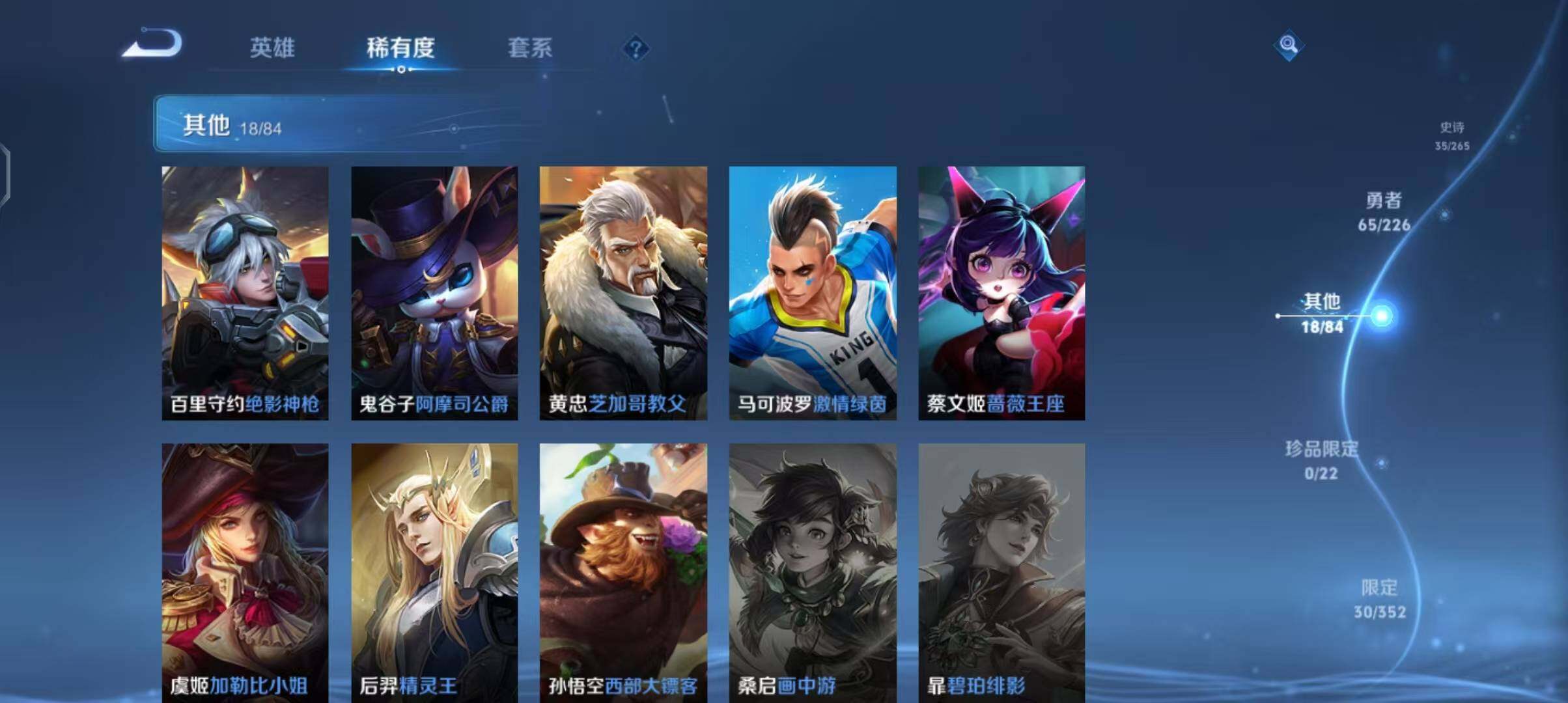 贵族0/皮肤18/史诗2/英雄63/狄仁杰-万华元夜