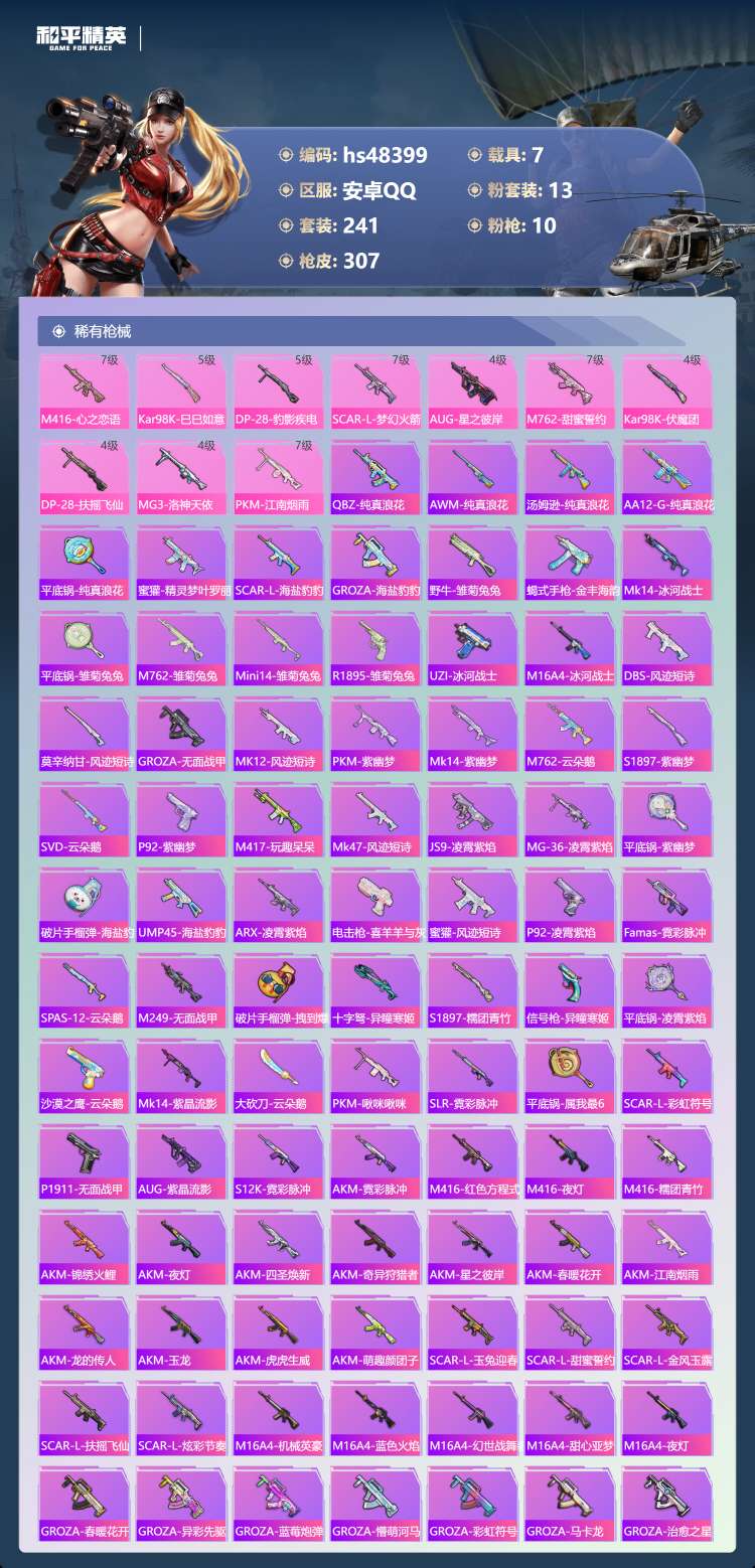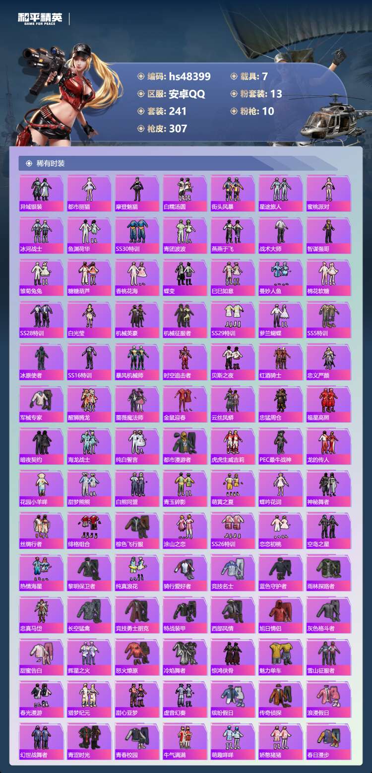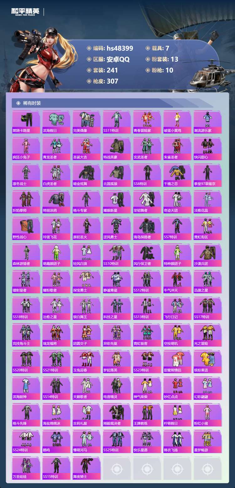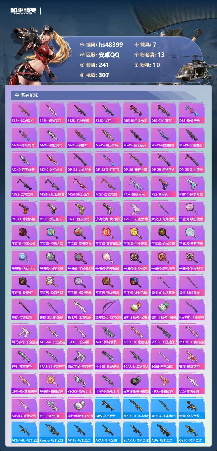 安卓Q-1红装2稀有7载具13粉装10特效枪29热门241套装307枪皮 122124热力值 21印