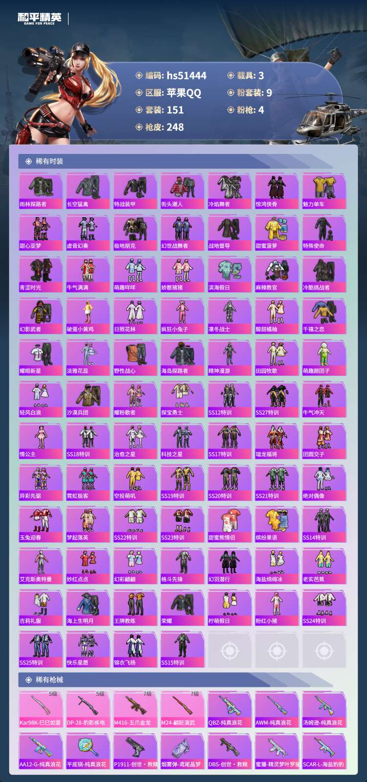 hs51444 苹果手Q-15王牌印记-9粉装-4特效枪-3载具-73494热力值-151套装-24