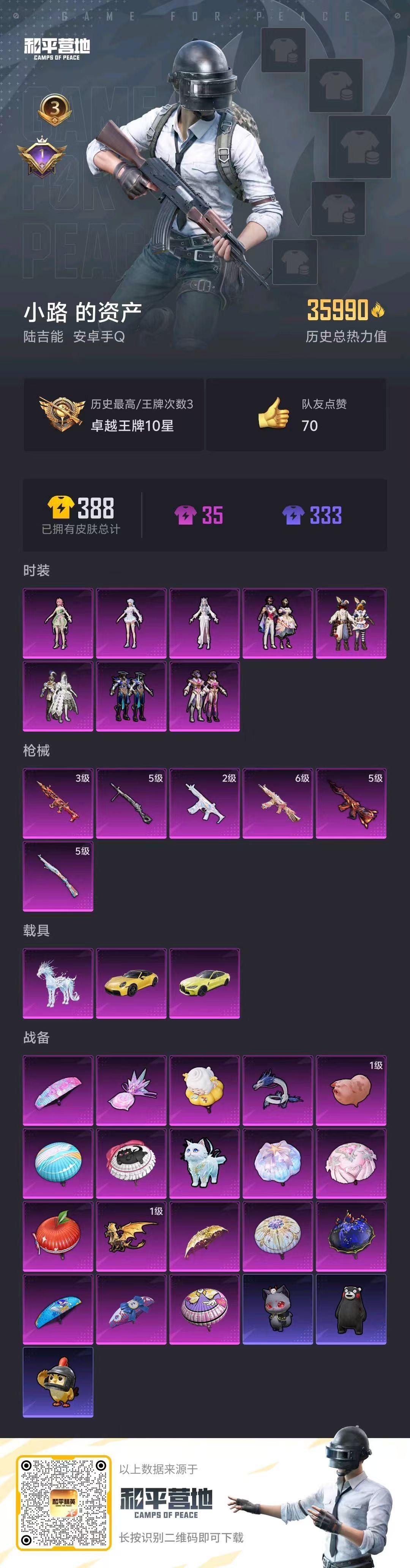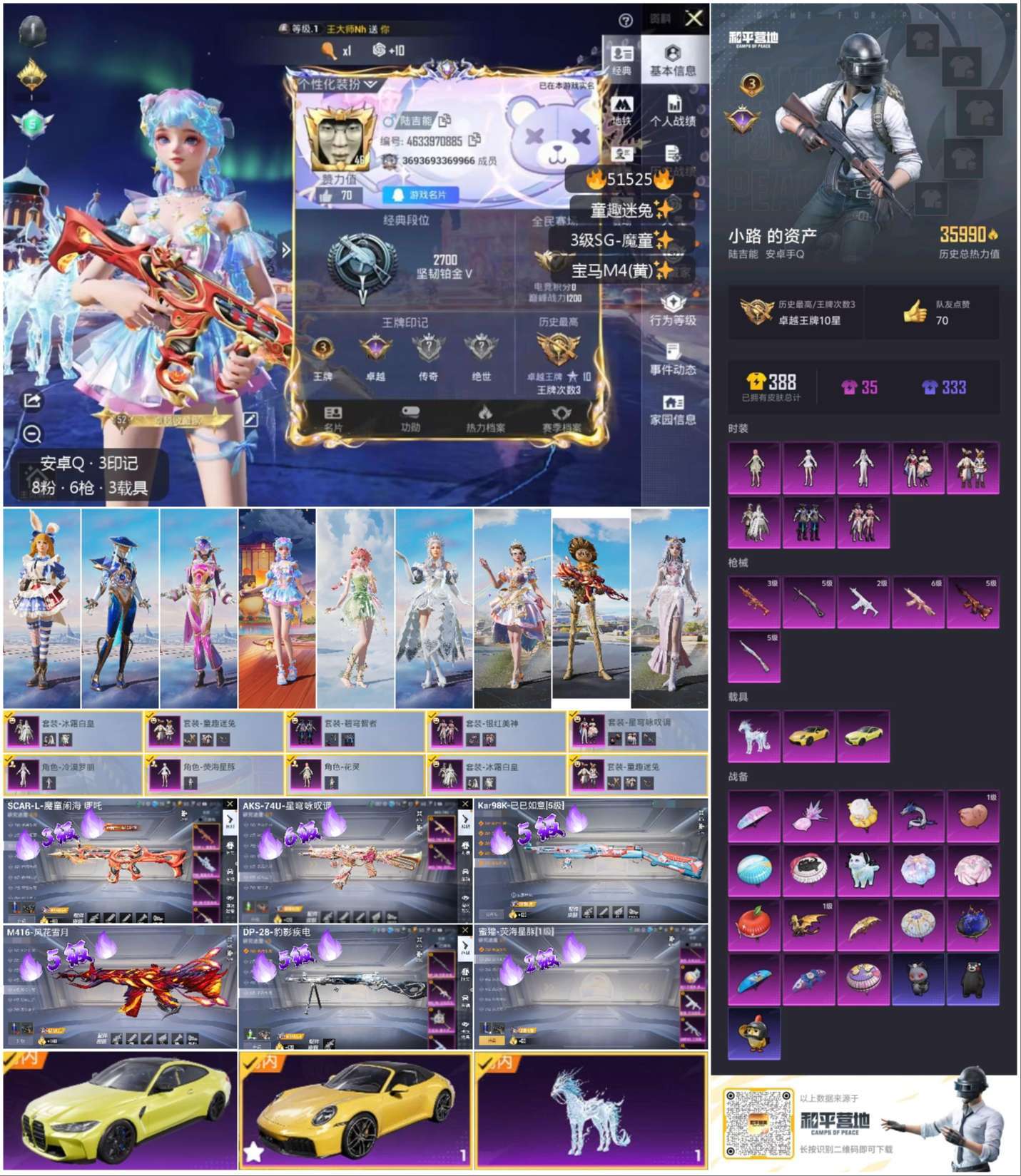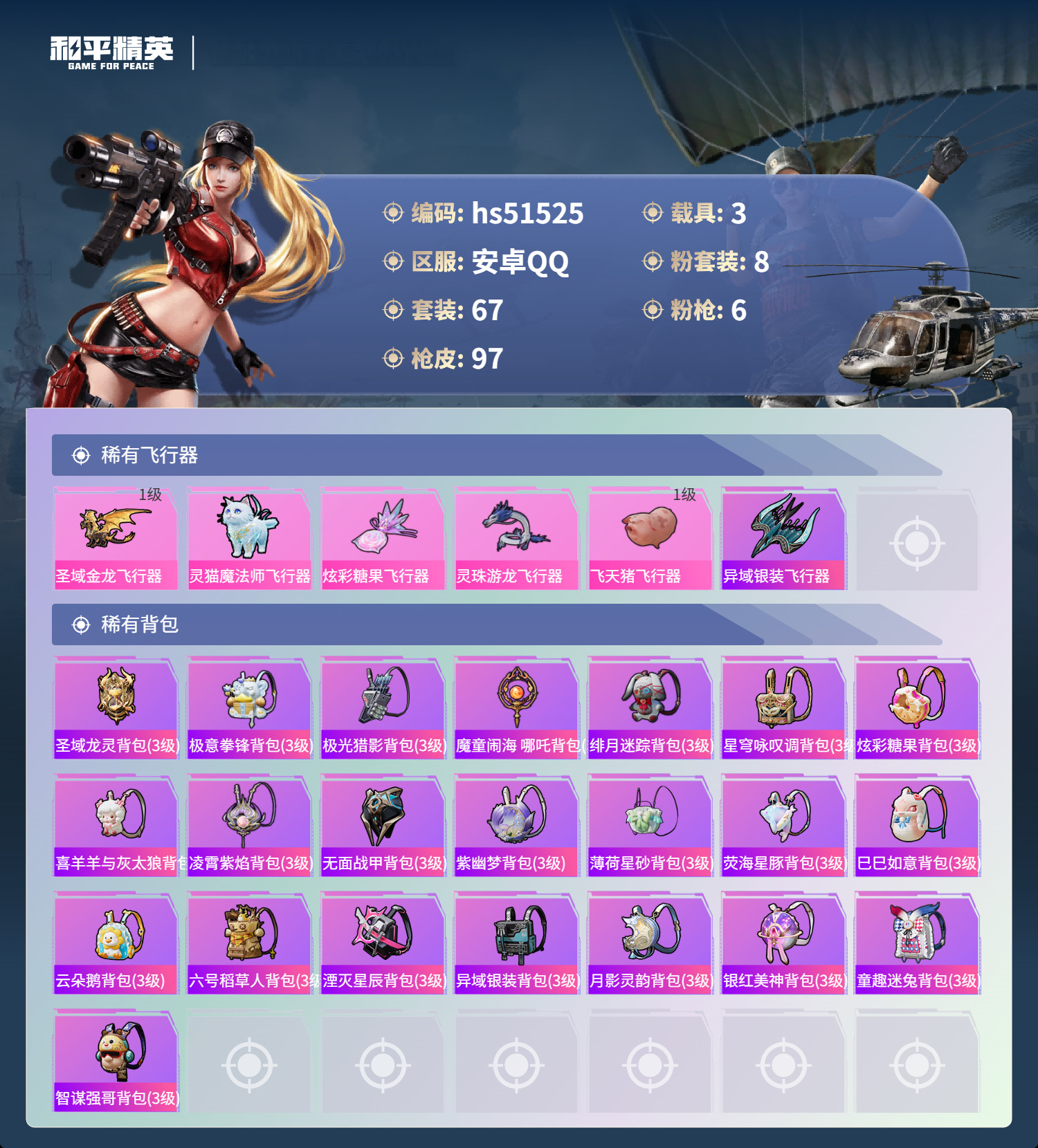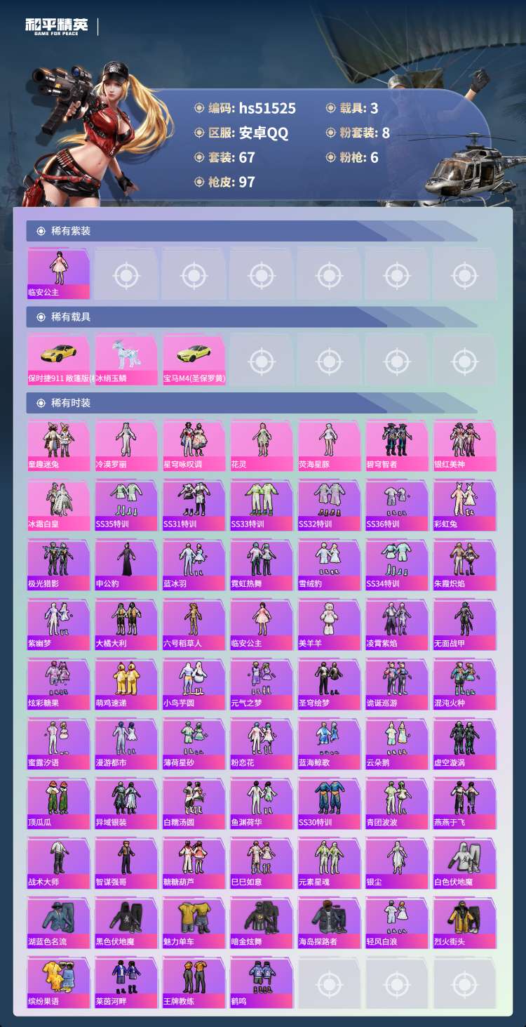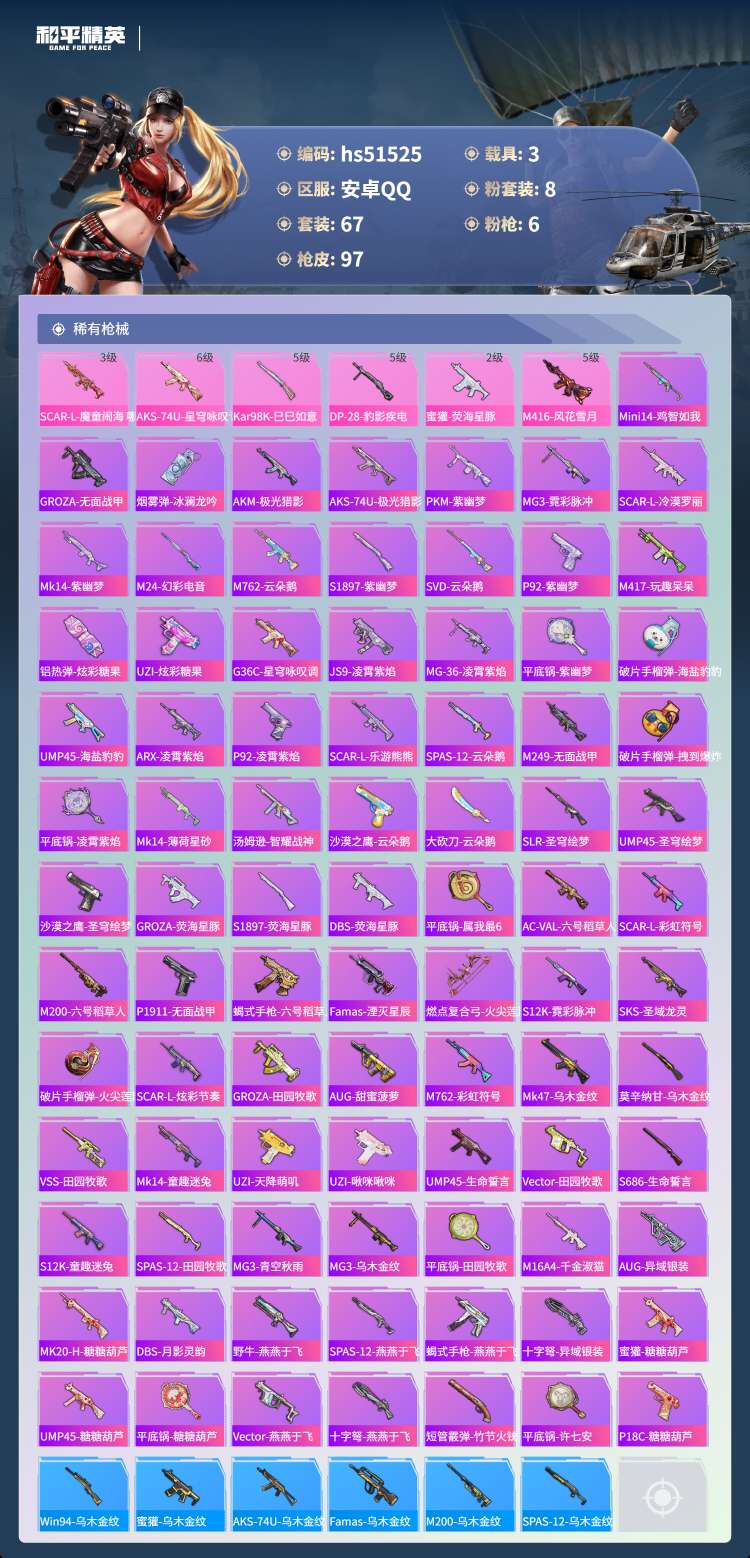 hs51525 安卓手Q-3王牌印记-8粉装-6特效枪-3载具-35991热力值-67套装-97枪皮
