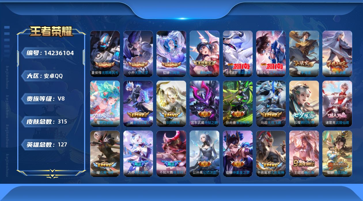 427-[14236104]电音狂想天幕 贵族8-315皮3典藏32传说1无双2珍品传说 安卓手Q173区315皮3典藏32传说1无双2珍品传说V8 营地ID352305036至尊星耀V【珍品传说皮肤】:江户川柯南,怪盗基德【无双皮肤】:瑶真我赫兹【荣耀典藏】:无限飓风号,幻阙歌,天鹅之梦【优质限定皮肤】:无双飞将,瑶时之祈愿,凤求凰【传说皮肤】:神树通天,映山客,逐花归海,影龙天霄,时之奇旅,时之奇旅,时之恋人,电玩·雷克斯,鹤归松栖,乞巧织情,炽阳神光,淬星耀世,久胜战神,记忆之