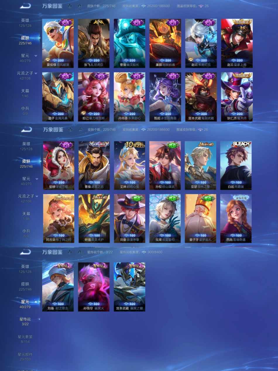 【1珍品9传说3星传】安卓QQ-125英雄-225皮肤【珍品传说】黑崎一护【星元皮肤】时之思念幽冥火幽冥之眼【传说皮肤】神树通天、战鼓燎原、鸣野蒿、齐天大圣、黄金狮子座、地狱之眼、时之恋人、地狱火、淬星耀世【史诗皮肤】星界战将、荣光圣徽、顽趣、真我赫兹、电玩·爆裂旋风、幽灵船长、功夫厨神、李小龙、暗渊魔法、猫狗日记、水果甜心、乘风破浪、缤纷独角兽、黎明之约、乱世虎臣、皇家上将、冰雪圆舞曲、黄金分割率、猪悟能、高山流水、五谷丰年、未来纪元、节奏热浪、心灵骇客、星夜王子、原初追逐者、魅力维加斯、魔术