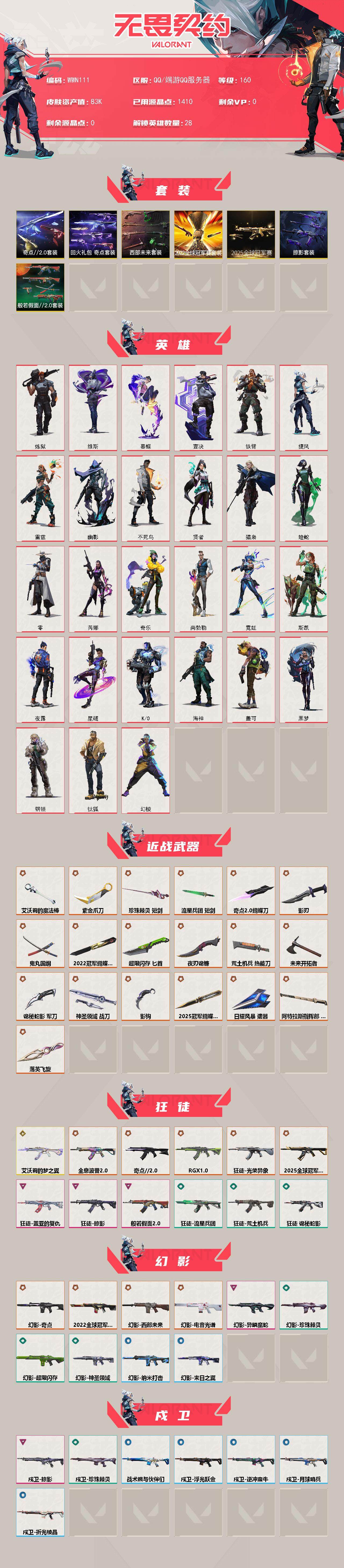 【WWN111】终极*37/传奇*1/卓越*12/皮肤*146/等级*160/段位:黄金/2025全球冠军赛套装/2022全球冠军赛套装/西部未来套装/奇点//2.0套装/回火礼包:奇点套装/般若假面//2.0套装/掠影套装/幻棱/炼狱/维斯/暮蝶/钛狐/壹决/铁臂/捷风/雷兹/幽影/不死鸟/贤者/猎枭/蝰蛇/零/芮娜/奇乐/尚勃勒/霓虹/斯凯/夜露/星礈/K/O/海神/盖可/黑梦/钢锁/近战武器-2025全球冠军赛 蝴蝶刀/近战武器-2022全球冠军赛 蝴蝶刀/近战武器-影钩/近战武器-奇点/
