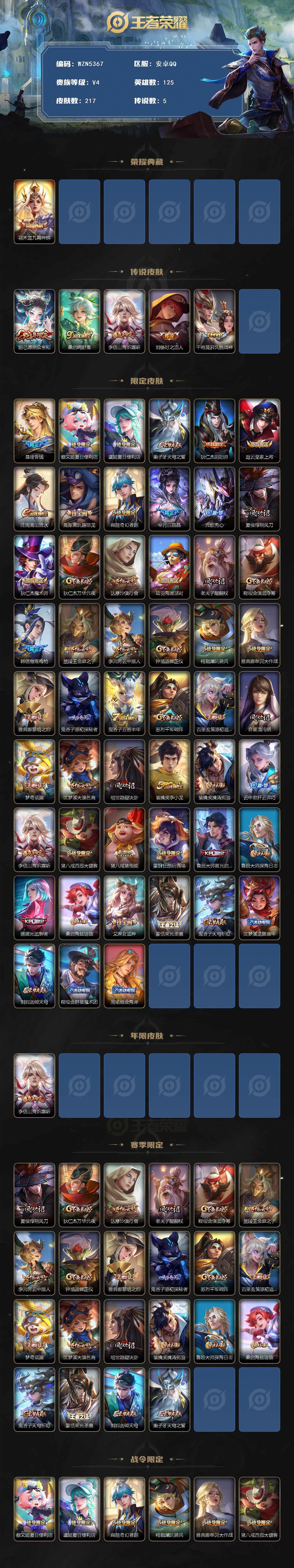 【WZN5367】贵族4/皮肤217/典藏1/传说5/史诗53/英雄125/鬼谷子全皮/猪八戒全皮/鲁班大师全皮/蒙恬全皮/花木兰-九霄神辉/妲己-愿照·众生和/桑启-鸣野蒿/李信-山海·炽霜斩/刘备-时之恋人/干将莫邪-久胜战神/暃-埋骨钱/蔡文姬-夏日便利店/虞姬-夏日便利店/姜子牙-天穹之誓/狄仁杰-阴阳师/赵云-皇家上将/庄周-高山流水/高渐离-玩趣恶龙/扁鹊-奇幻香踪/芈月-白晶晶/元歌-无心/夏侯惇-朔风刀/狄仁杰-魔术师/狄仁杰-万华元夜/达摩-沙漠行僧/项羽-海滩派对/老夫子-醍