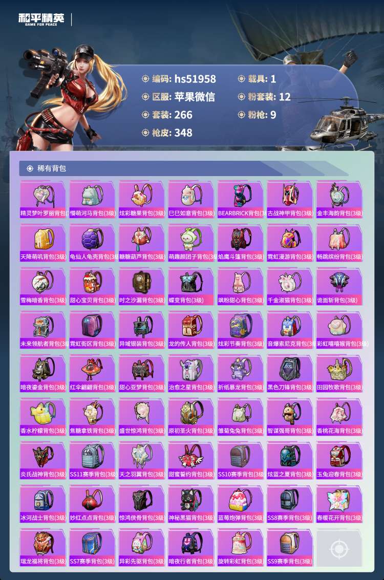 hs51958 苹果v-17王牌印记-12粉装-9特效枪-1载具-113823热力值-266套装-
