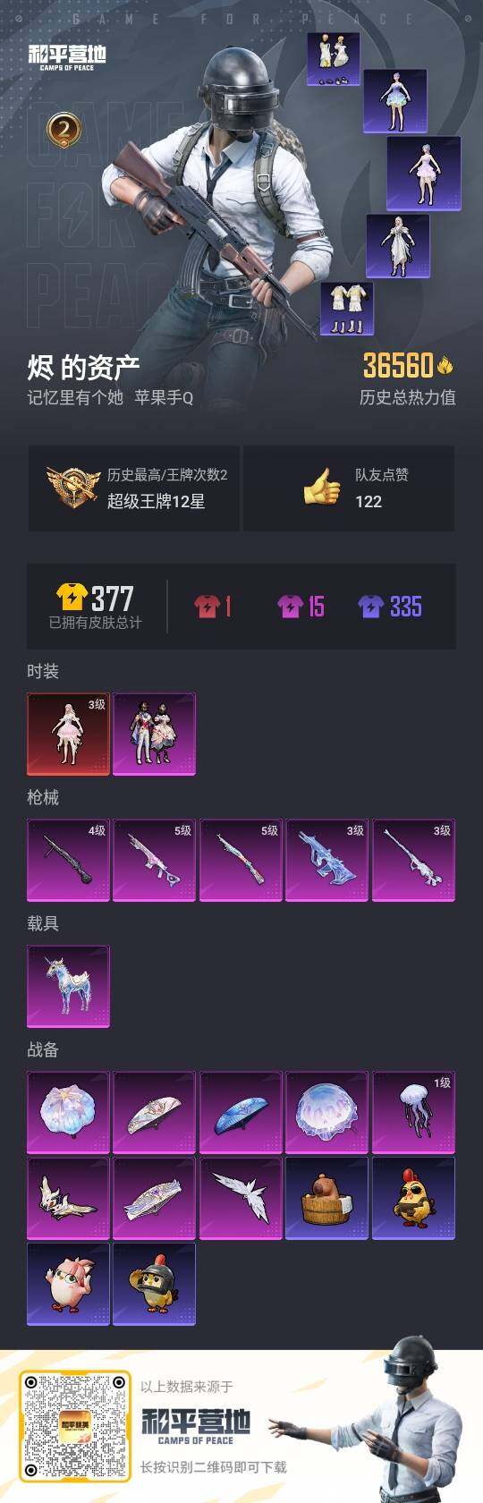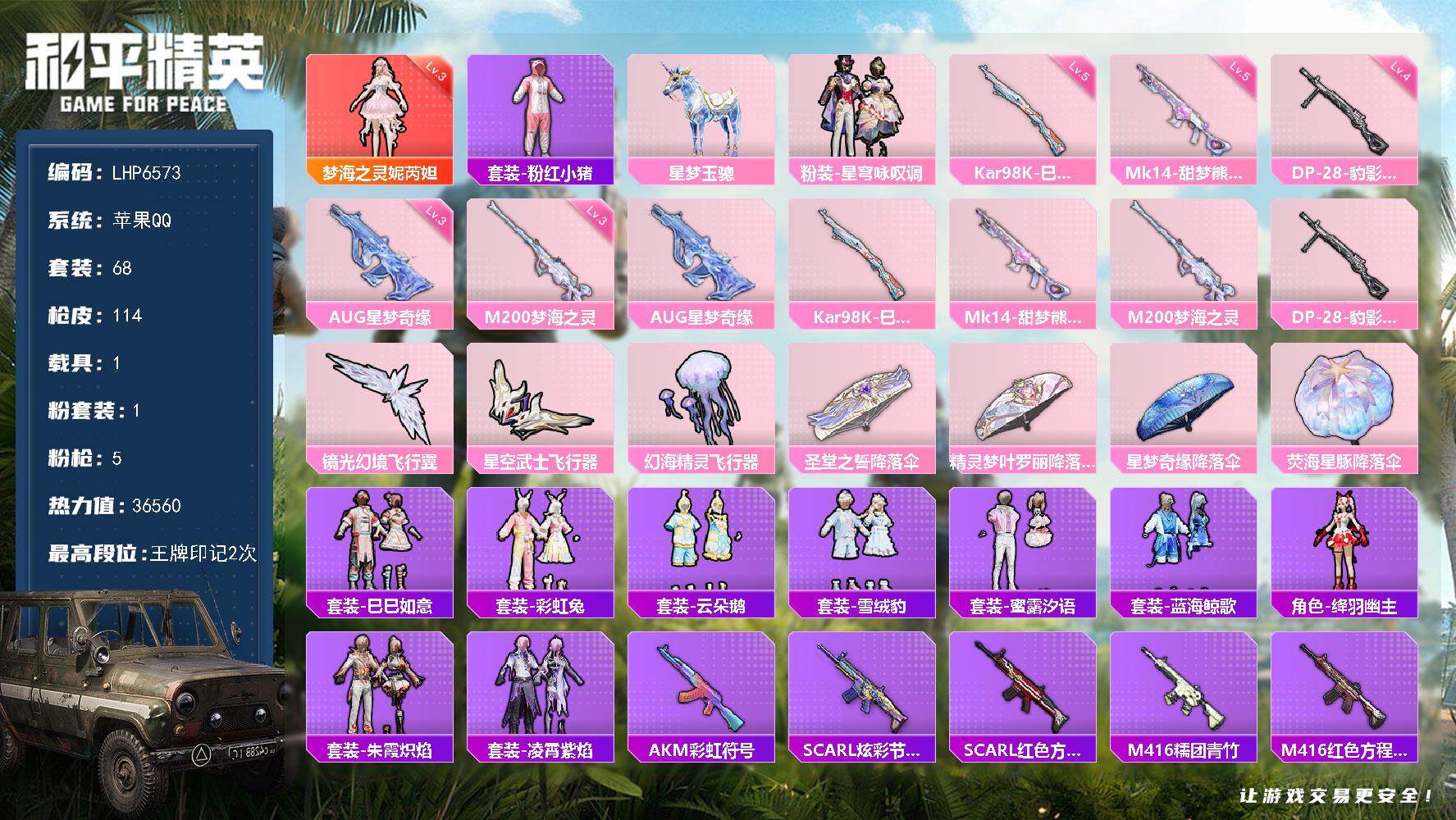 【店主推荐捡漏号!可直接换绑】/素材身法号 苹果 手Q-1神装-1粉装-5特效枪-1载具-3粉色飞行器-3.6w热力值-2王牌印记-68套装-114枪皮【红色神装等级】:梦海之灵-妮芮妲(三级)【热门品类】:套装-粉红小猪【粉色载具】:星梦玉骢【粉色套装】:粉装-星穹咏叹调【粉色枪皮等级】:AUG-星梦奇缘(三级),Kar98K-巳巳如意(五级),Mk14-甜梦熊击(五级),M200-梦海之灵(