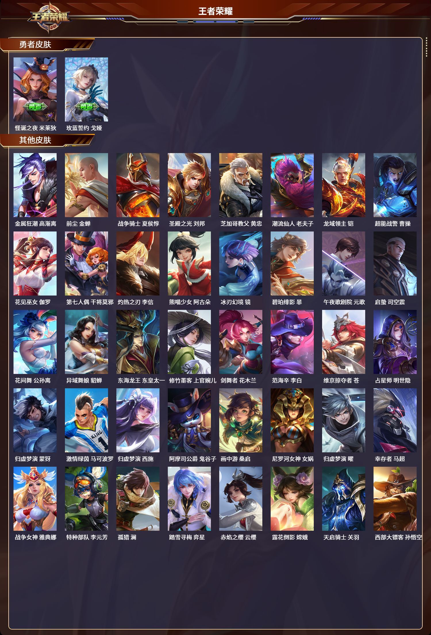 安卓QQ/至圣王者/251皮肤/127英雄/1典藏/0珍品无双/1无双/0珍品传说/11传说/76史