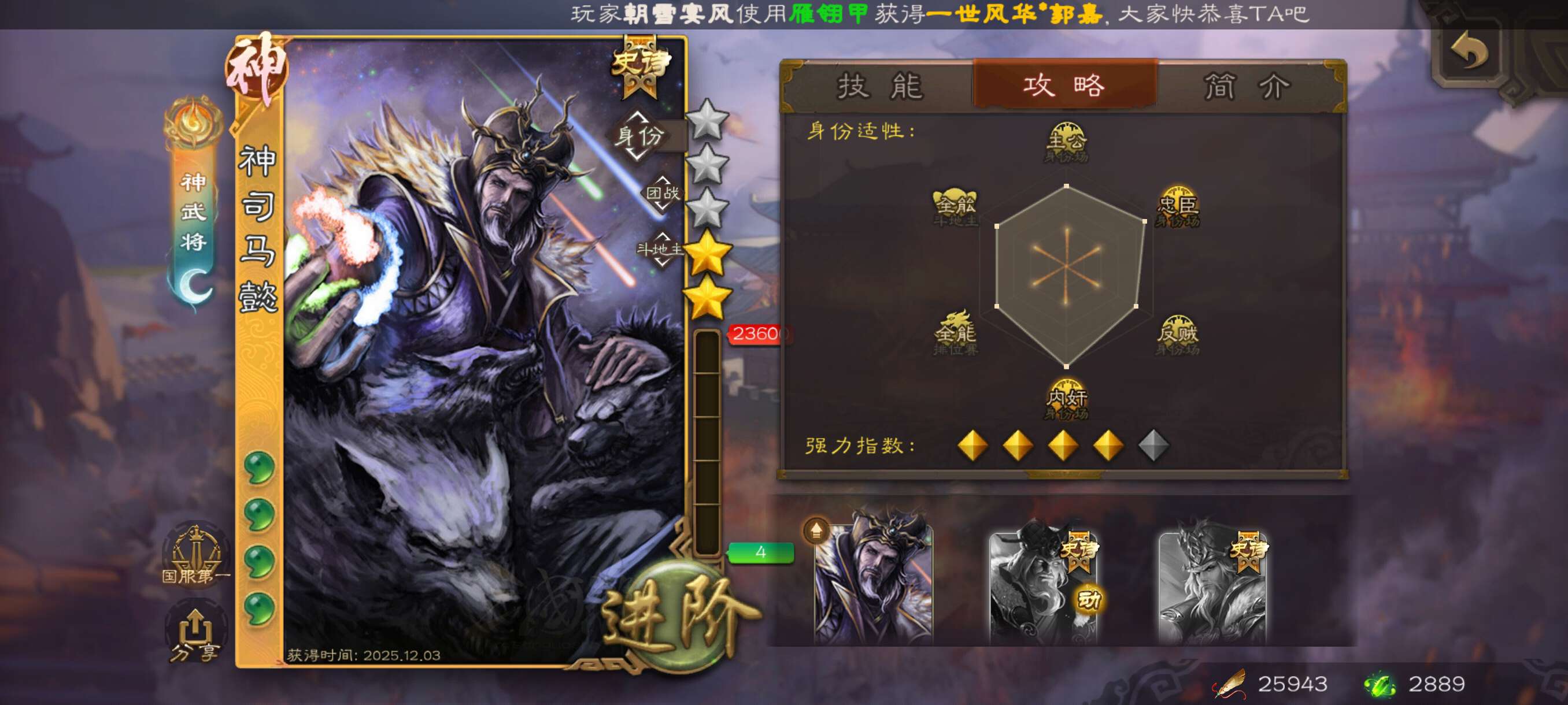神司马懿精品开局号!总将63,材料充足,游卡官服字母格式活绑