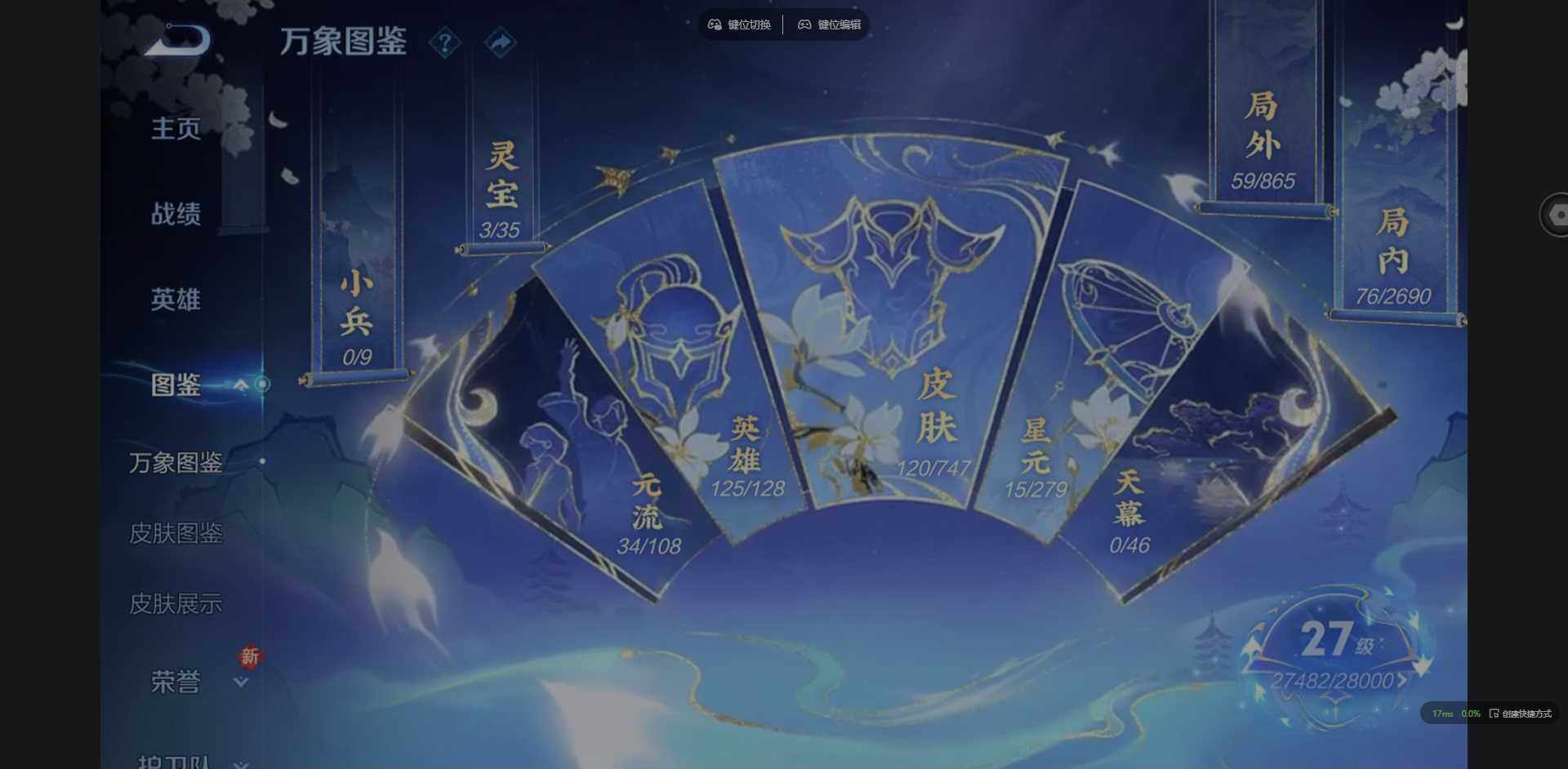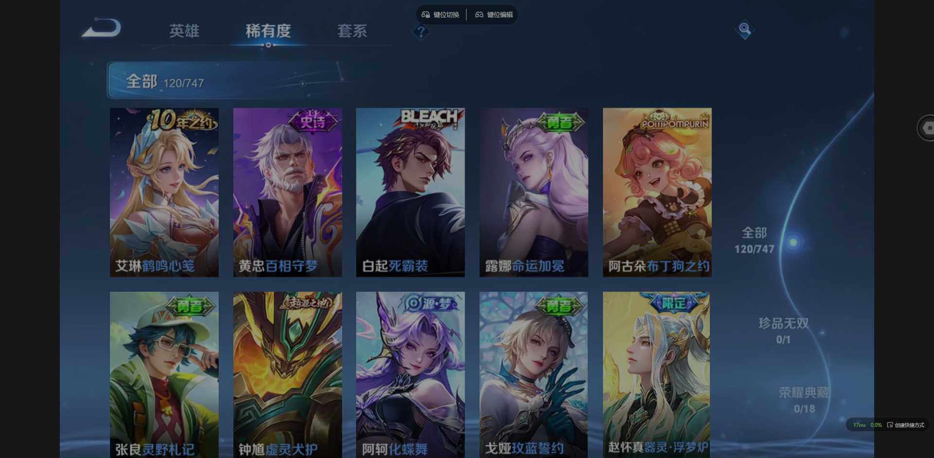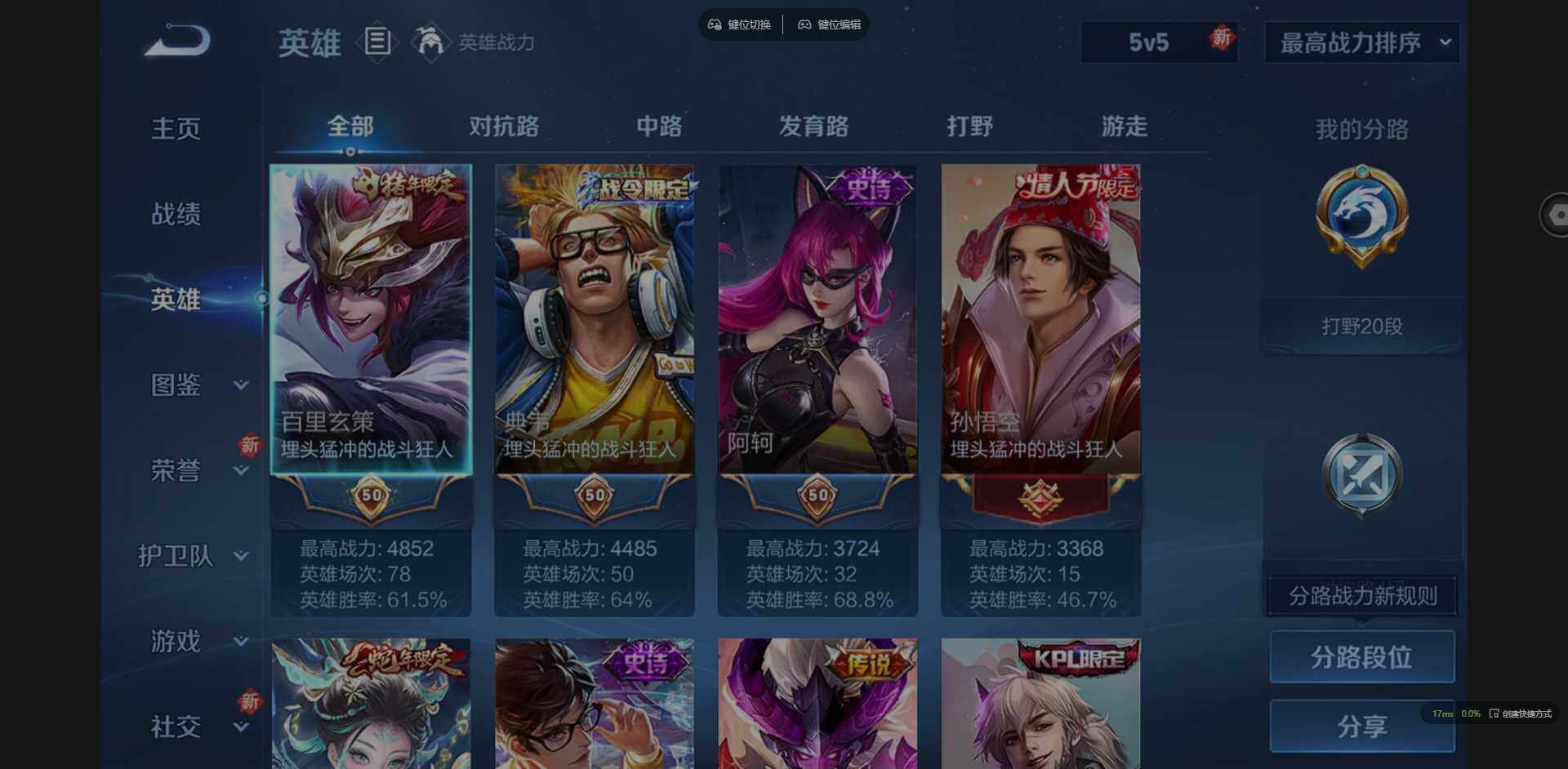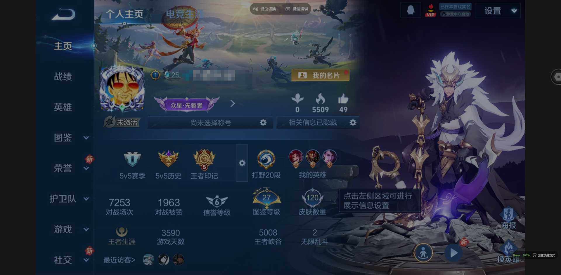 贵族等级: V6 英雄数: 125 皮肤数: 120 传说皮: 冠军飞将,地狱