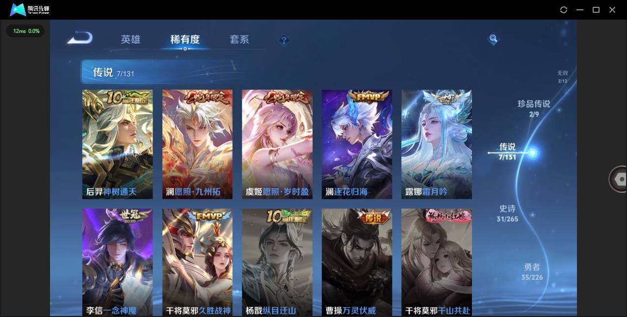 实名: 可修改 贵族等级: V7 英雄数: 107 皮肤数: 87 无双皮: 器灵·螭龙剑,神罪 珍品传说: 怪盗基德,酷洛米之心 传说皮: 久胜战神,一念神魔,霜月吟,澜逐花归海,神树通天 限定皮: 愿照·岁时盈,愿照·九州拓