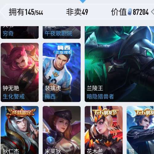 实名: 可修改 贵族等级: V8 英雄数: 126 皮肤数: 213 荣耀水晶