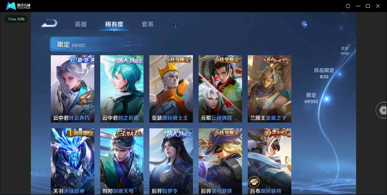 / 人-刘备,淬星耀世,超时空战士-狄仁杰,末日机甲-孙策,山海·苍雷引 限定皮: 冰锋战神,李小龙,御风骁将,时雨天司,神威,飞衡,青春决赛季,逐梦之影,白虎志,青龙志,如梦令-后羿,大圣娶亲,高山流水,孙