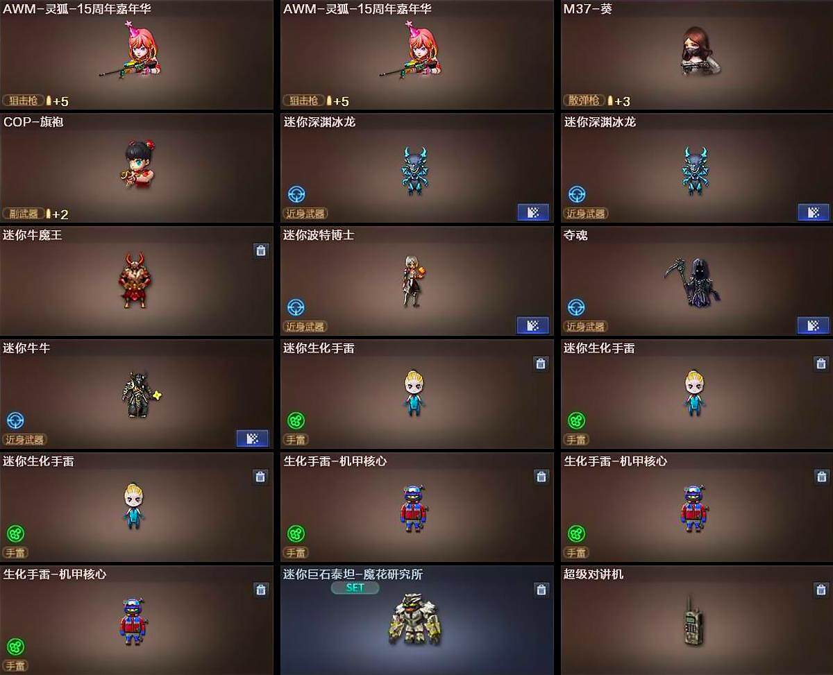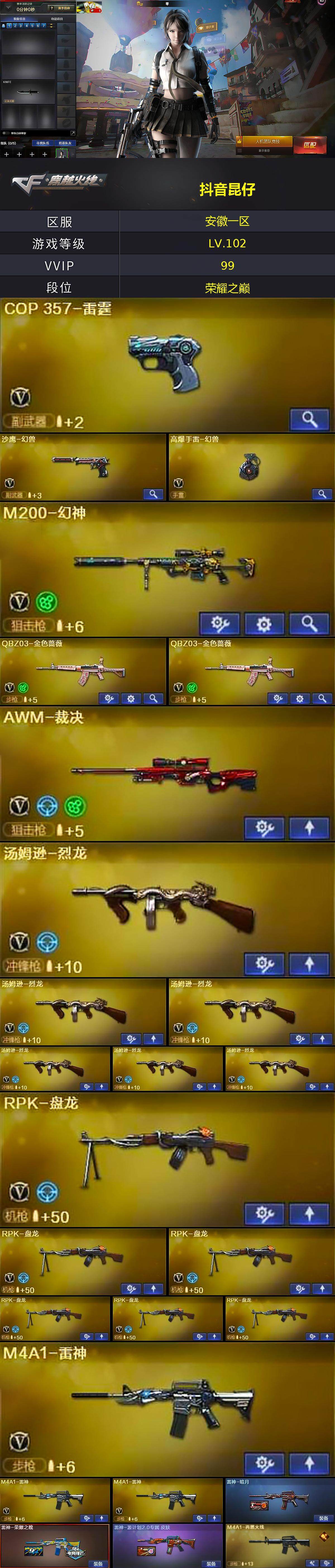 【热门武器】:QBZ03-金色蔷薇*2,M200-幻神,M4A1-黑骑士*2,汤姆逊-烈龙*6,RPK-盘龙*6,加特林-炼狱,炼狱-枪娘掣电,沙鹰-修罗*2,高爆手雷-幻兽