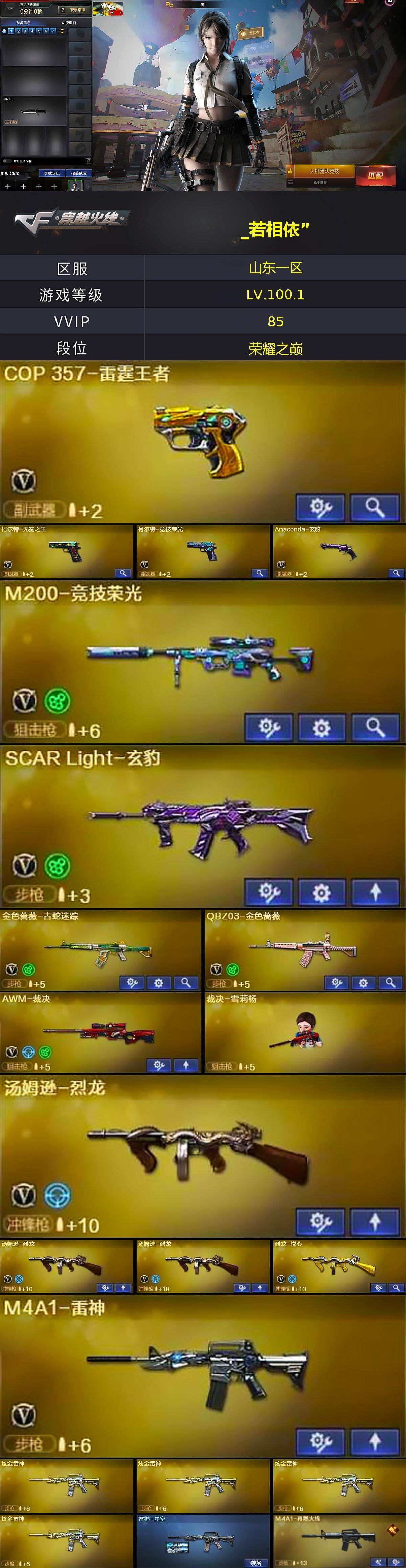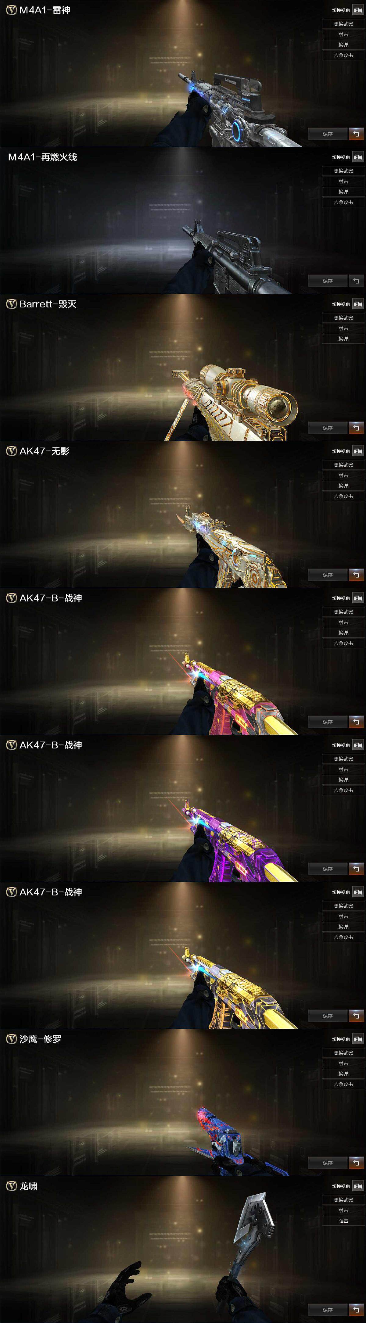 【热门武器】:QBZ03-金色蔷薇,金色蔷薇-古蛇迷踪,修罗-古蛇迷踪,M200-竞技荣光,M4A1-黑骑士*2,汤姆逊-烈龙*3,加特林-炼狱,裁决-雪莉杨,沙鹰-修罗*3
