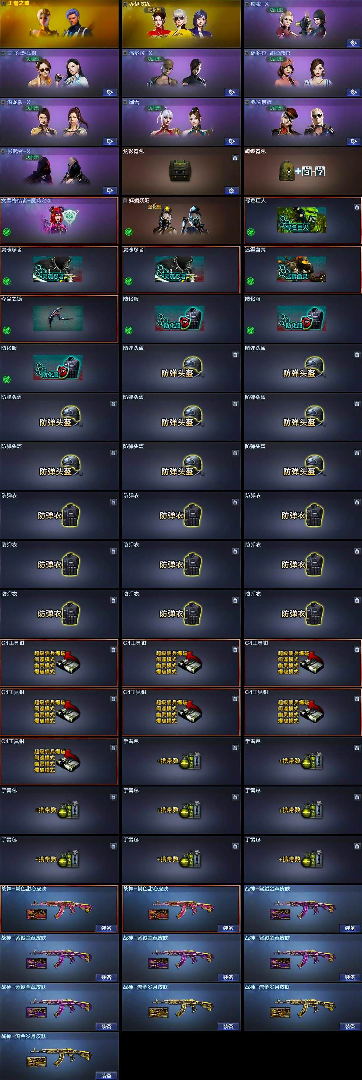 【角色】:王者之瞳,乔伊教练,暗夜-X,兰-海滩派对,潘多拉-X,潘多拉-甜心教官,潜龙队-X,蜀雪,铁骑荣耀,影武者-X