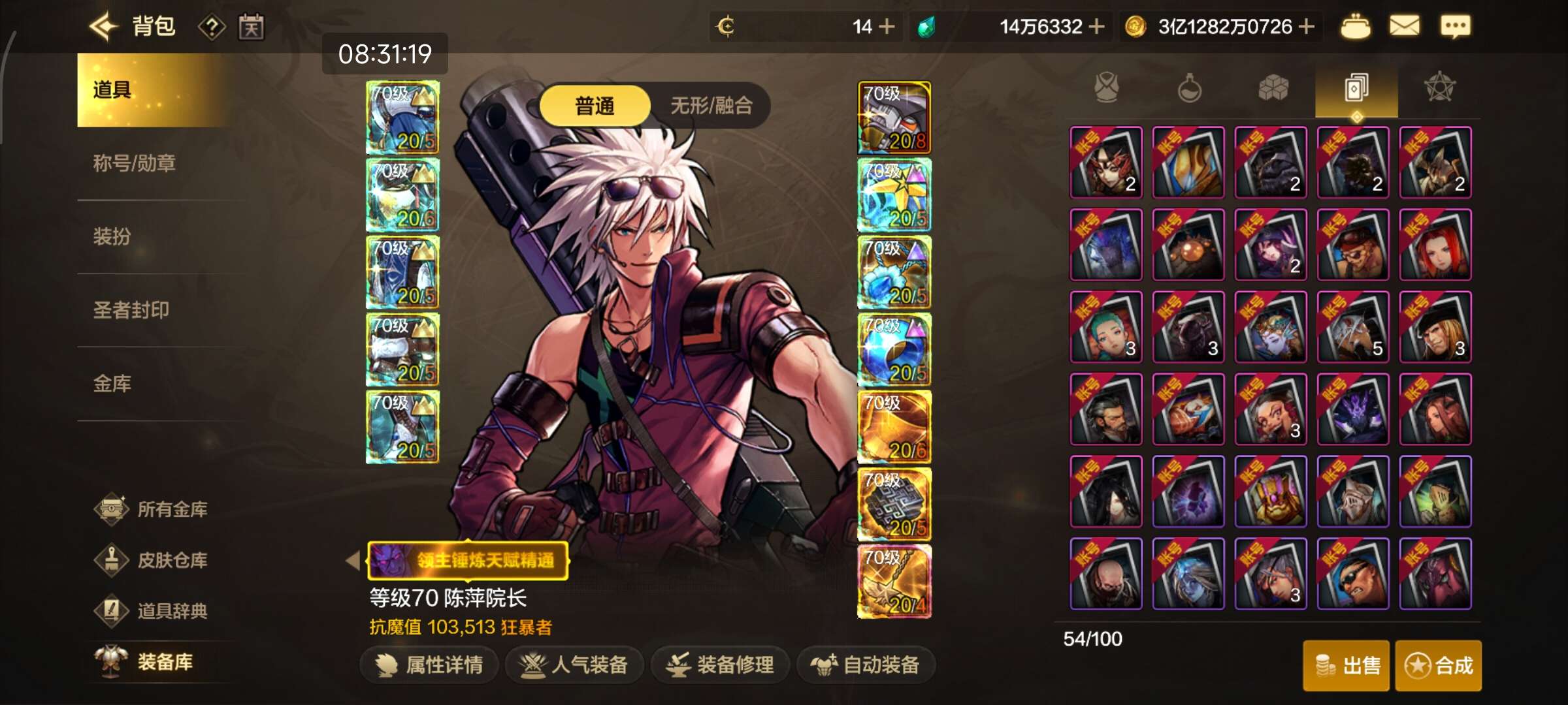 开服玩到现在,大号10.35抗魔,16个满级角色小号4个9.5以上,剩下的都在7万左右具体看图可小刀