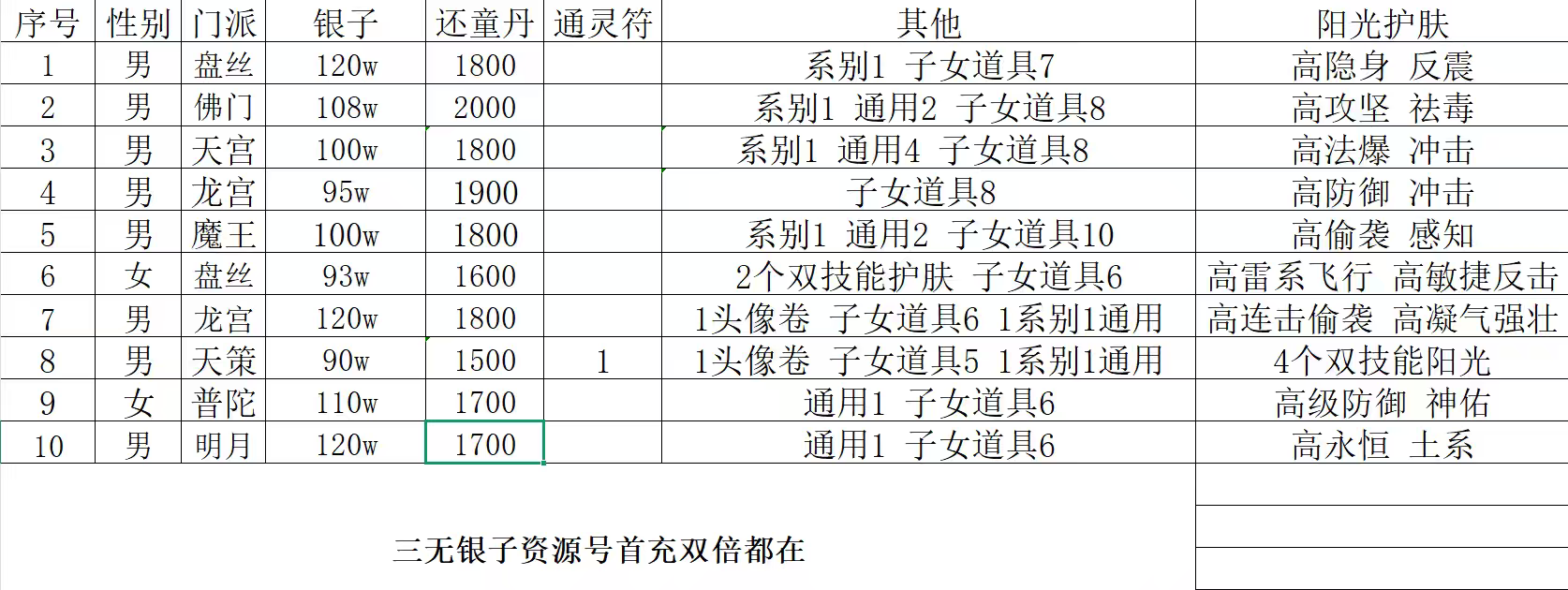 里面还有100万银子资源,还有1800还童丹,还有头像和通灵,高书都没开,4个双技能阳光,双倍都在