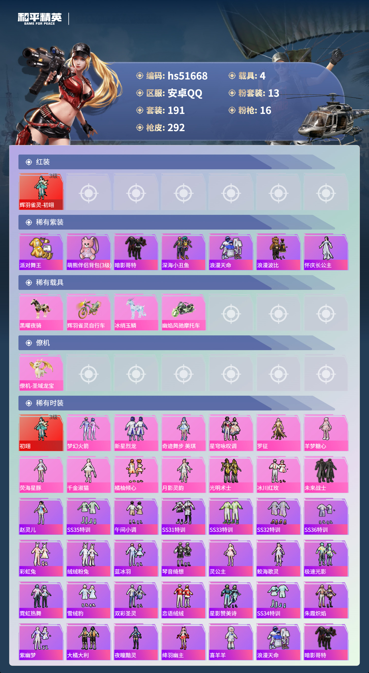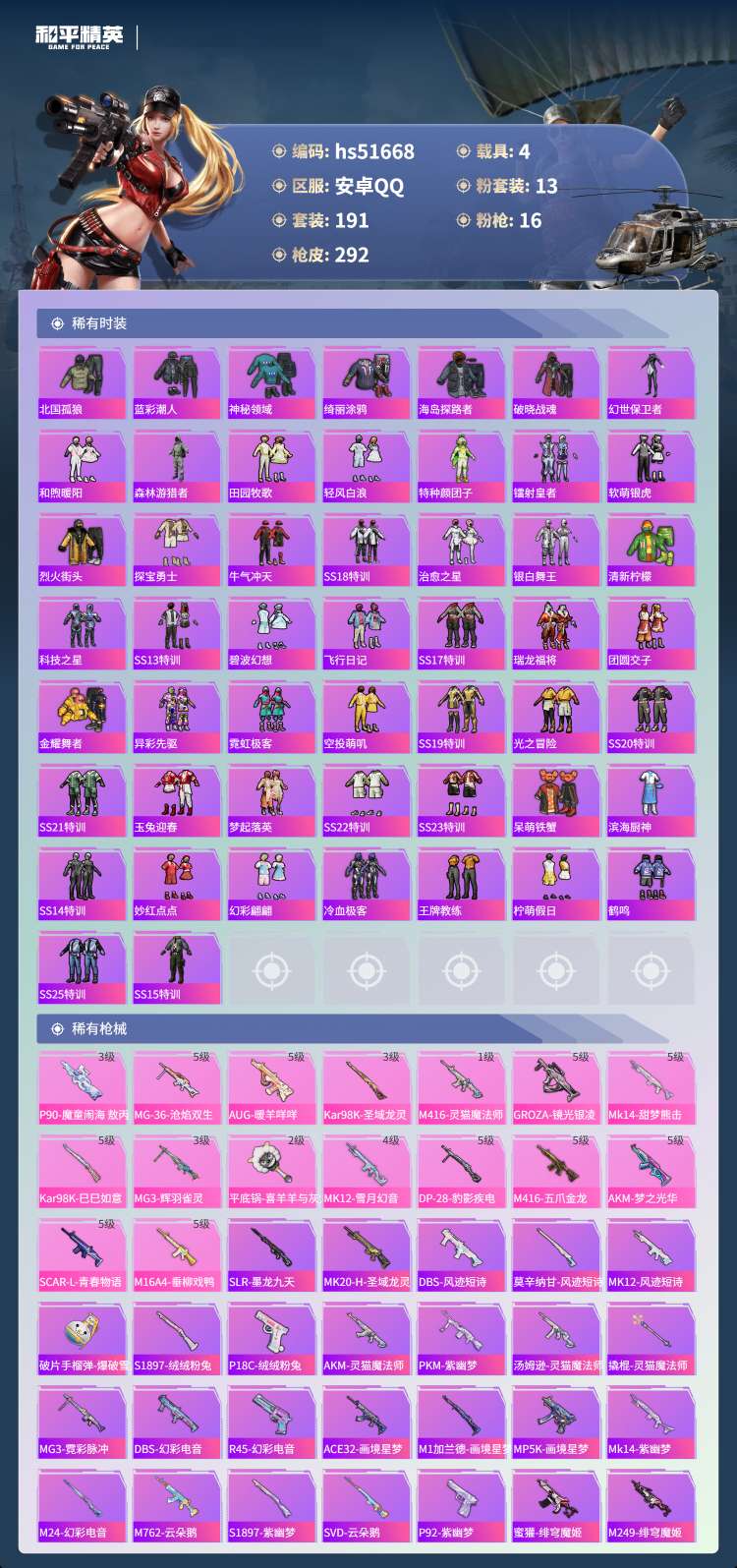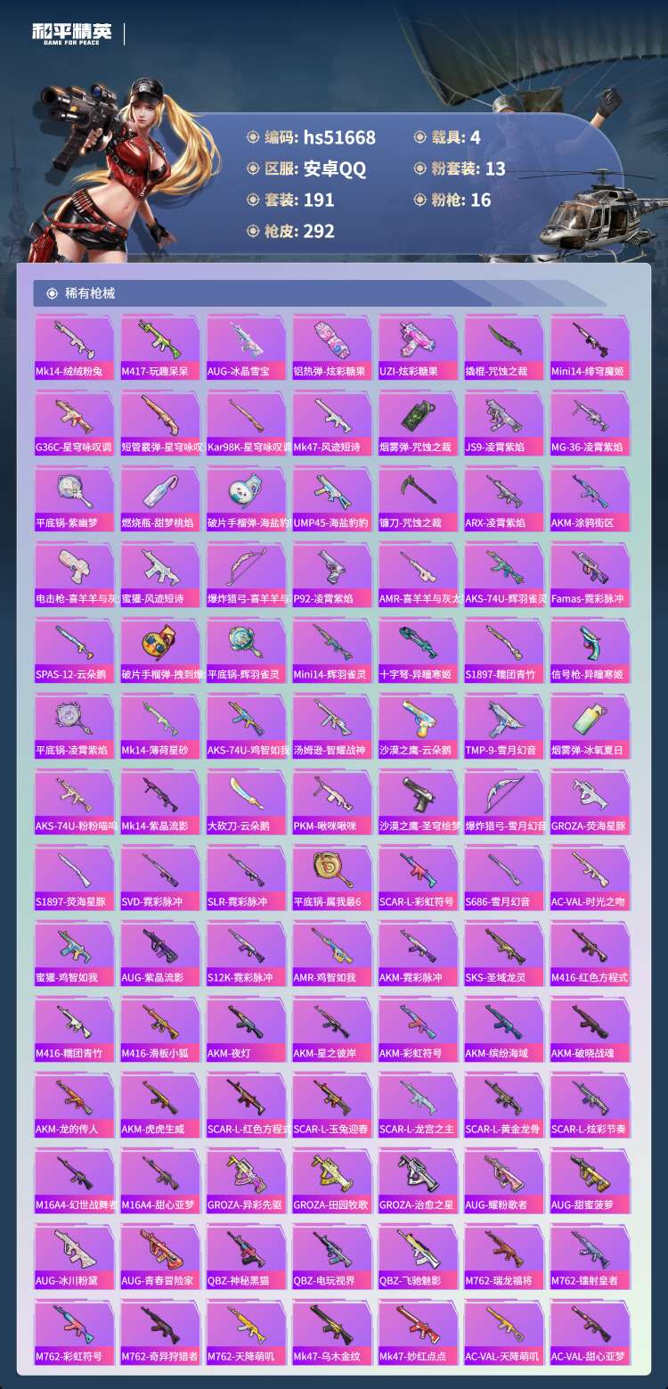 安卓手Q-13王牌印记-1红装-13粉装-16特效枪-4载具-100734热力值-1