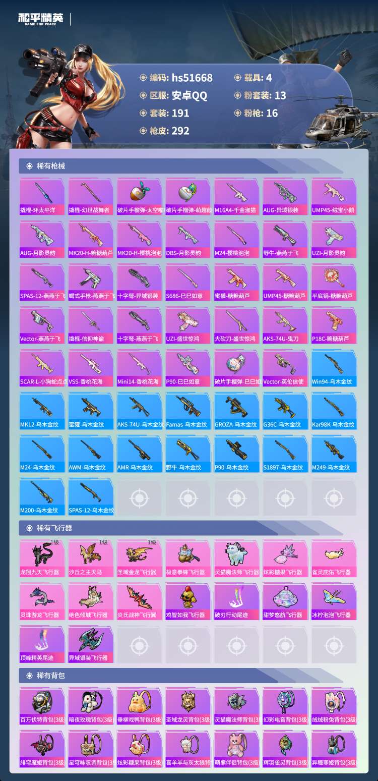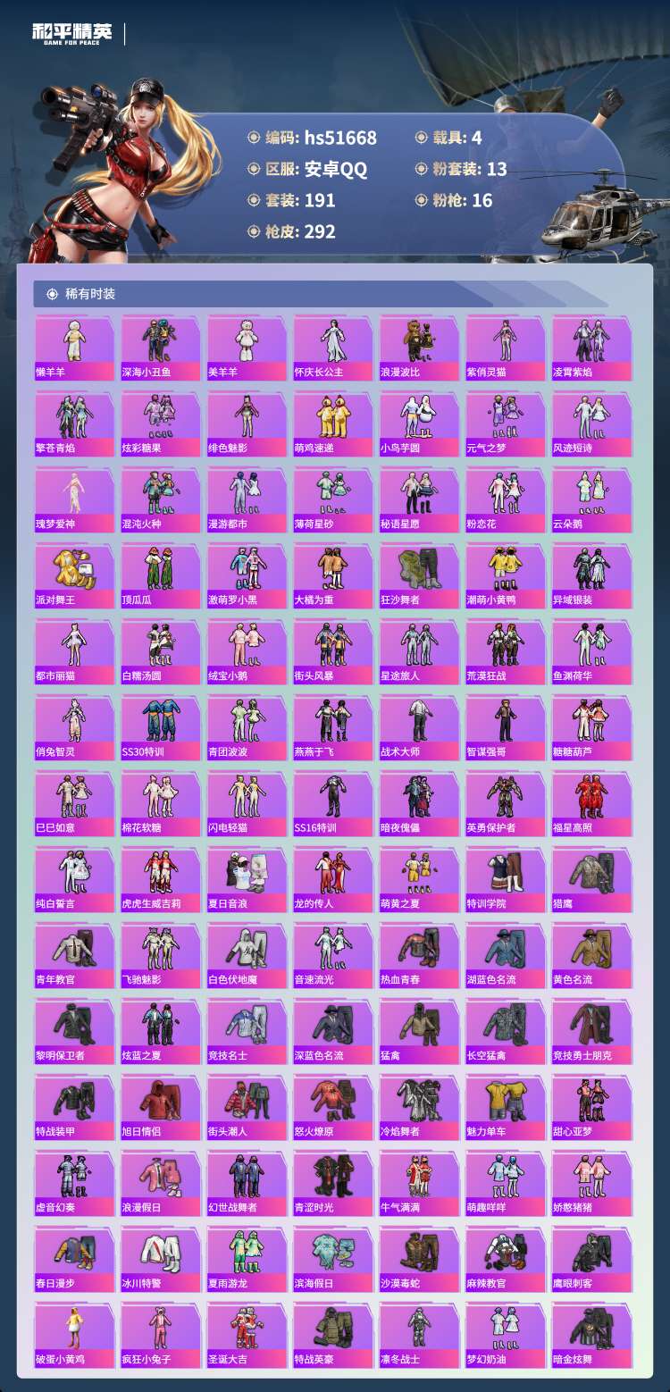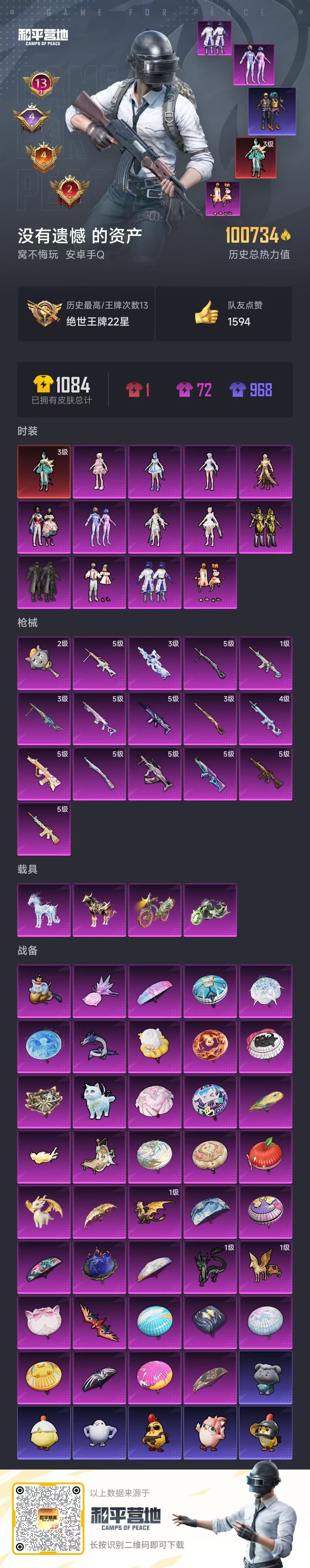 安卓手Q-13王牌印记-1红装-13粉装-16特效枪-4载具-100734热力值-1