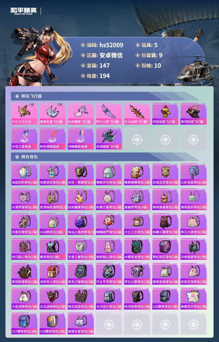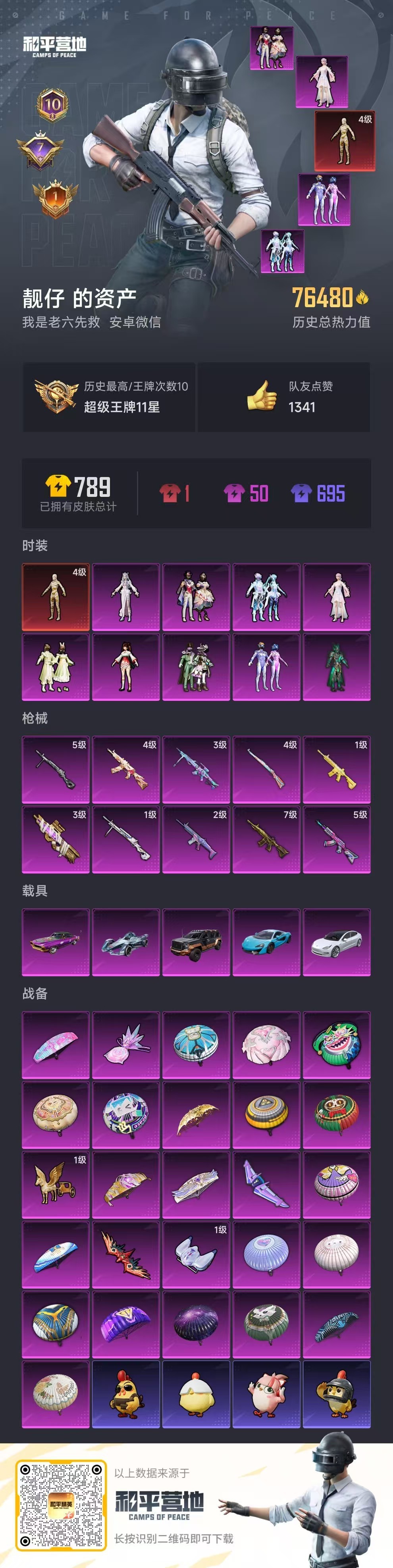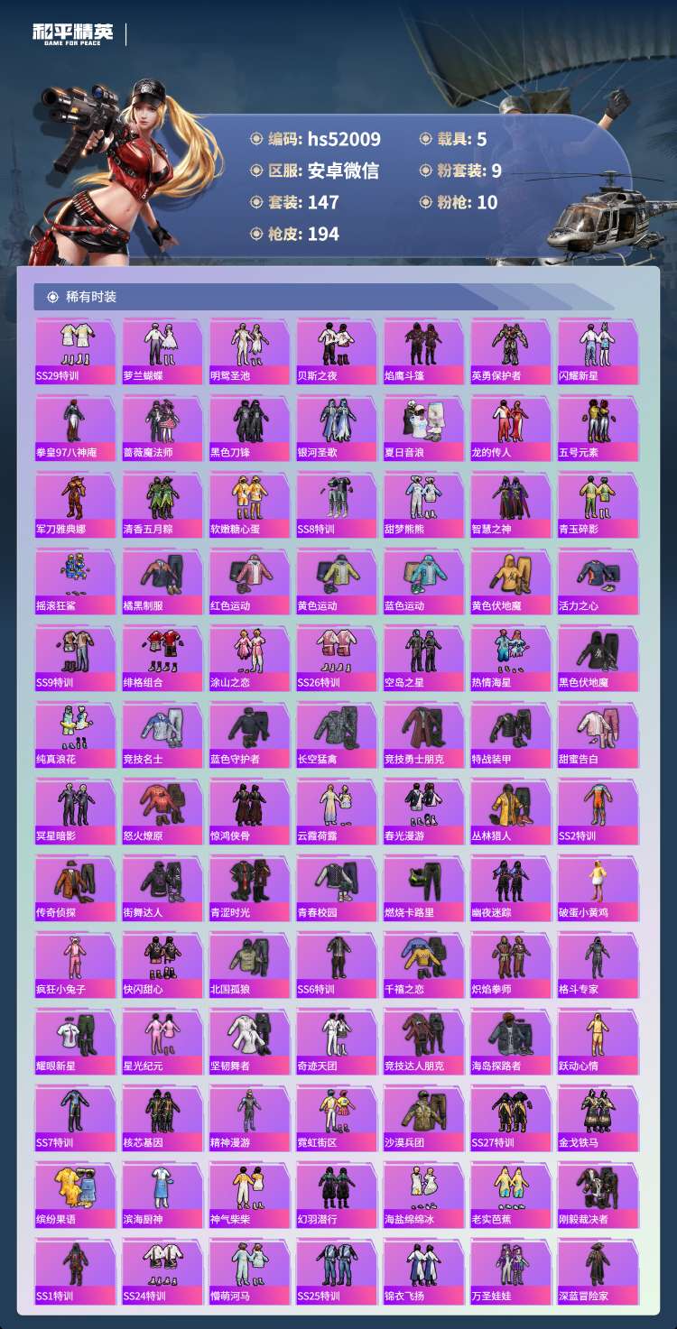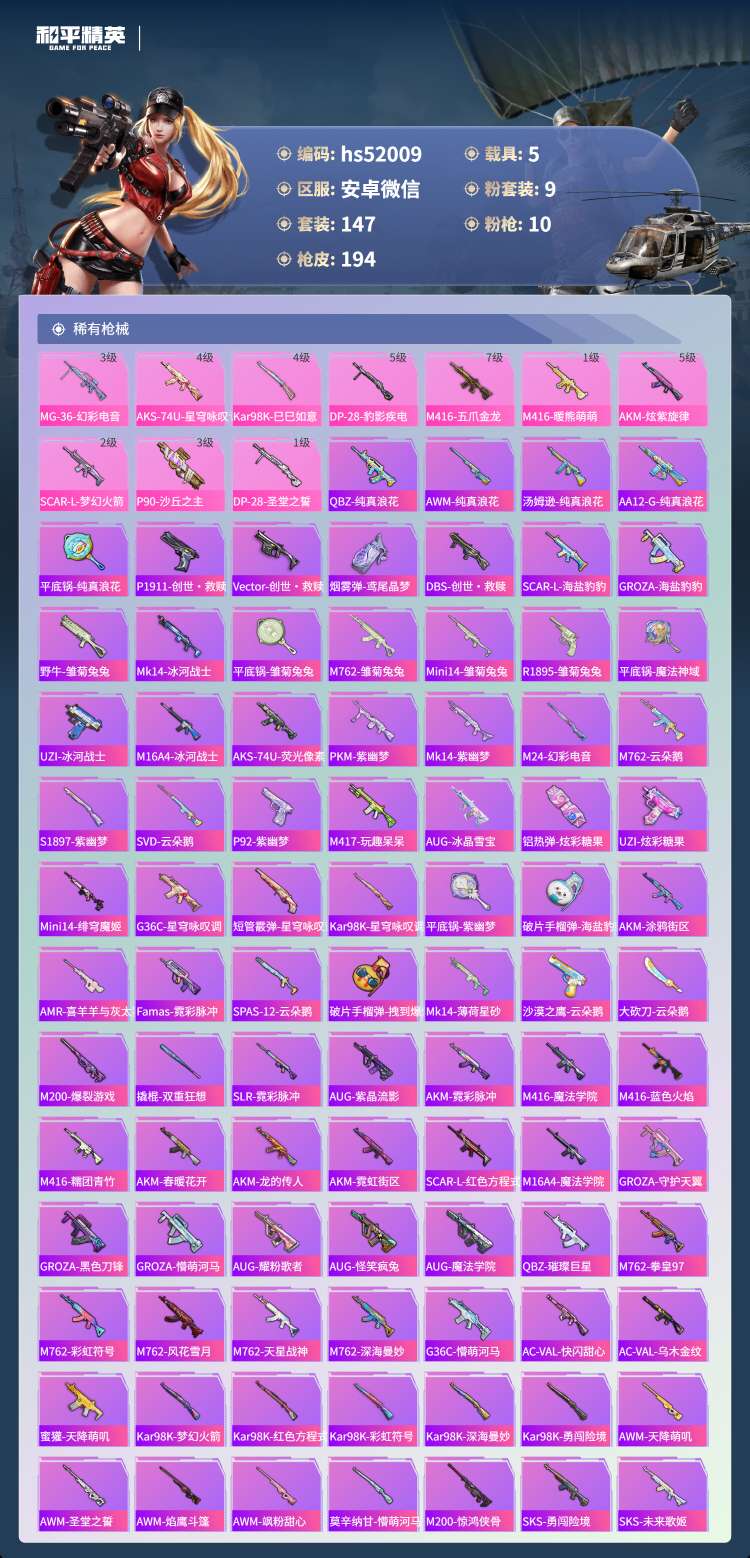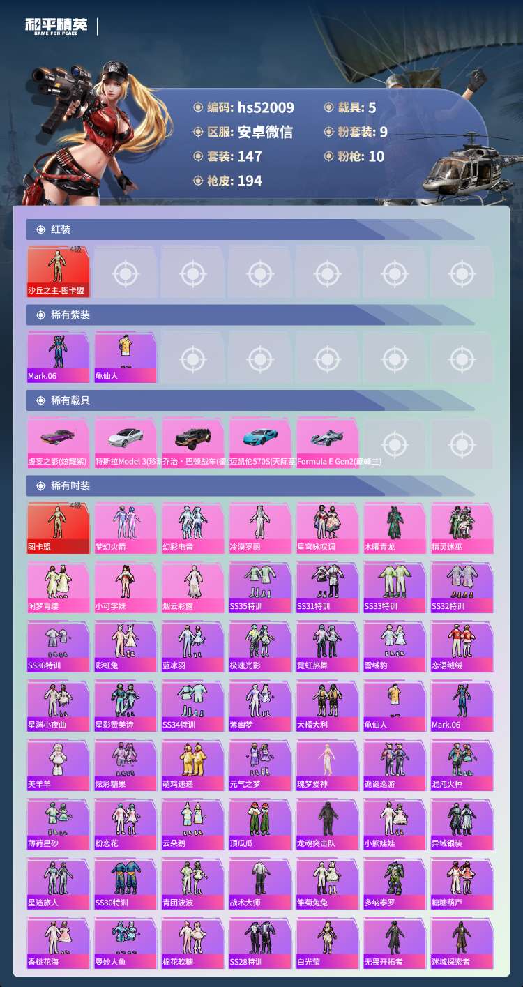 安卓v-10王牌印记-1红装-9粉装-10特效枪-5载具-76480热力值-147