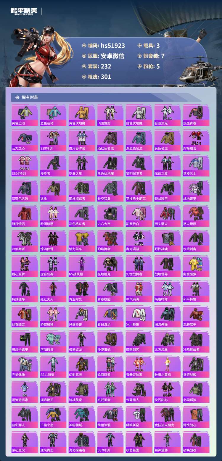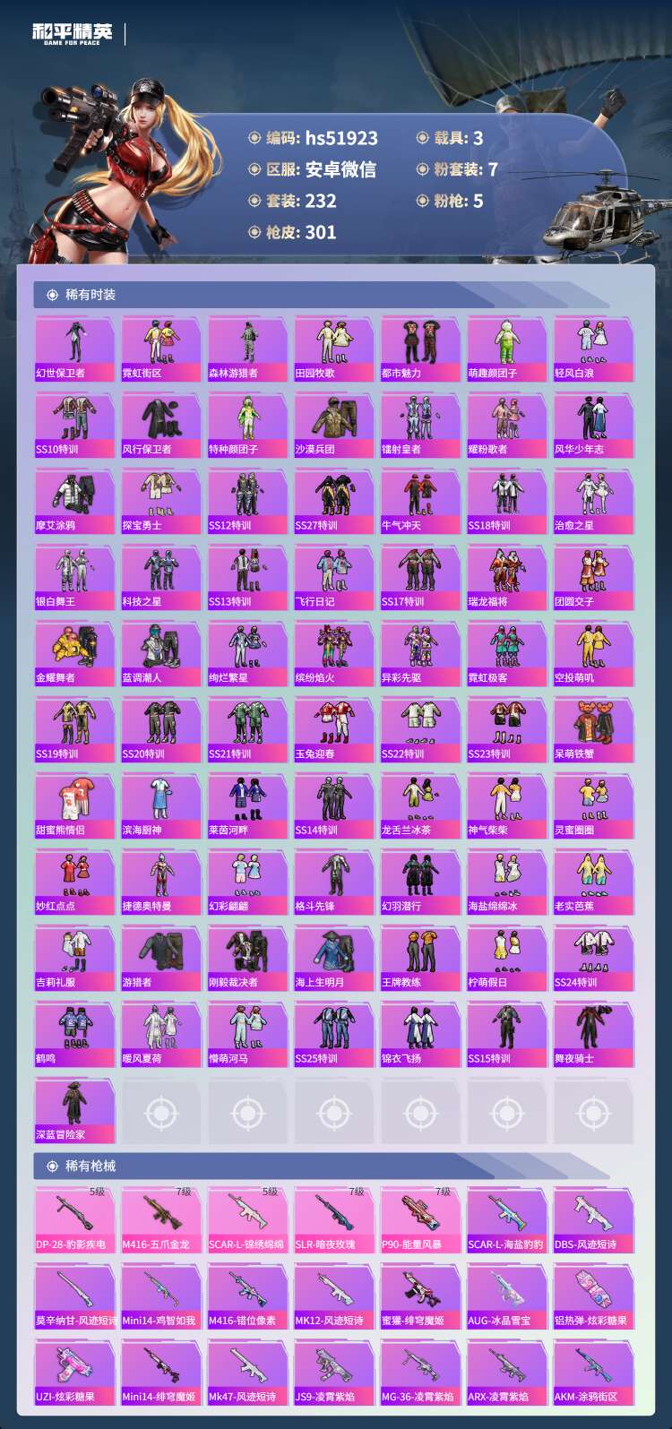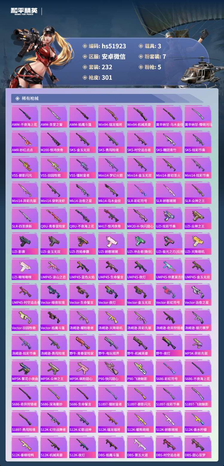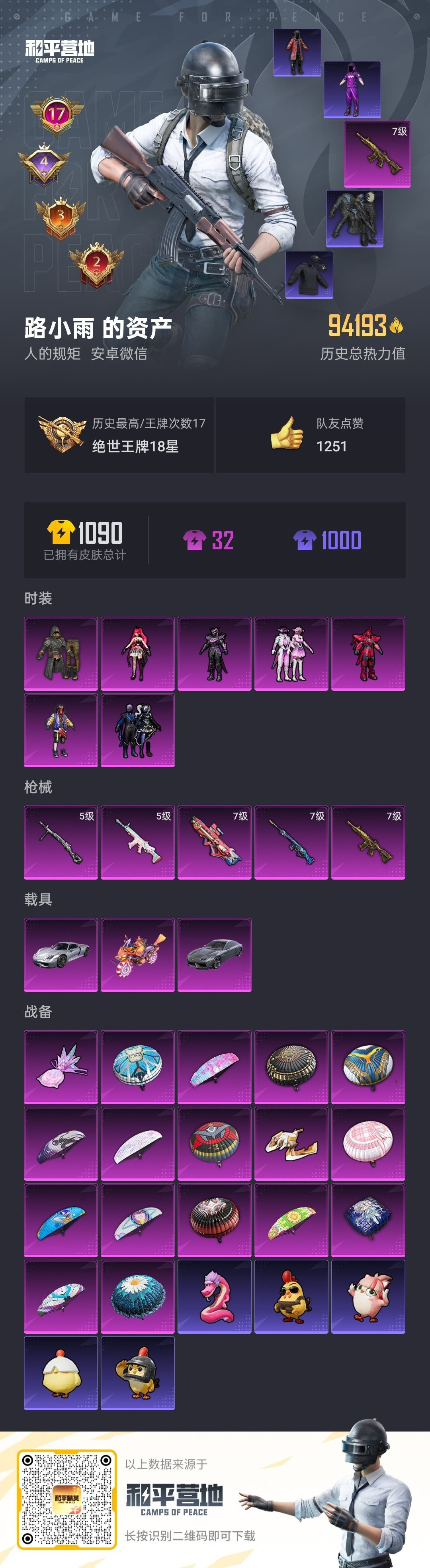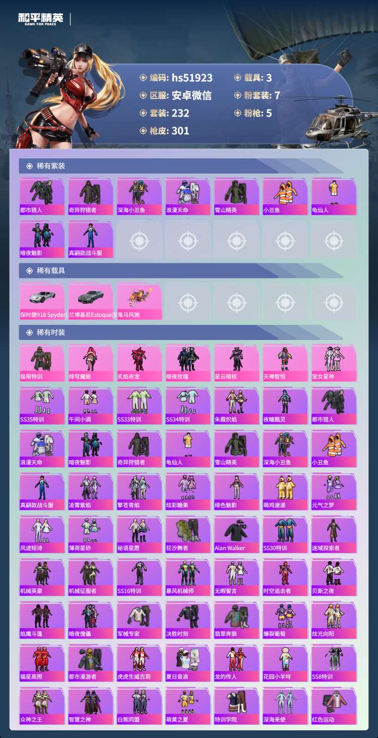 安卓微-17王牌印记-7粉装-5特效枪-3载具-94193热力值-232套装-30