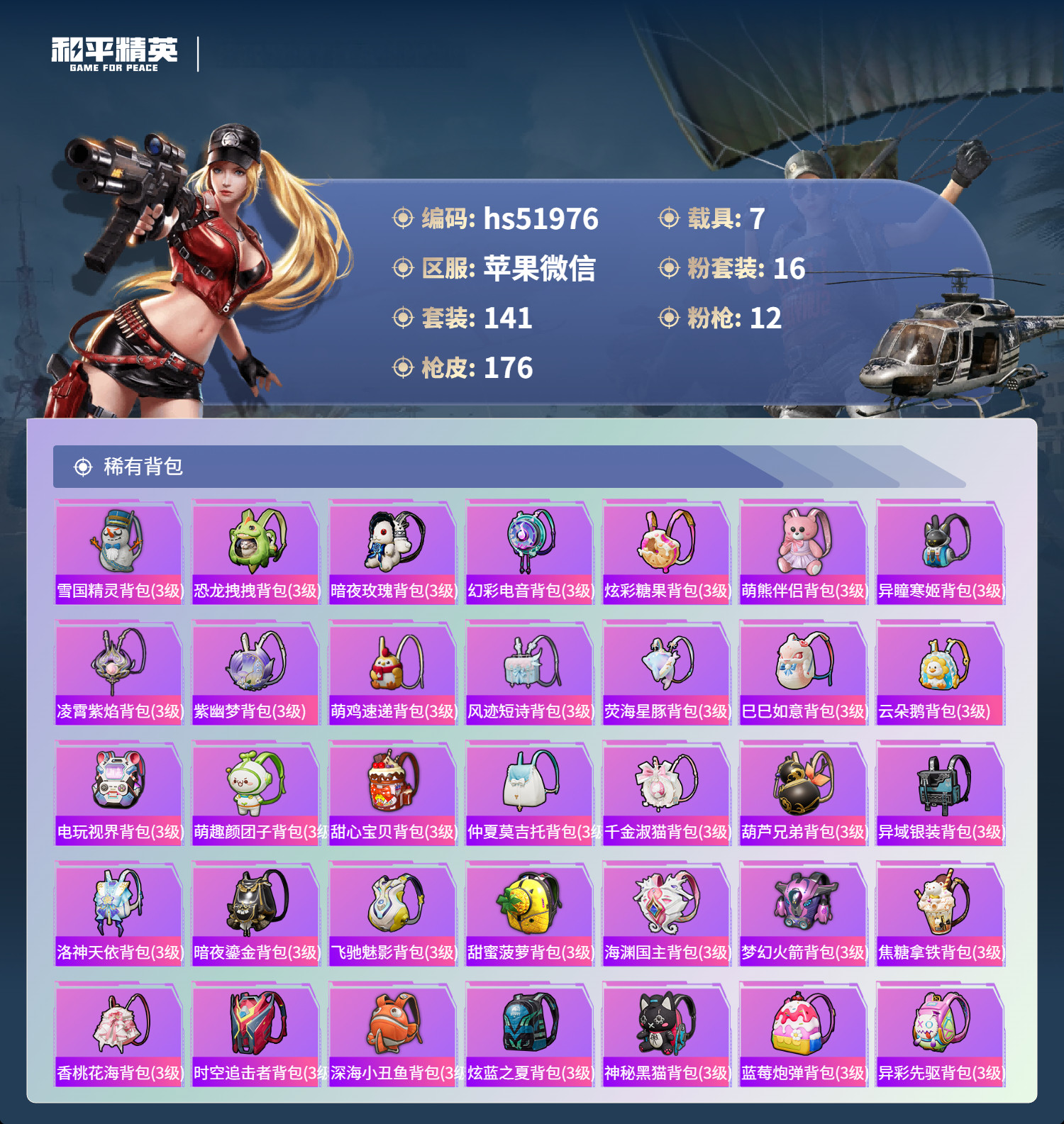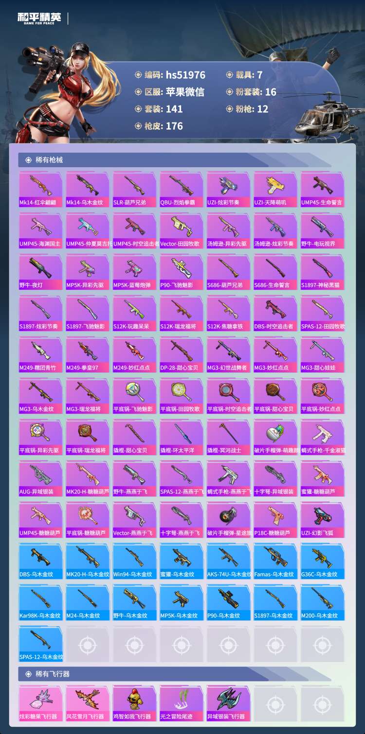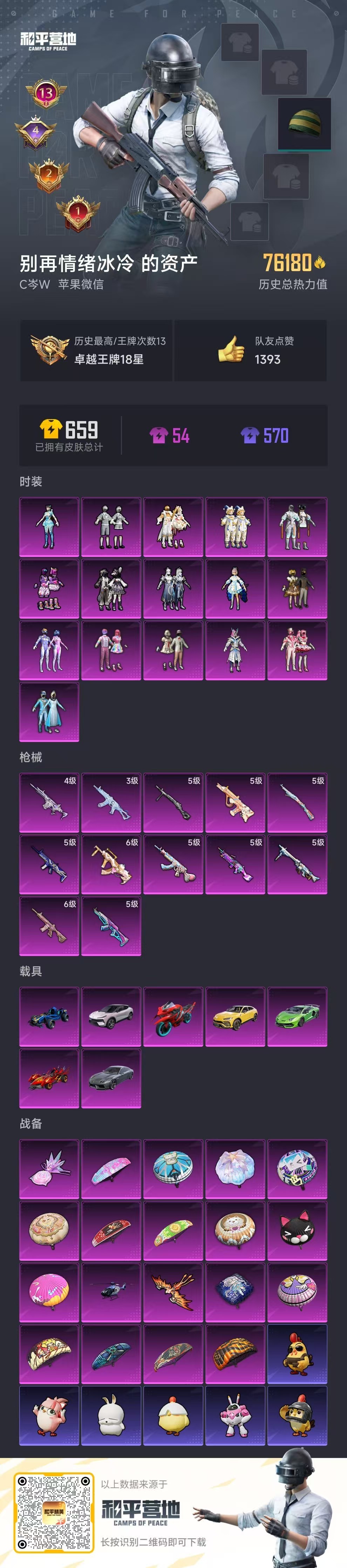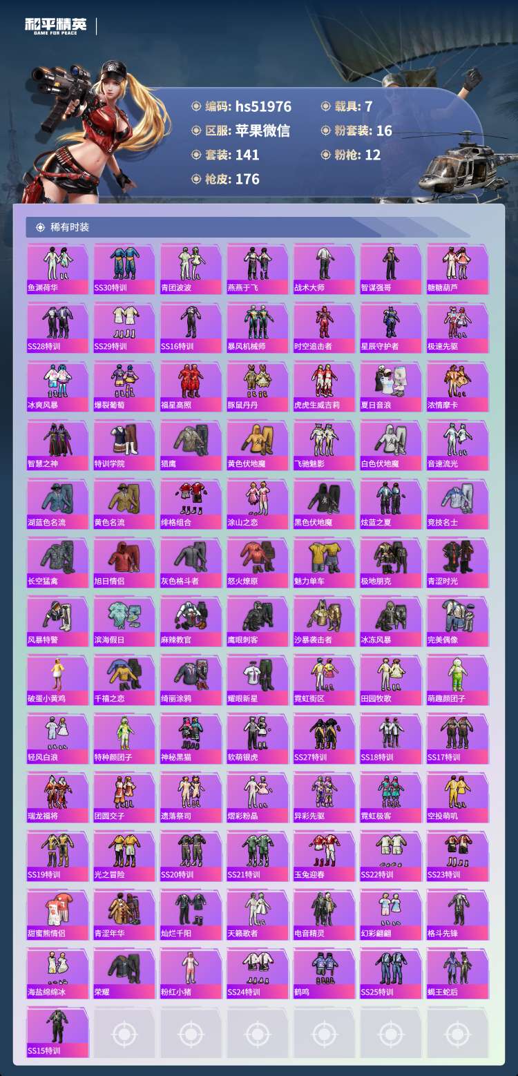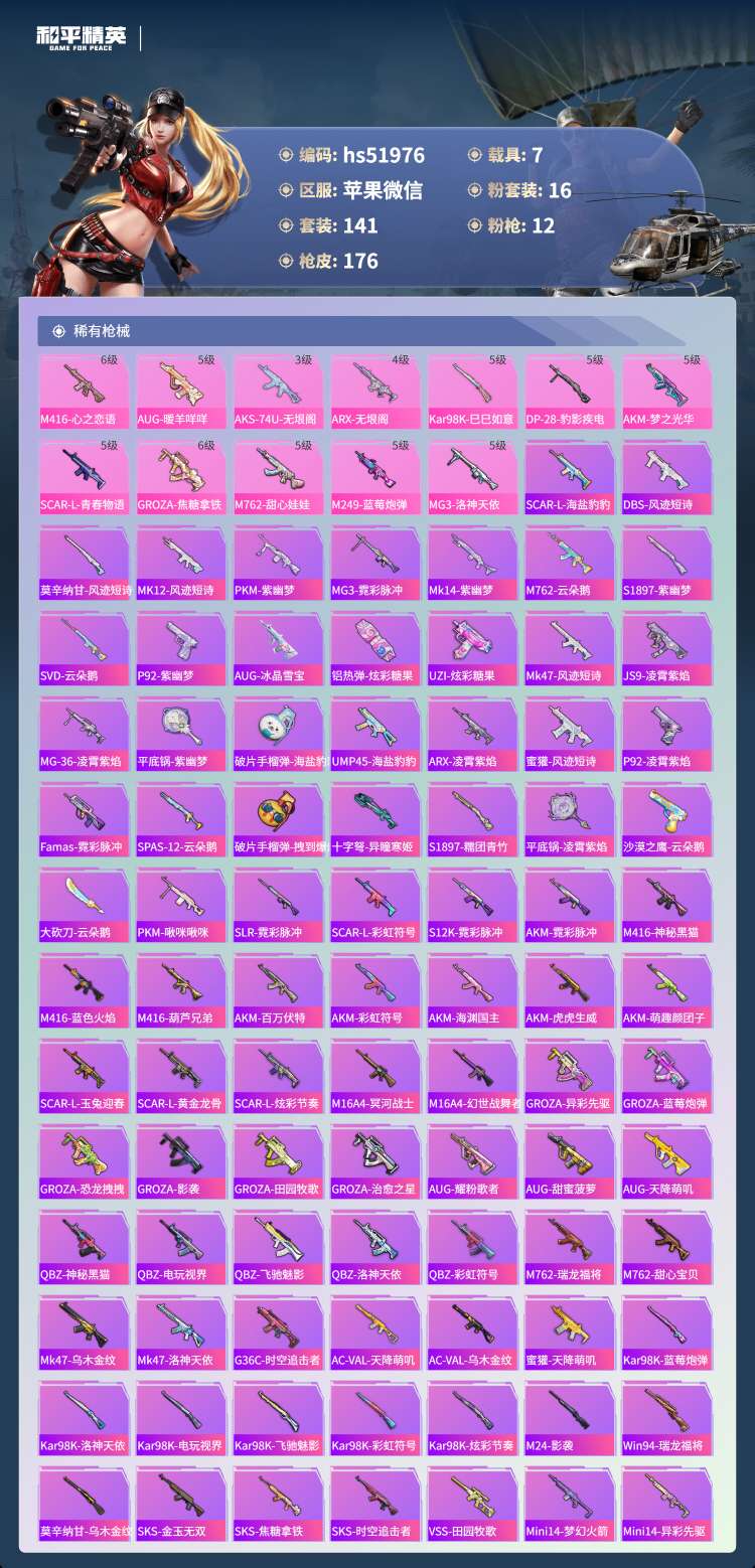 苹果v-13王牌印记-16粉装-12特效枪-7载具-76180热力值-141套装-
