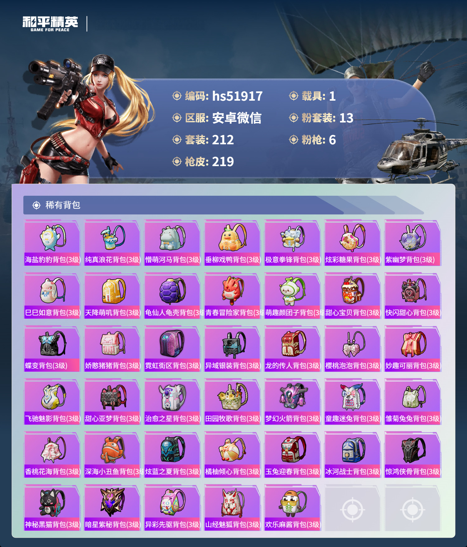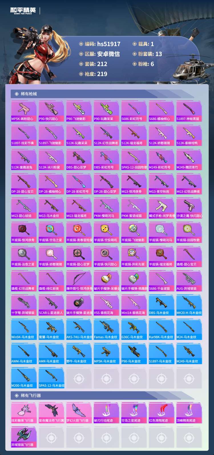 安卓v-22王牌印记-13粉装-6特效枪-1载具-79193热力值-212套装-2