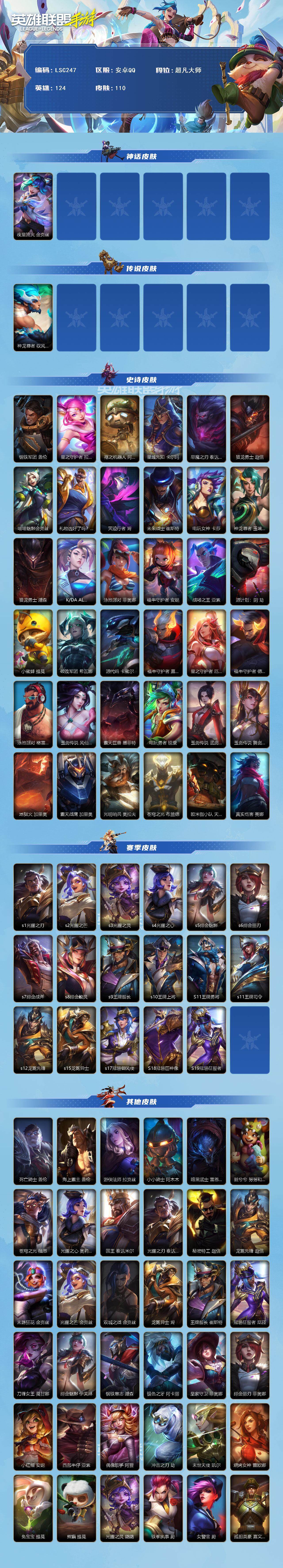 【LSC247】124英雄/110皮肤/超凡大师/夜星流火 金克丝/神龙尊者 驭风啸龙 易/钢铁军团 盖伦/星之守护者 拉克丝/殇之机器人 阿木木/星域先知 卡尔玛/恶魔之刃 泰达米尔/猎龙勇士 赵信/喵喵魅影金克丝/礼物选好了吗? 布隆/灭迹行者 烬/未来战士 崔斯特/电玩女神 卡莎/神龙尊者 玉境灵龙 卡莎/猎龙勇士 潘森/K/DA ALL OUT 阿卡丽/泳池派对 菲奥娜/福牛守护者 安妮/战场之王 亚索/源计划:阴 劫/小蜜蜂 提莫/破败军团 希瓦娜/源代码 卡蜜尔/福牛守护者 嘉文四世