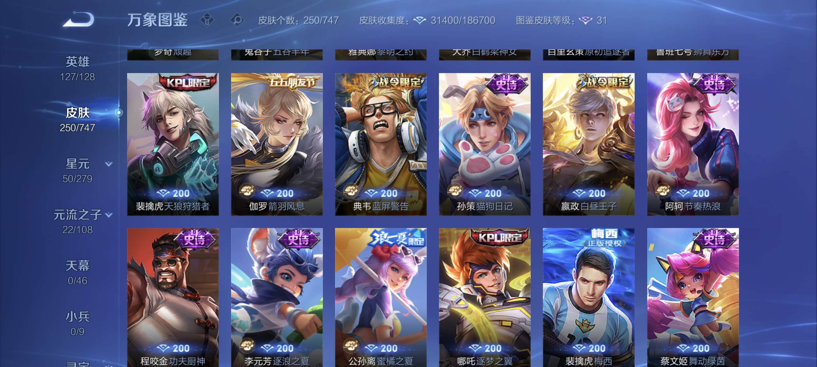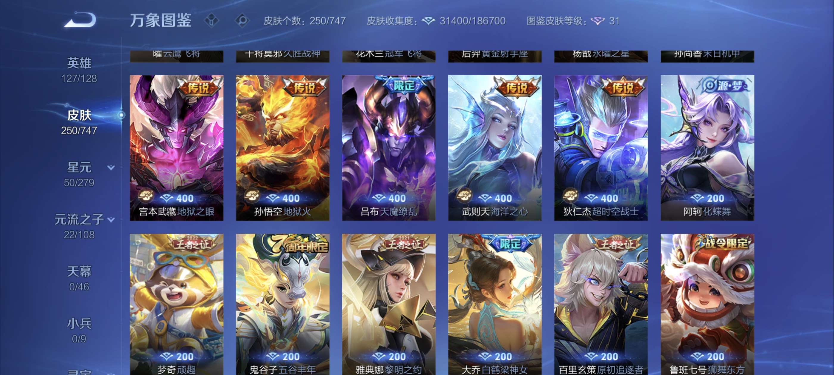 号花了 1.5 个左右,现工作没时间玩,很久没玩, V9 掉到 V2, 127英雄250皮肤
