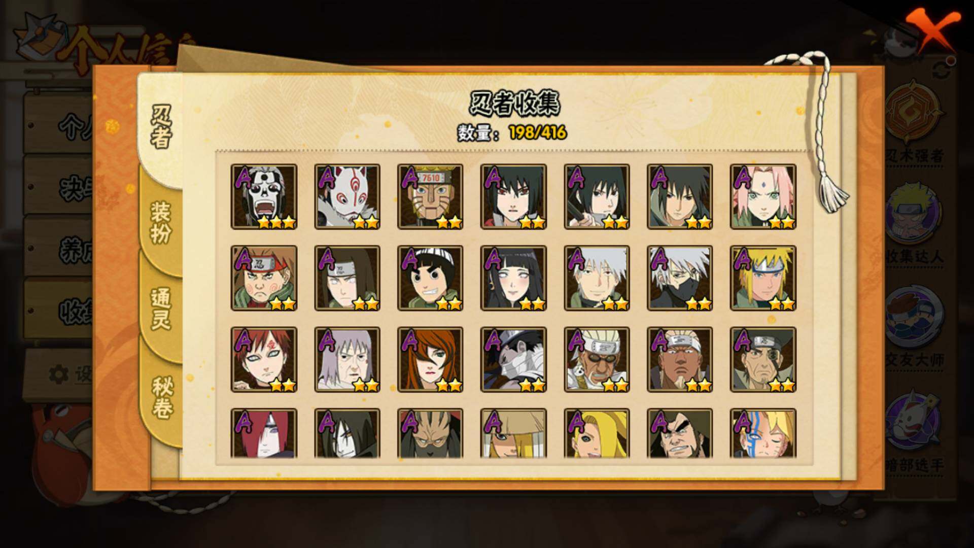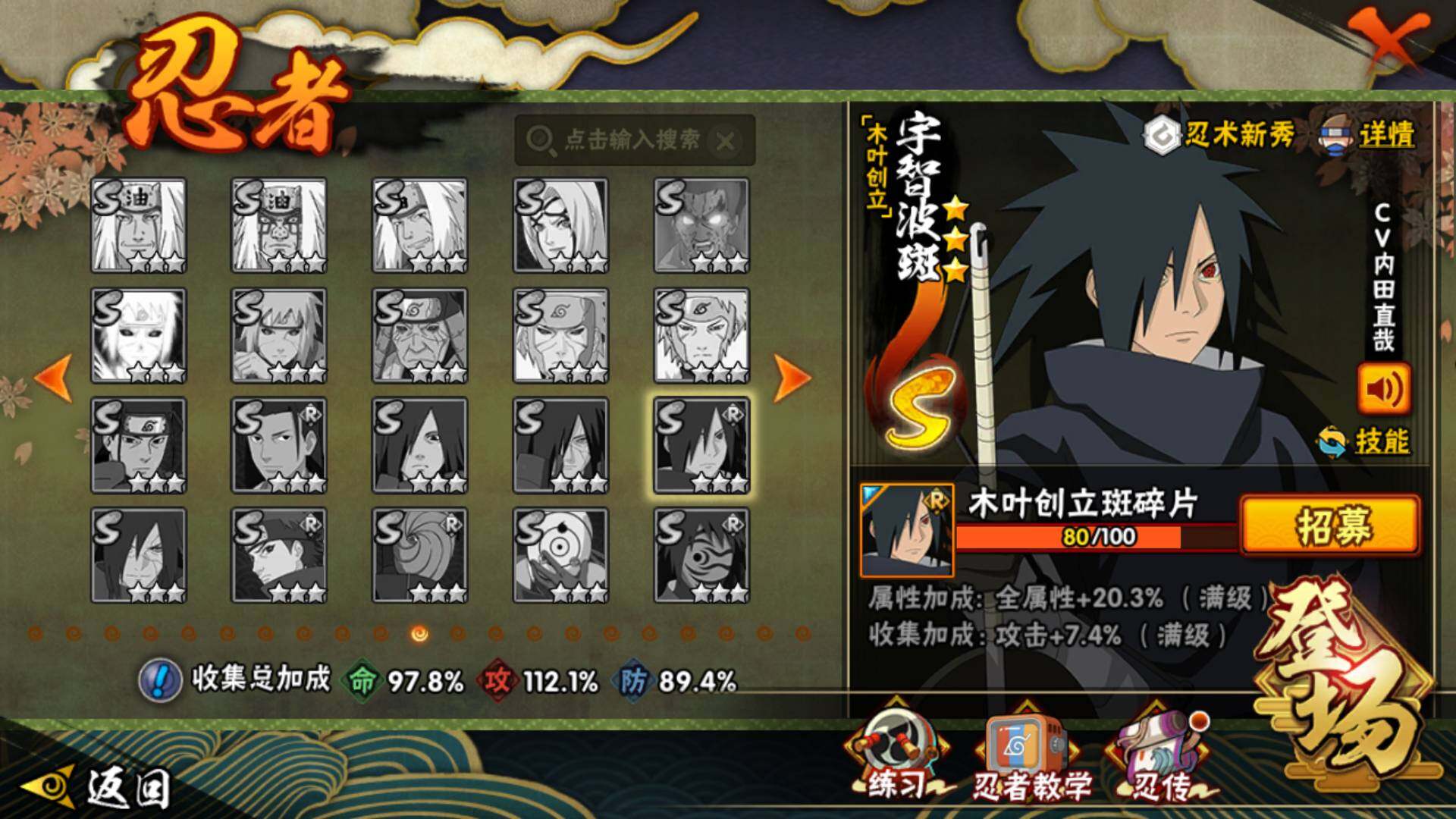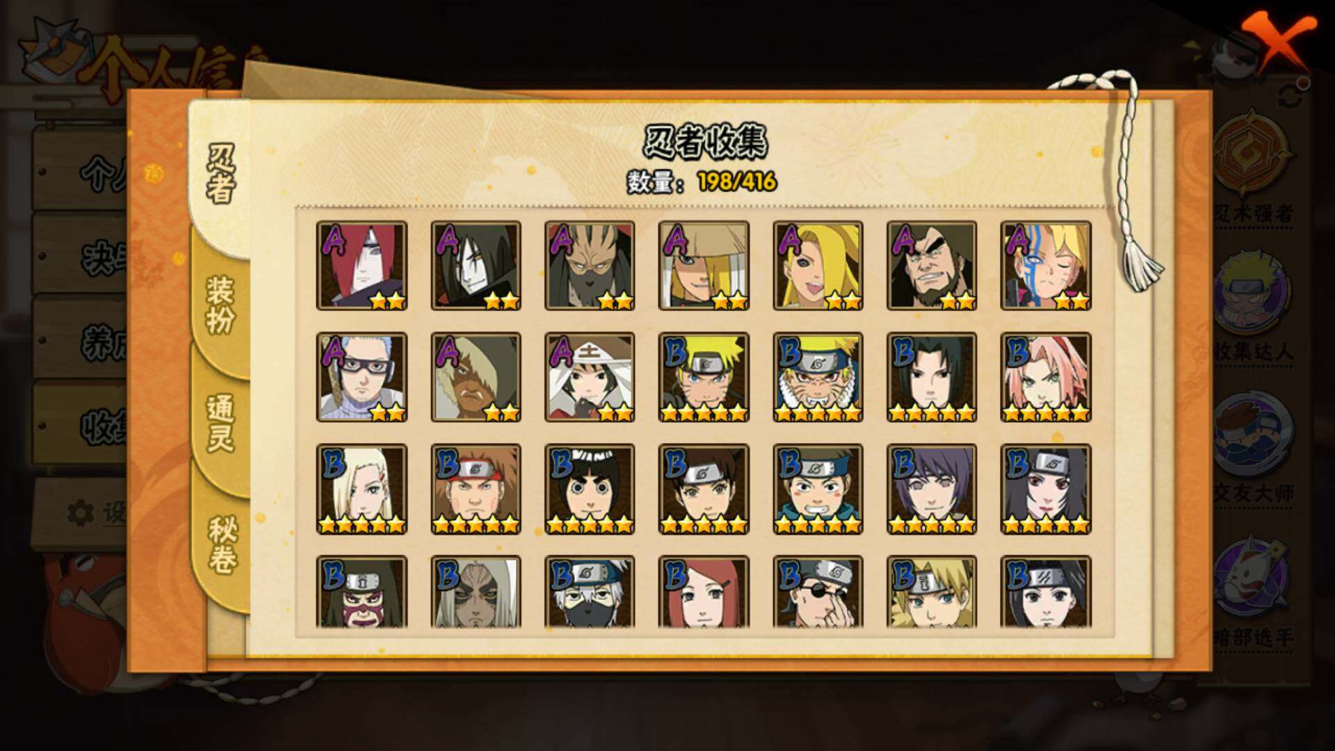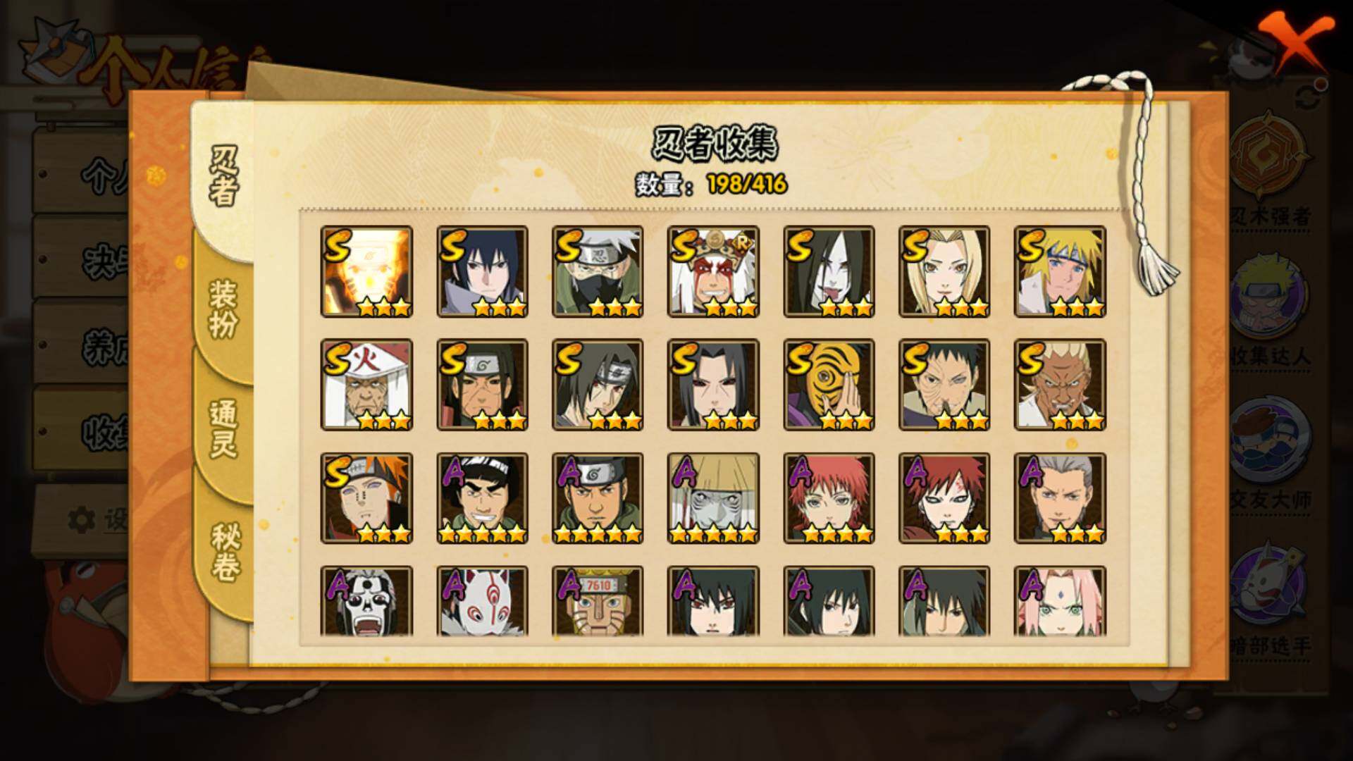 【S级忍者】:千手柱间「秽土转生」(3星),宇智波鼬「秽土转生」(3星),宇智波带土「忍界大战」(3星),艾「忍界大战」(3星),宇智波鼬「须佐能乎」(3星),旗木卡卡西「须佐能乎」(3星),自来也「舞之豪杰」(3星),大