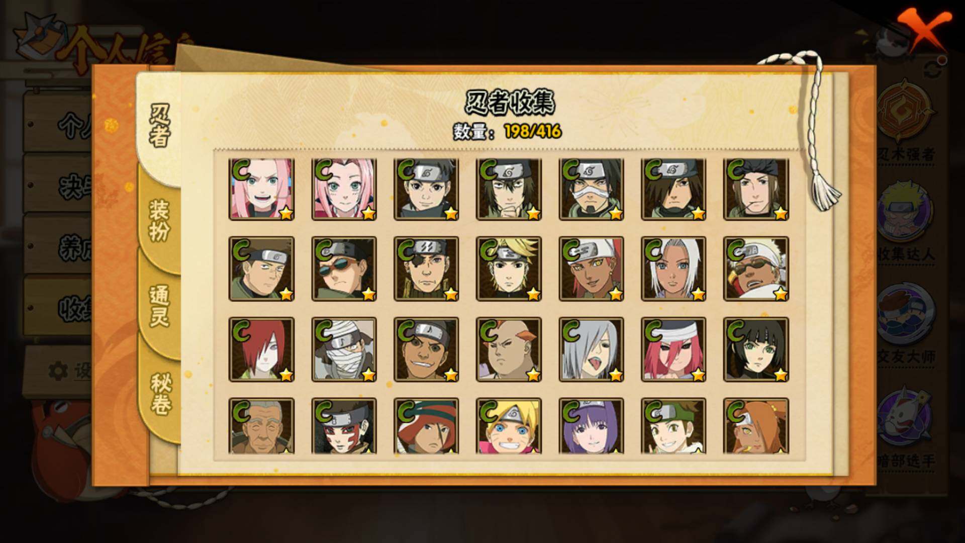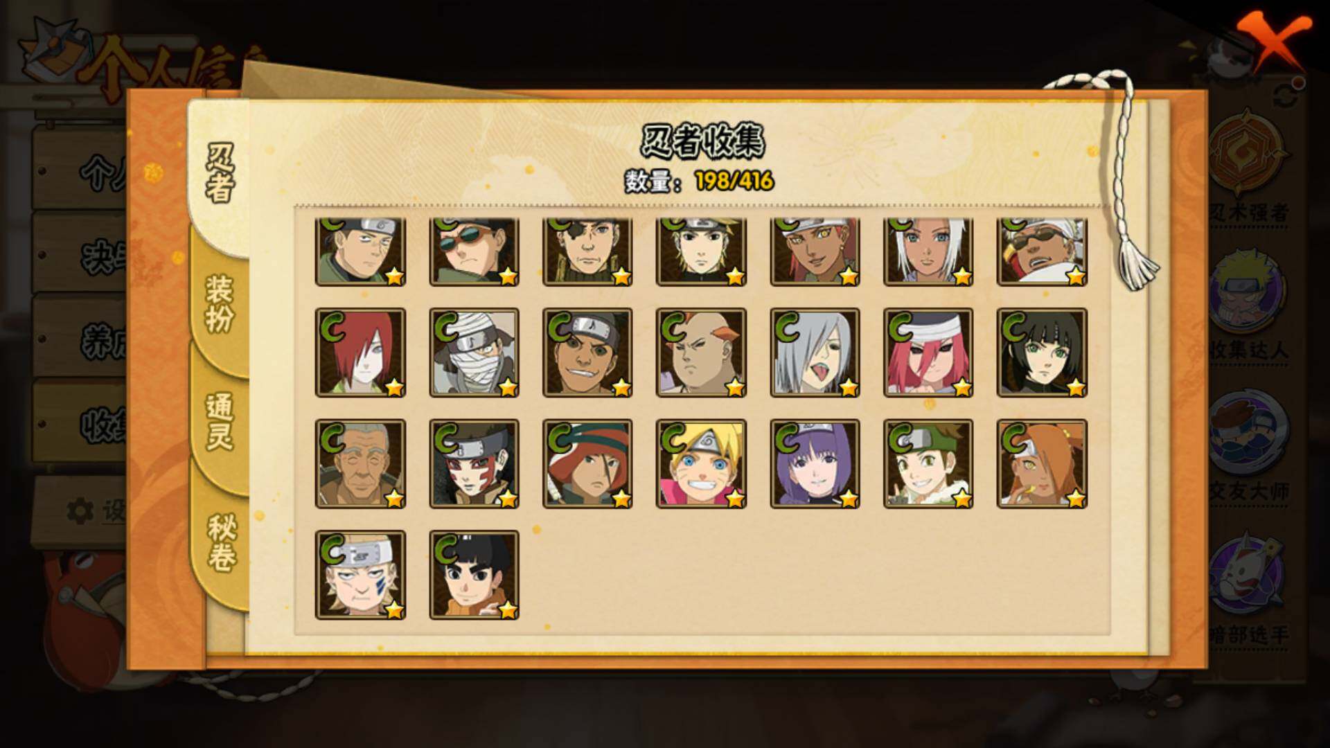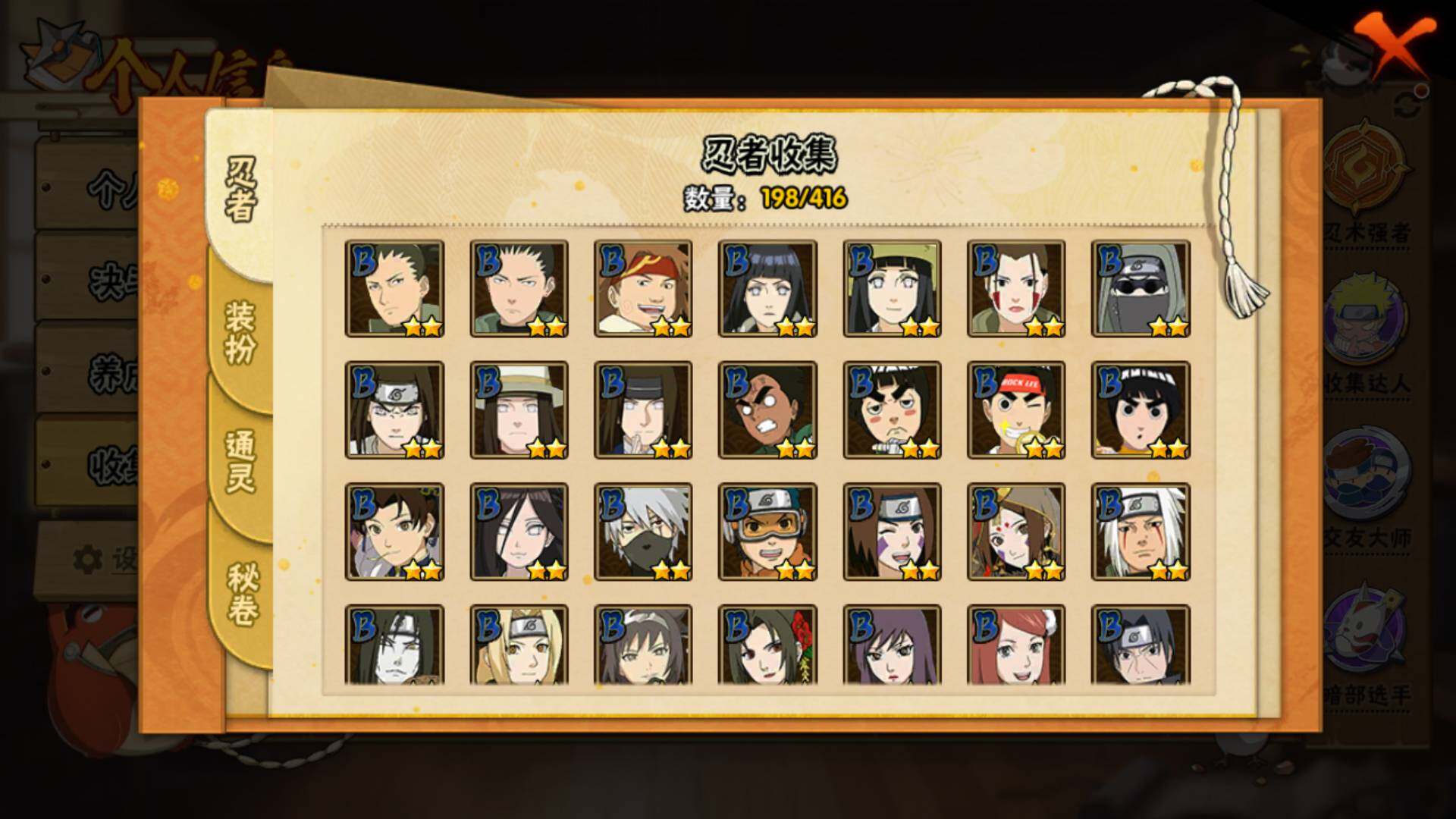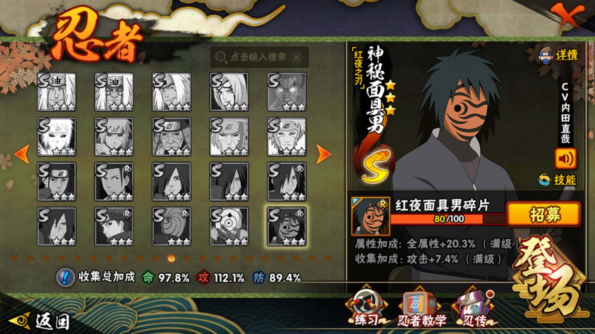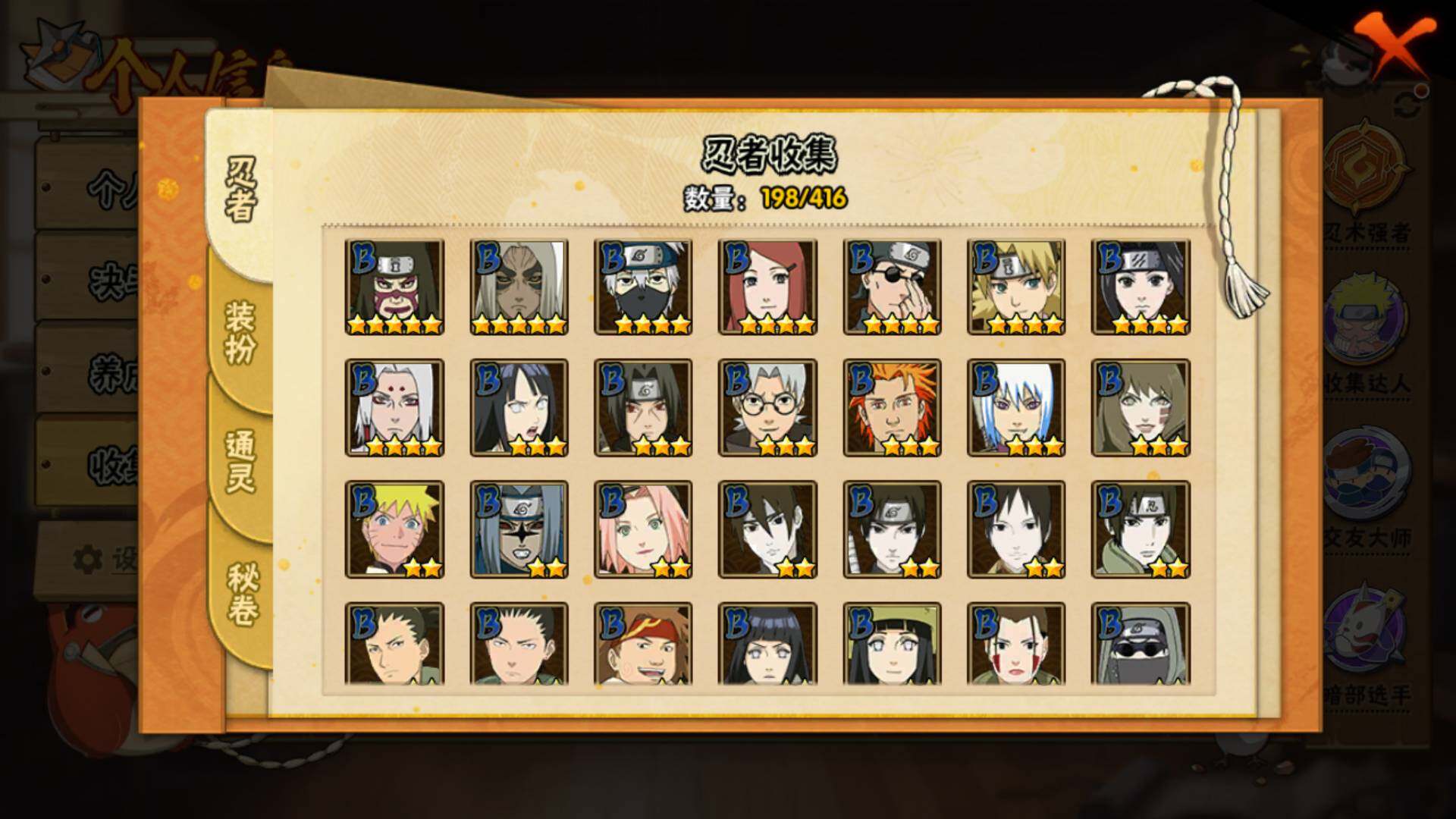 【S级忍者】:千手柱间「秽土转生」(3星),宇智波鼬「秽土转生」(3星),宇智波带土「忍界大战」(3星),艾「忍界大战」(3星),宇智波鼬「须佐能乎」(3星),旗木卡卡西「须佐能乎」(3星),自来也「舞之豪杰」(3星),大