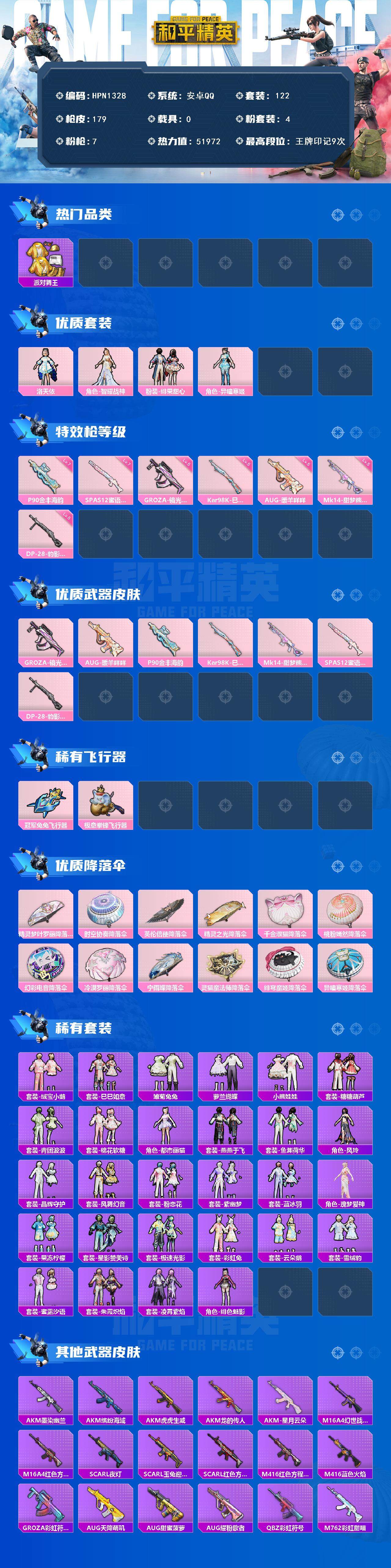 【HPN1328】122套装/枪械7/装备193/战备130/王牌印记9/热力值51972/五级GROZA-镜光银凌/五级AUG-暖羊咩咩/七级P90-金丰海韵/五级Kar98K-巳巳如意/五级Mk14-甜梦熊击/七级SPAS-12-蜜语绒猫/五级DP-28-豹影疾电/套装-浪漫天命/派对舞王/洛天依/角色-智耀战神/粉装-绯果甜心/角色-异瞳寒姬/GROZA-镜光银凌/AUG-暖羊咩咩/P90-金丰海韵/Kar98K-巳巳如意/Mk14-甜梦熊击/SPAS-12-蜜语绒猫/DP-28-豹影疾电