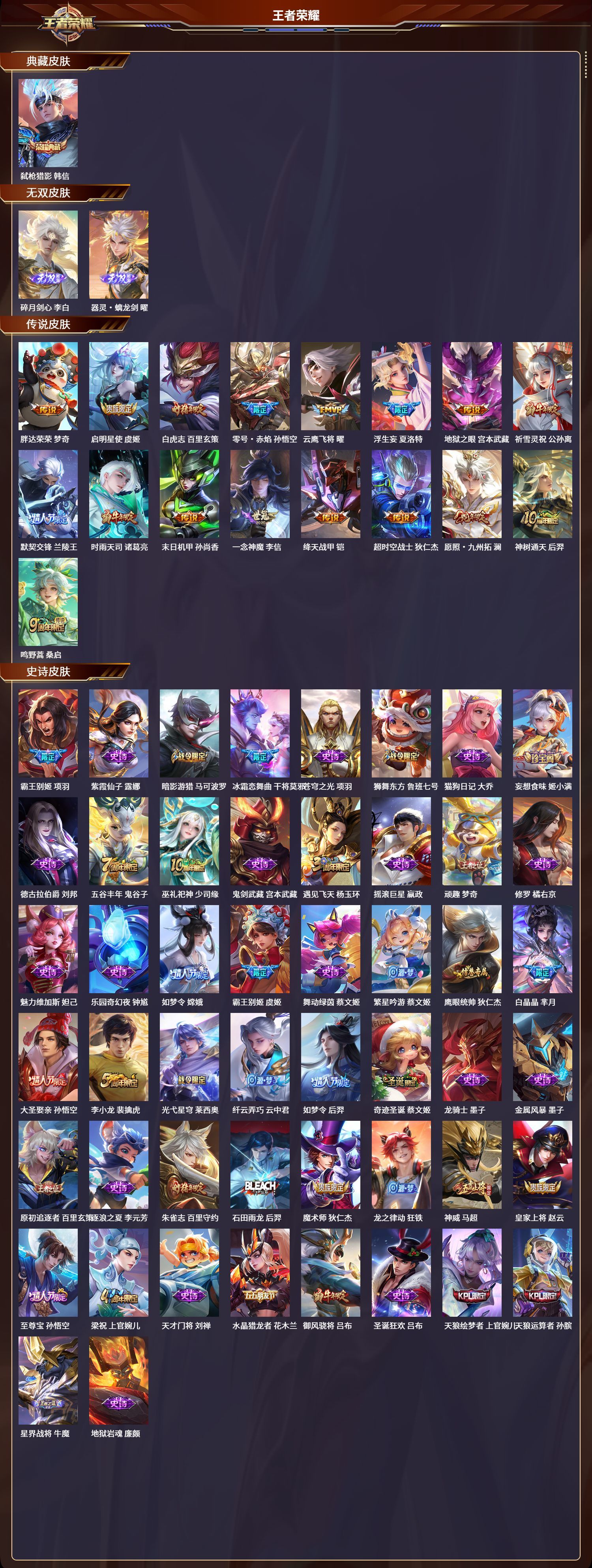苹果QQ/荣耀王者/262皮肤/126英雄/1典藏/0珍品无双/2无双/0珍品传说/17传说/67史