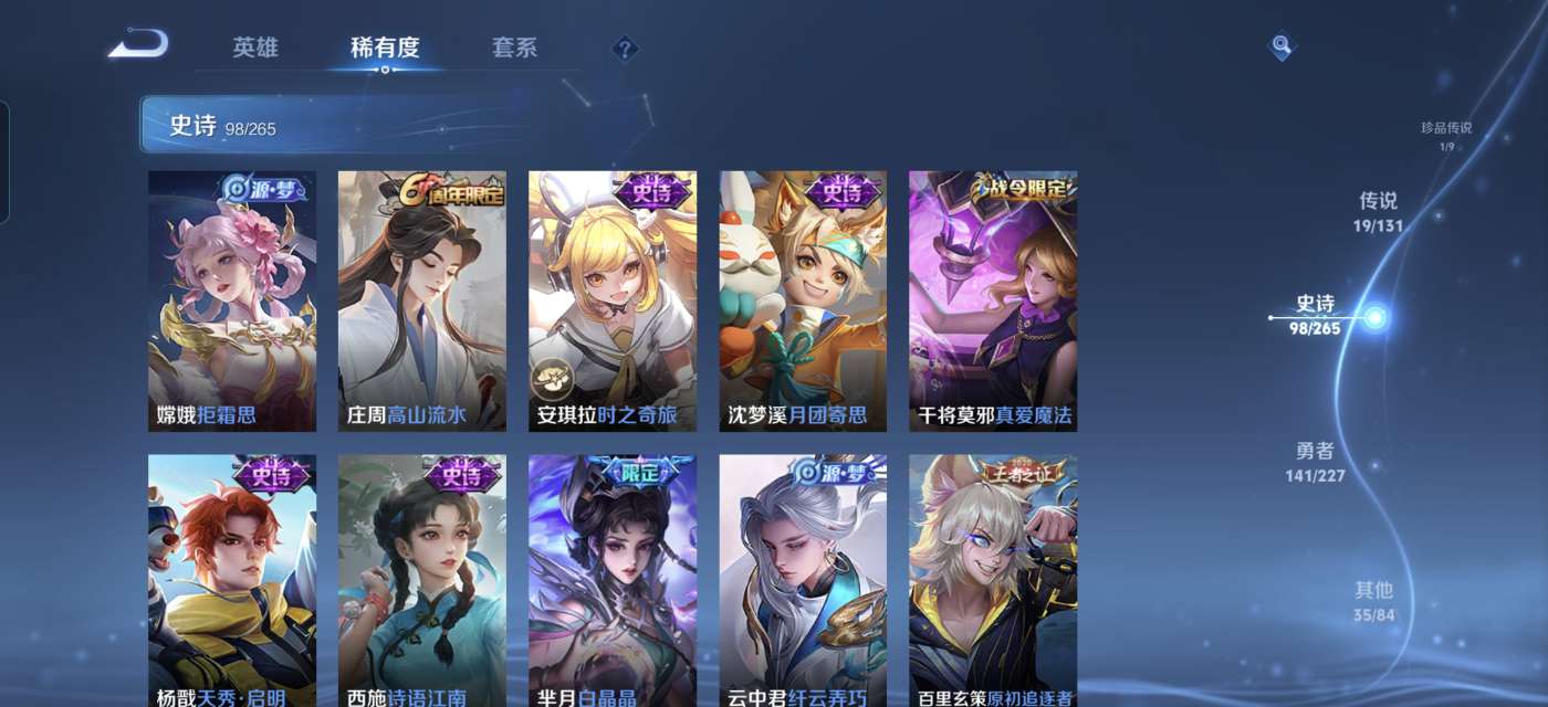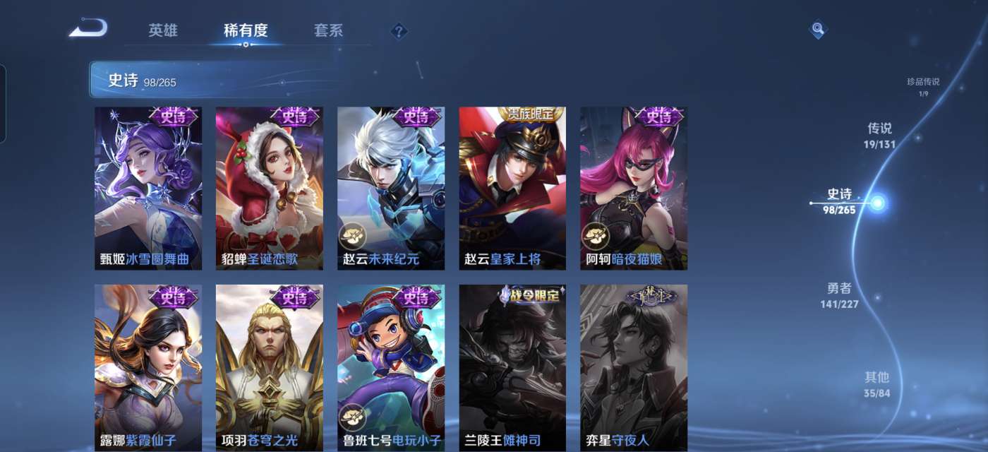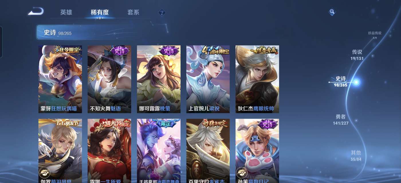 常年霸榜万战,巅峰赛2000+,王者百星max,中路每个英雄都有皮肤,有武则天,还有一些其他好看皮肤