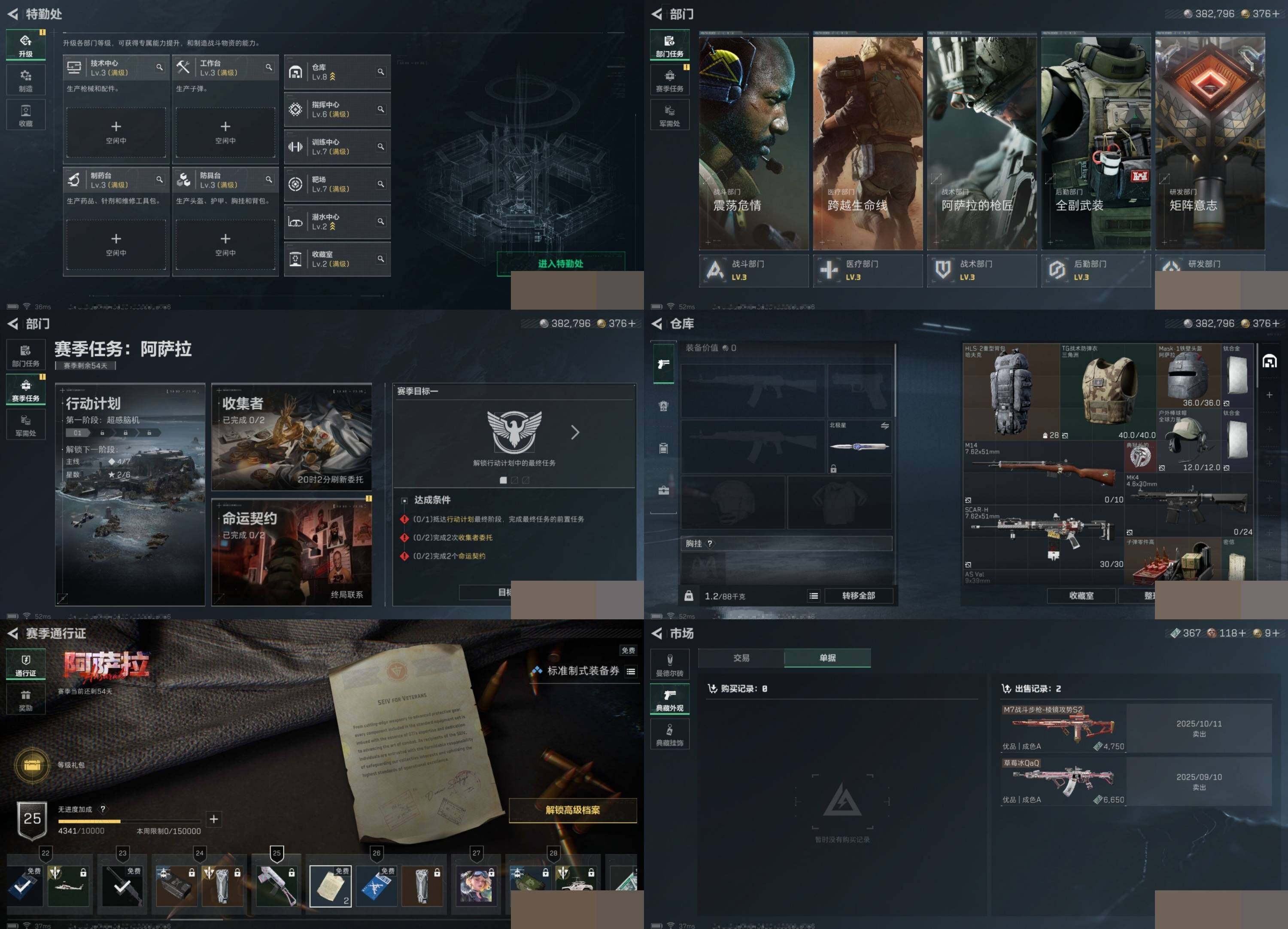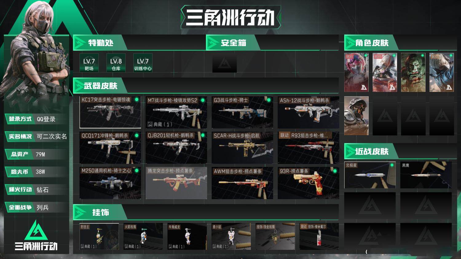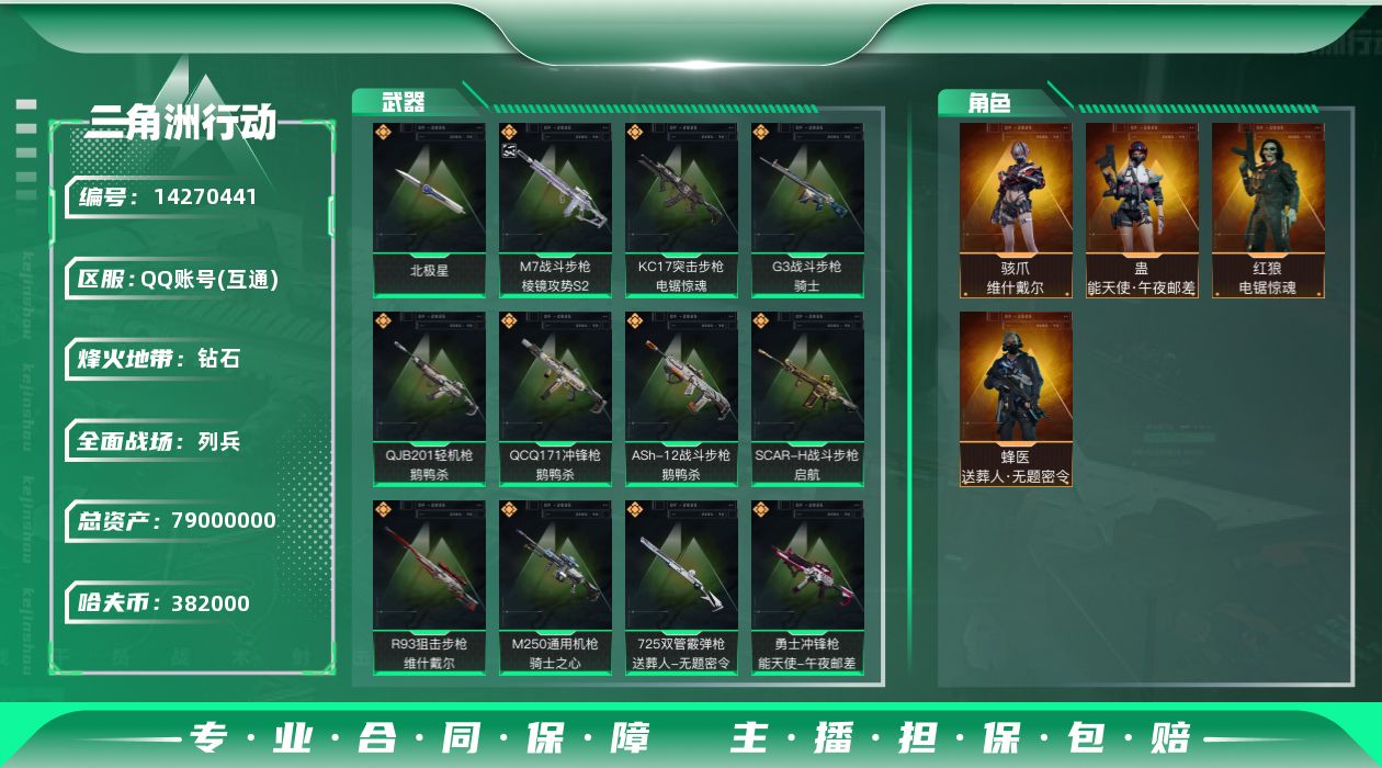 红狼电锯+北极星+蛊午夜邮差+骇爪维什戴尔+送葬人+体力负重双7+12张本赛季3*3体验卷+M7棱镜优品 烽火地带段位: 钻石 全面战场段位: 列兵 总资产: 79000000 哈夫币: 382000 sjs5600 传说武器皮肤: 近战-北极星,K437突击步枪-北极星,QCQ171冲锋枪-北极星,725双管霰弹枪-送葬人-无题密令,M4A1突击步枪-阿米娅,CAR-15突击步枪-阿米娅,AWM狙击步枪-捞点薯条,腾龙突击步枪-捞点薯条,93R-捞点薯条,AK-12突击步枪-特斯拉线圈,SR-