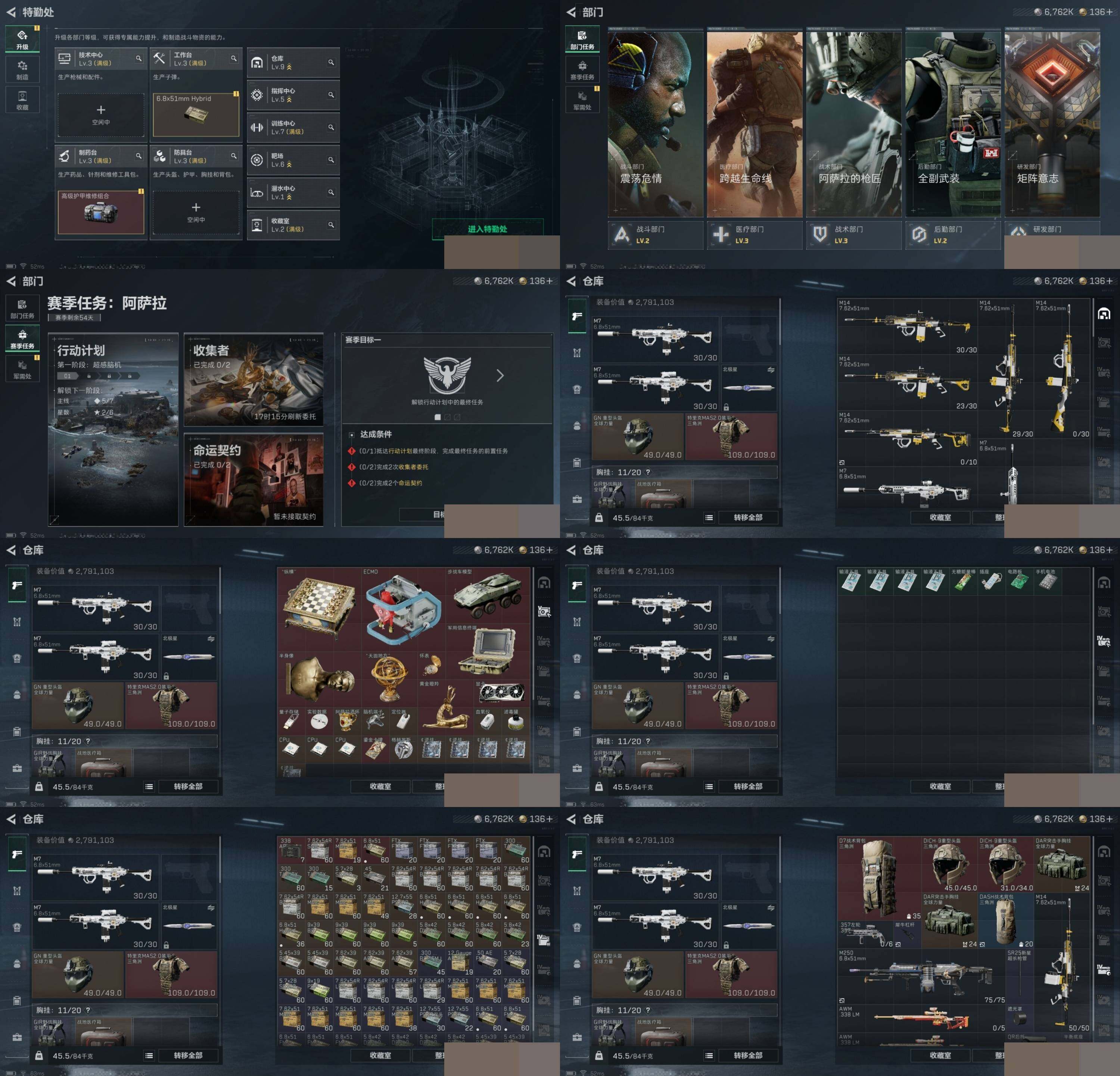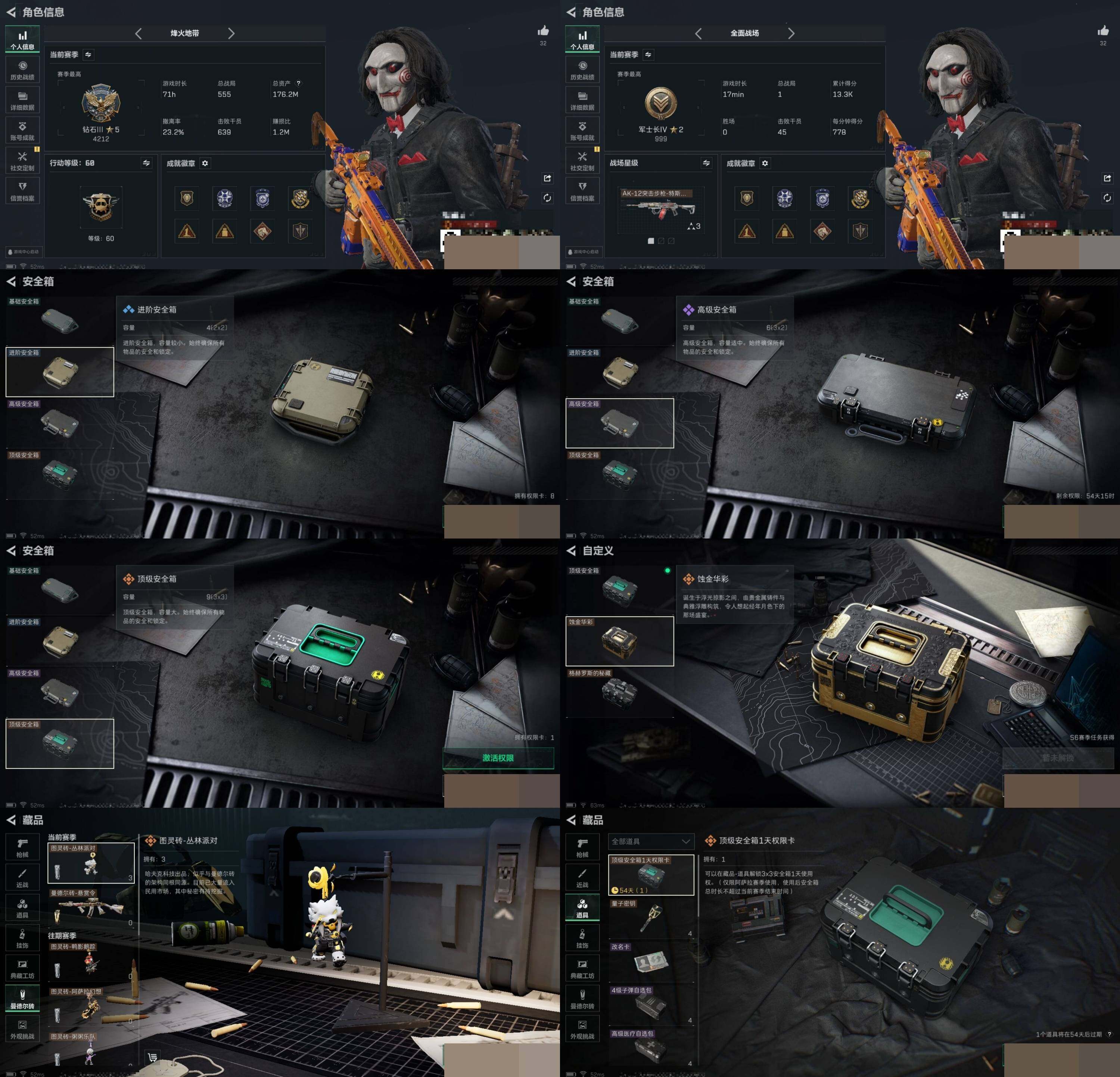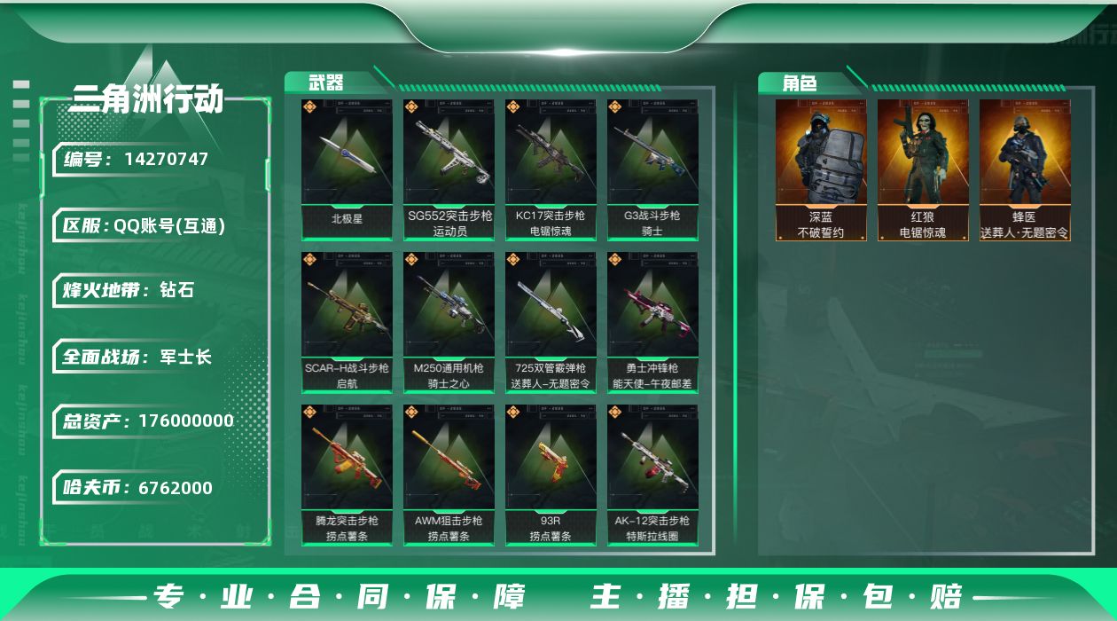 电锯惊魂红狼全套+北极星全套+捞点薯条全套 烽火地带段位: 钻石 全面战场段位: 军士长 总资产: 176000000 哈夫币: 6762000